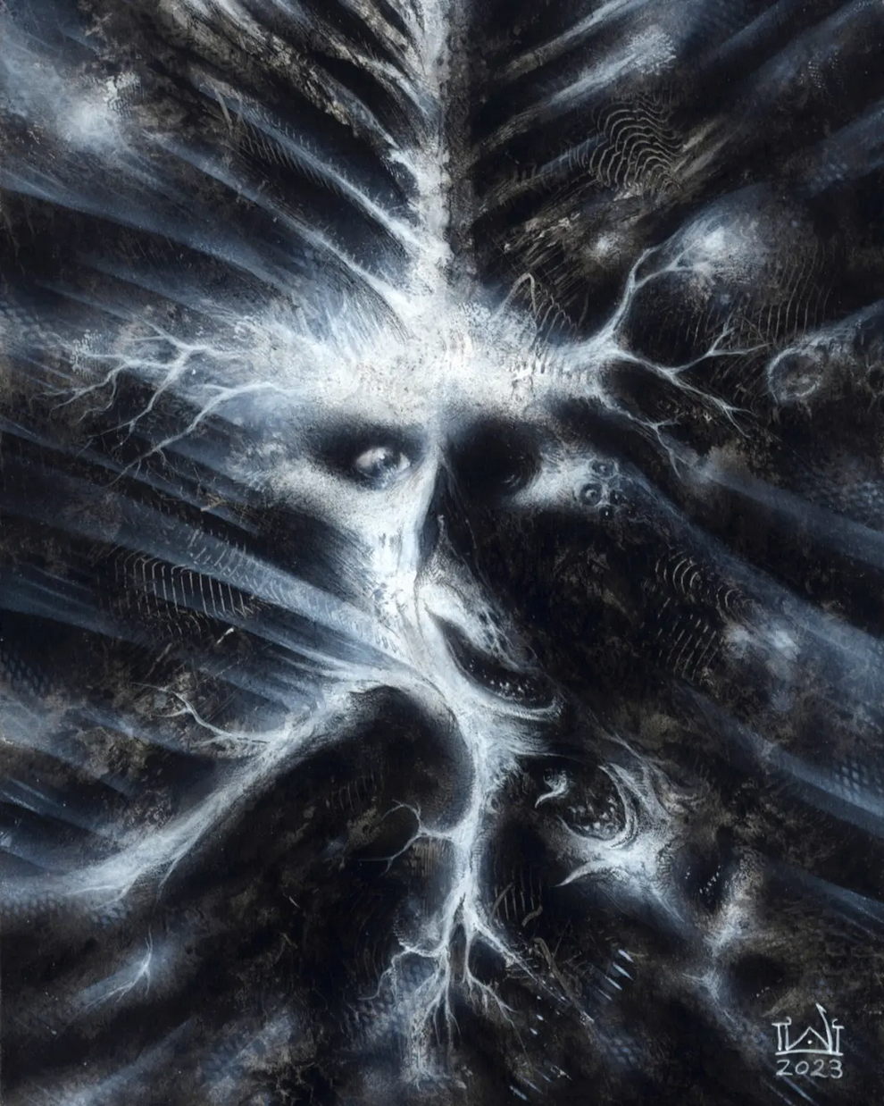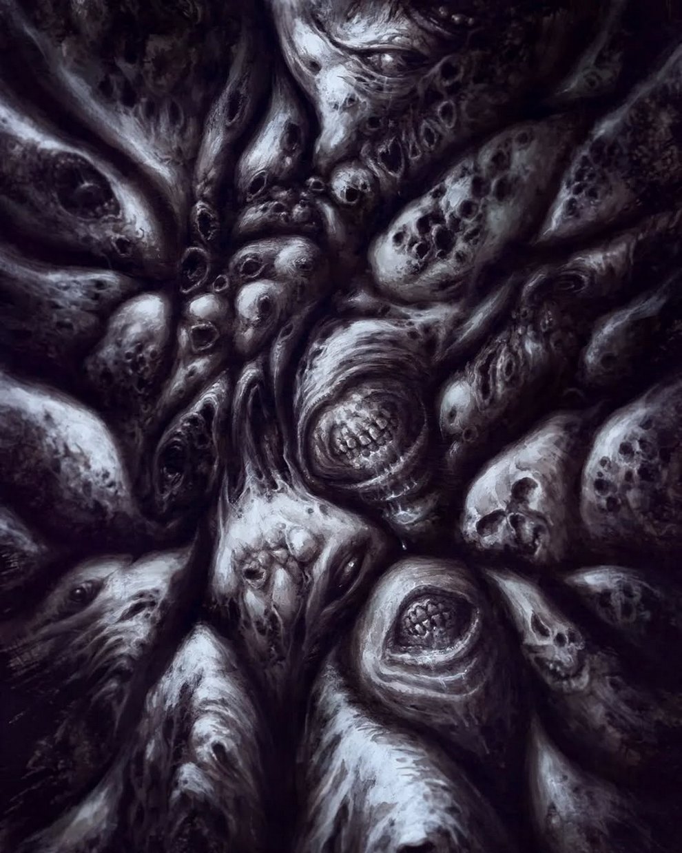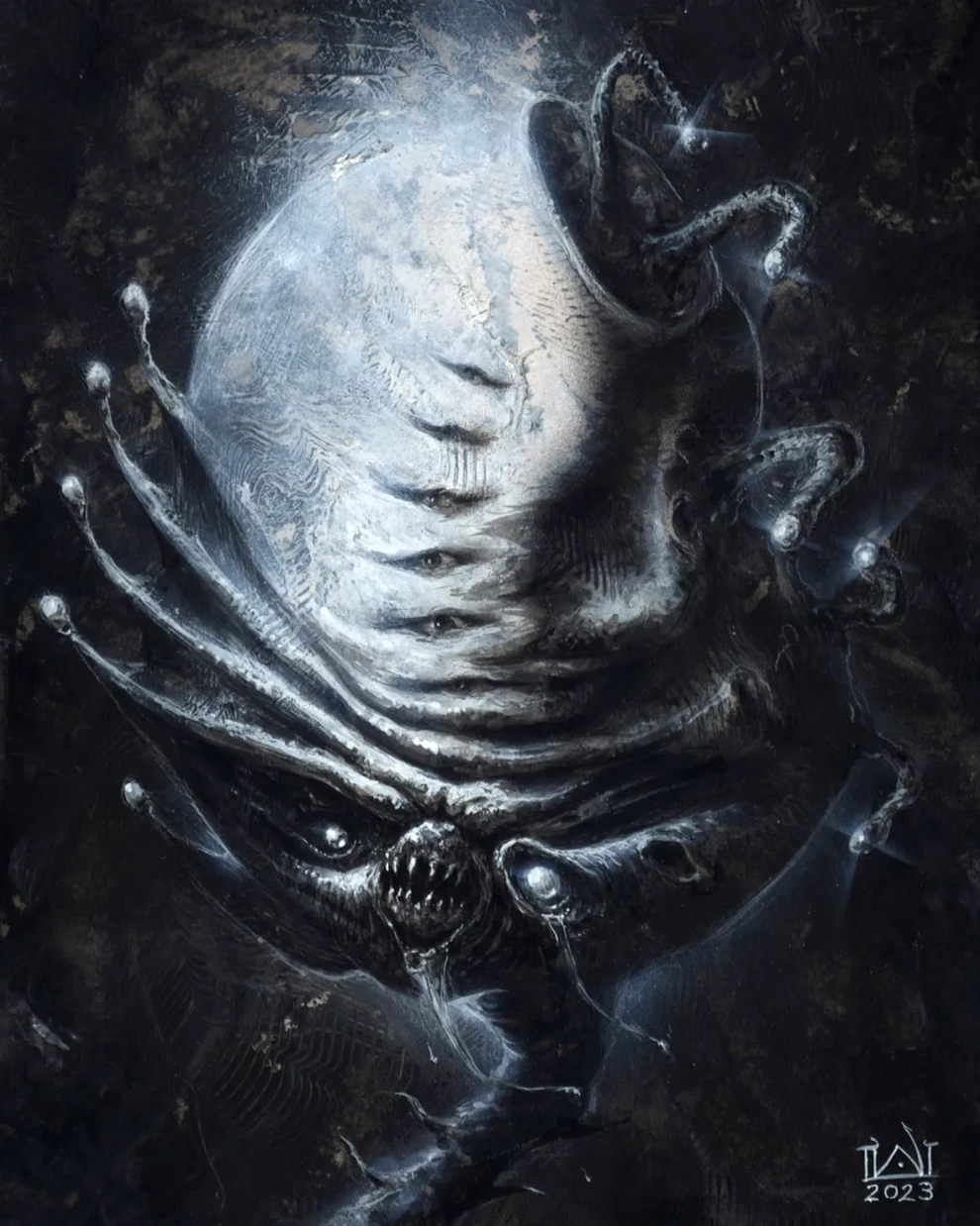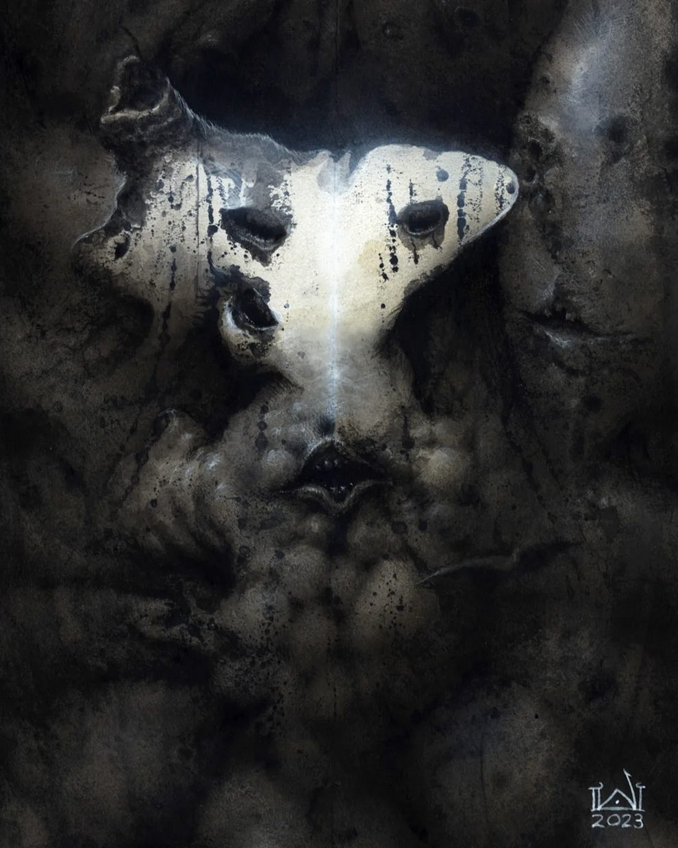 Born in 1979 and raised on 1980s cartoons, movies and hand‑painted poster art, he cites Clive Barker, Graham Humphreys, H.R. Giger and Drew Struzan as major influences feeding into his “melting pot” of nightmaresque, cinematic imagery.