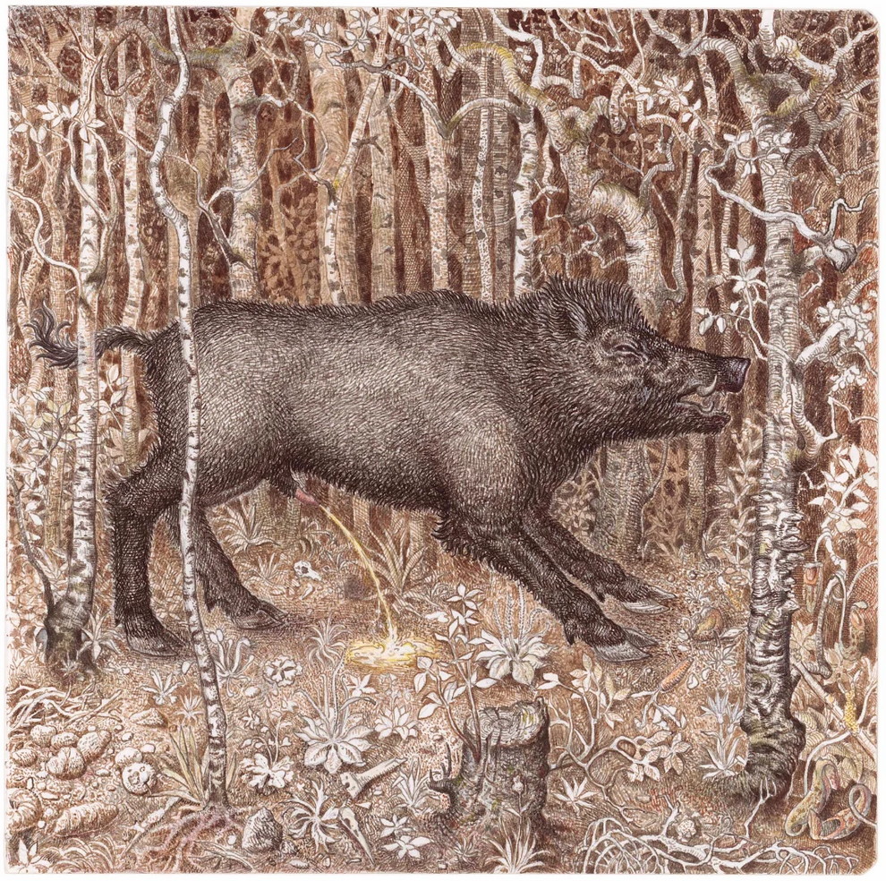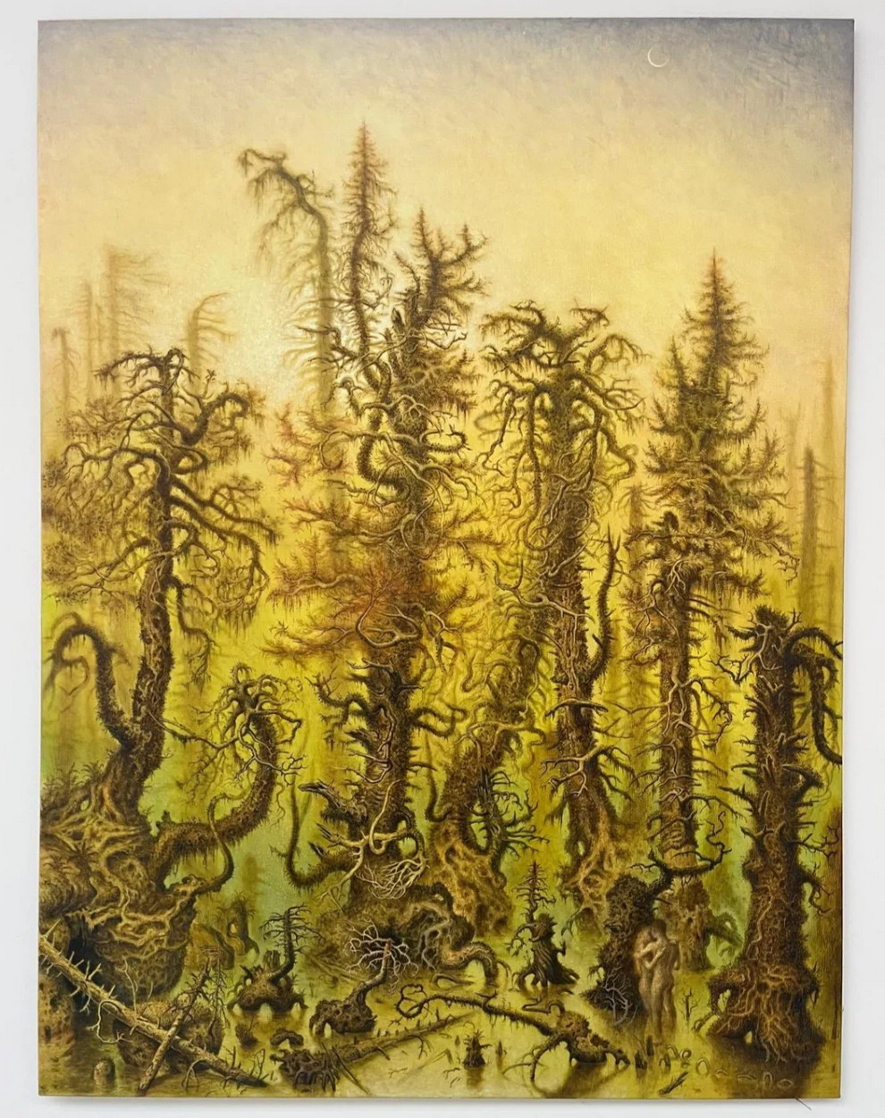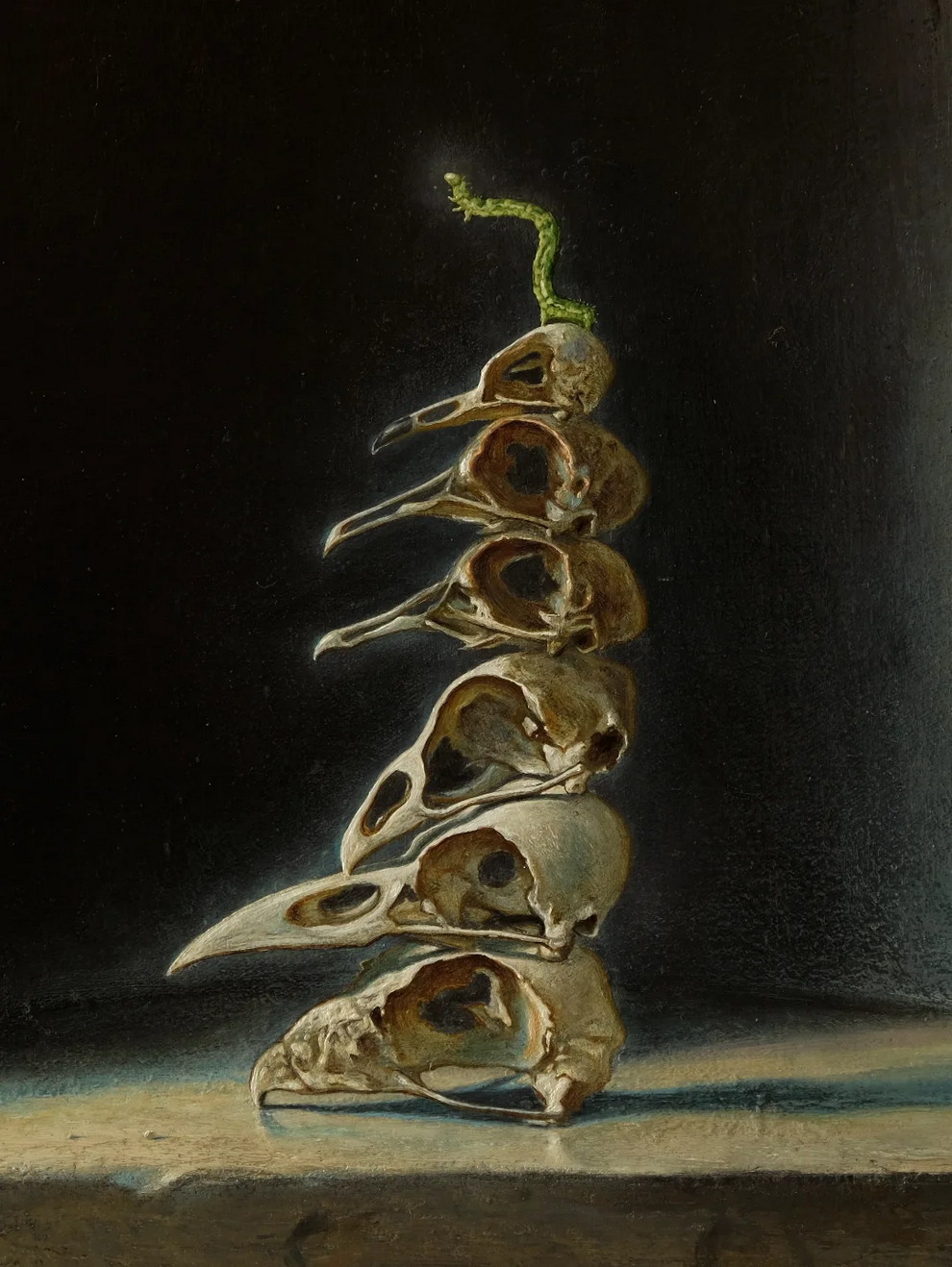 A trained stonemason and sculptor who later studied painting/graphics at HGB Leipzig, he creates mist‑filled forests, broken trees, skull‑infused still lifes like “Turm,” and intimate interiors that function as mythical “Hyperborea” refuges—places where nature, death and memory subtly intertwine. His exhibitions include major solo shows such as “Hyperborea” (Panorama Museum Bad Frankenhausen) and “Refugien” (Kunsthalle Worpswede).