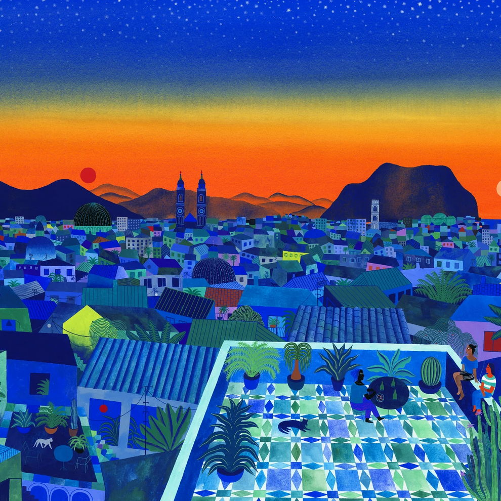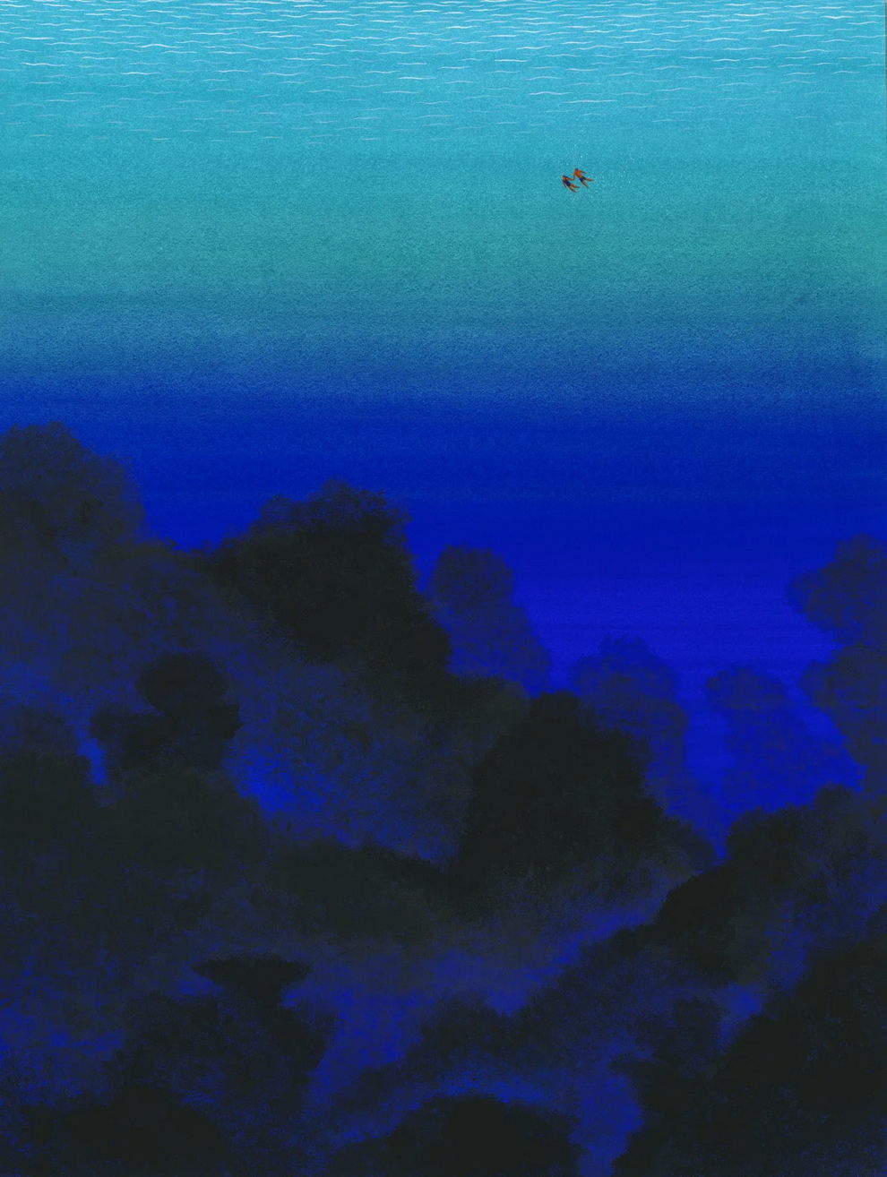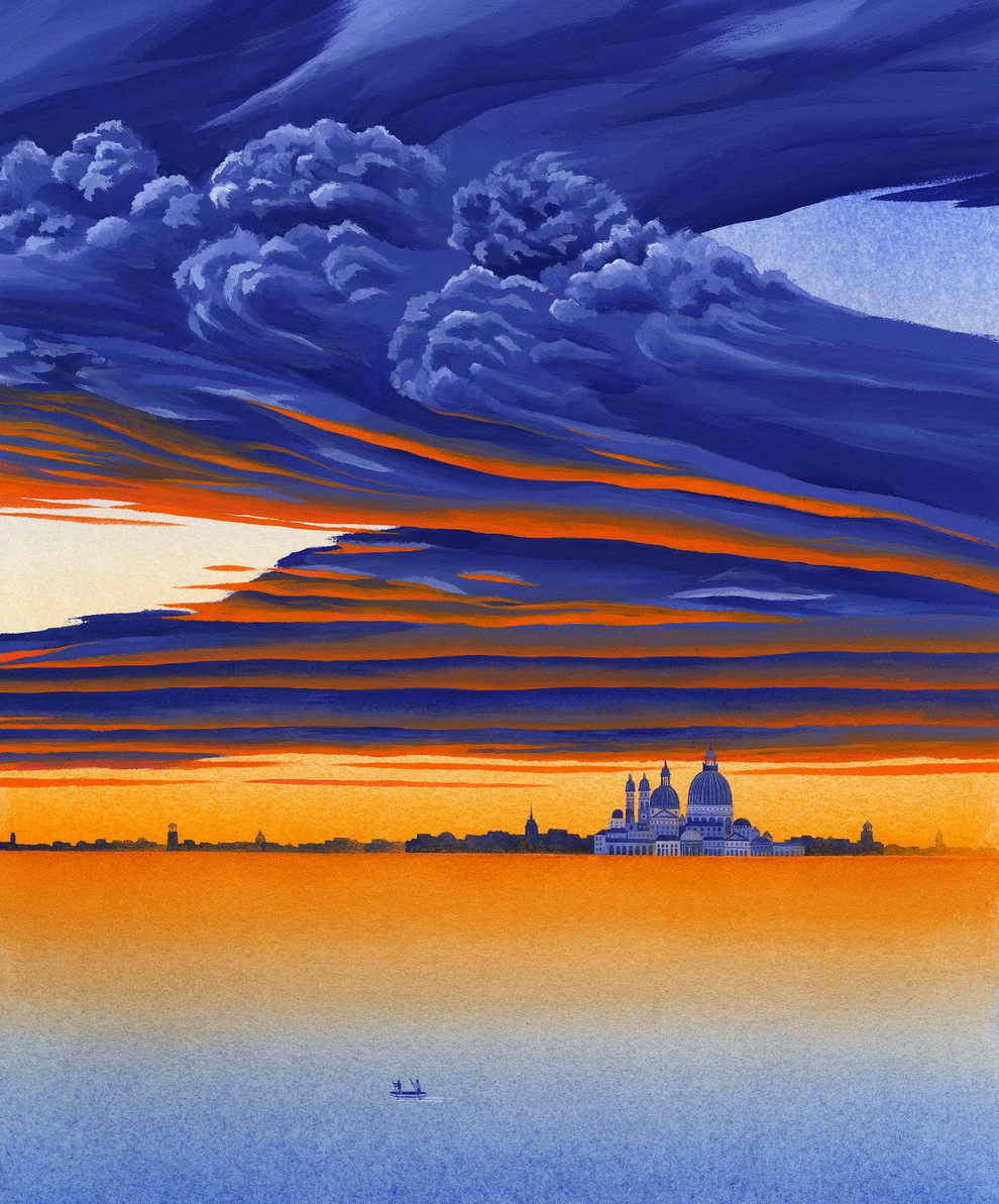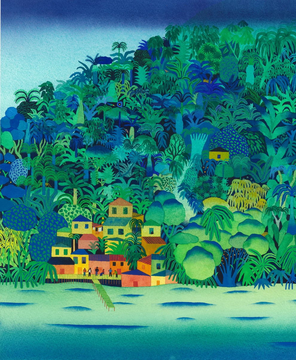 Mallard’s preferred mediums are watercolor and gouache, which he uses to create lush, highly detailed, and poetic dreamscapes. His signature technique involves applying watercolors almost like oil glazes—layering colors from light to dark in a slow, meticulous process to achieve incredibly vivid colors and smooth gradients. Heavily influenced by Moebius comics, Hayao Miyazaki’s films, popular Russian painters, Indian miniatures, and Henri Rousseau, his paintings often depict vibrant, welcoming worlds filled with nature, quaint architecture, and whimsical travel themes inspired by his time living in Naples and Sicily.