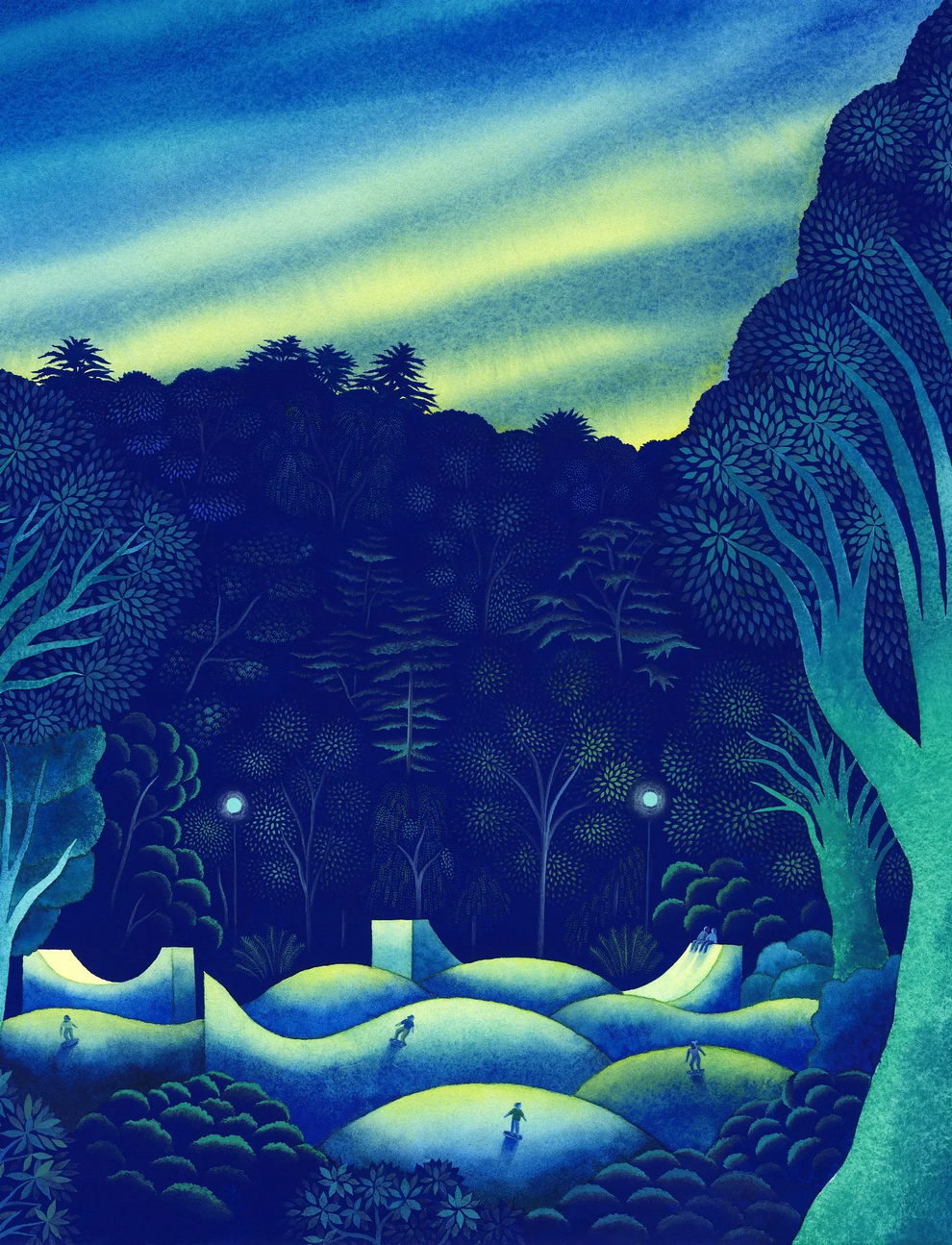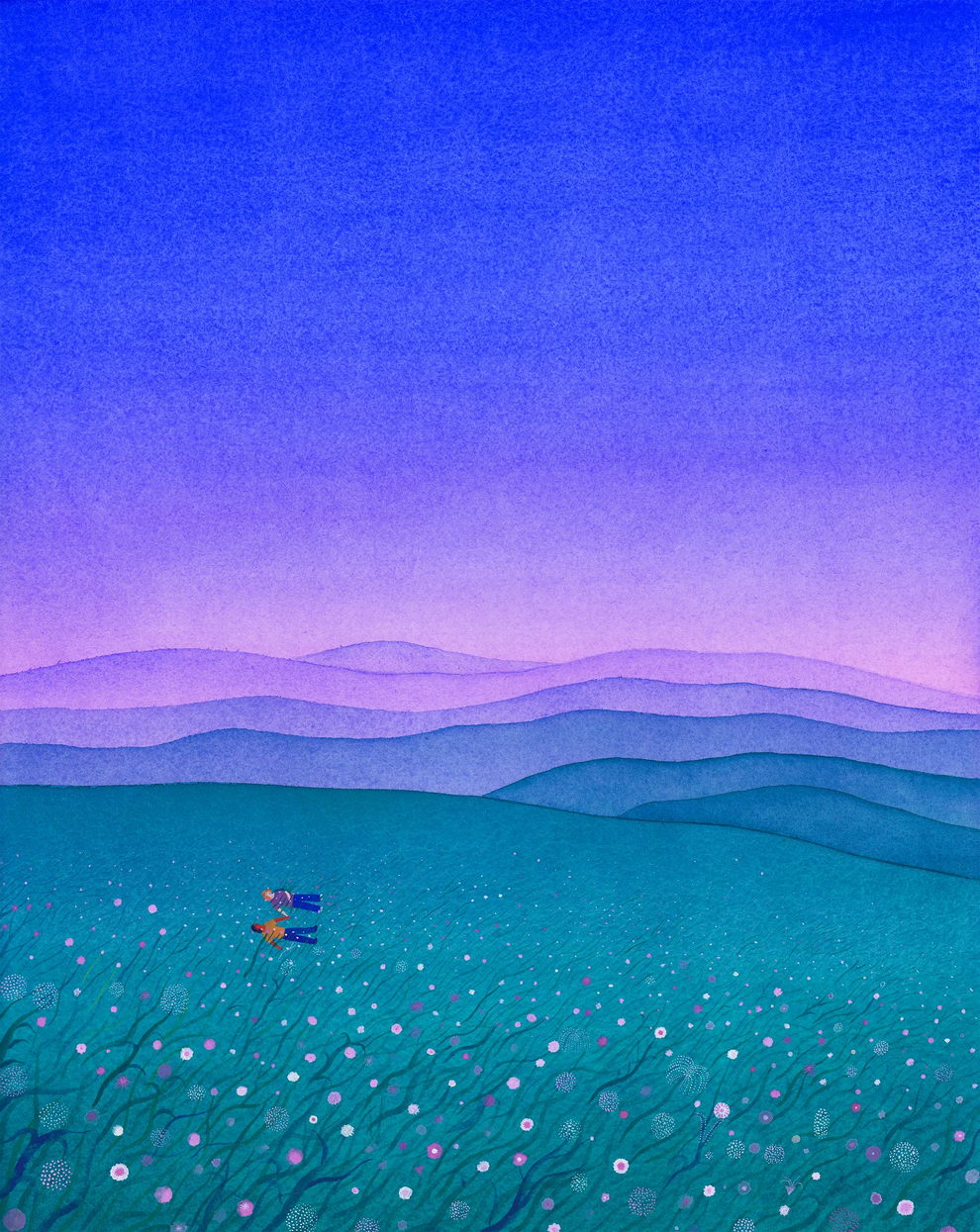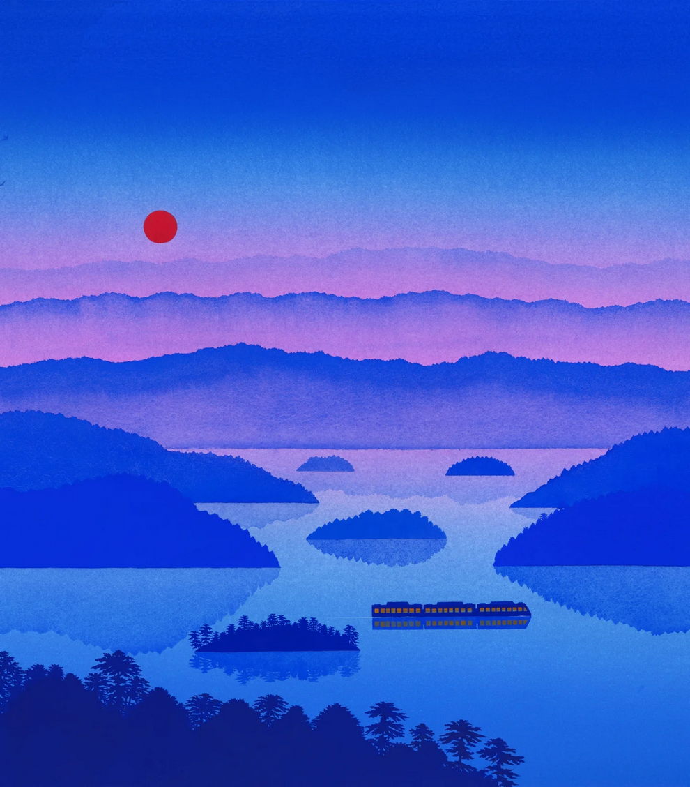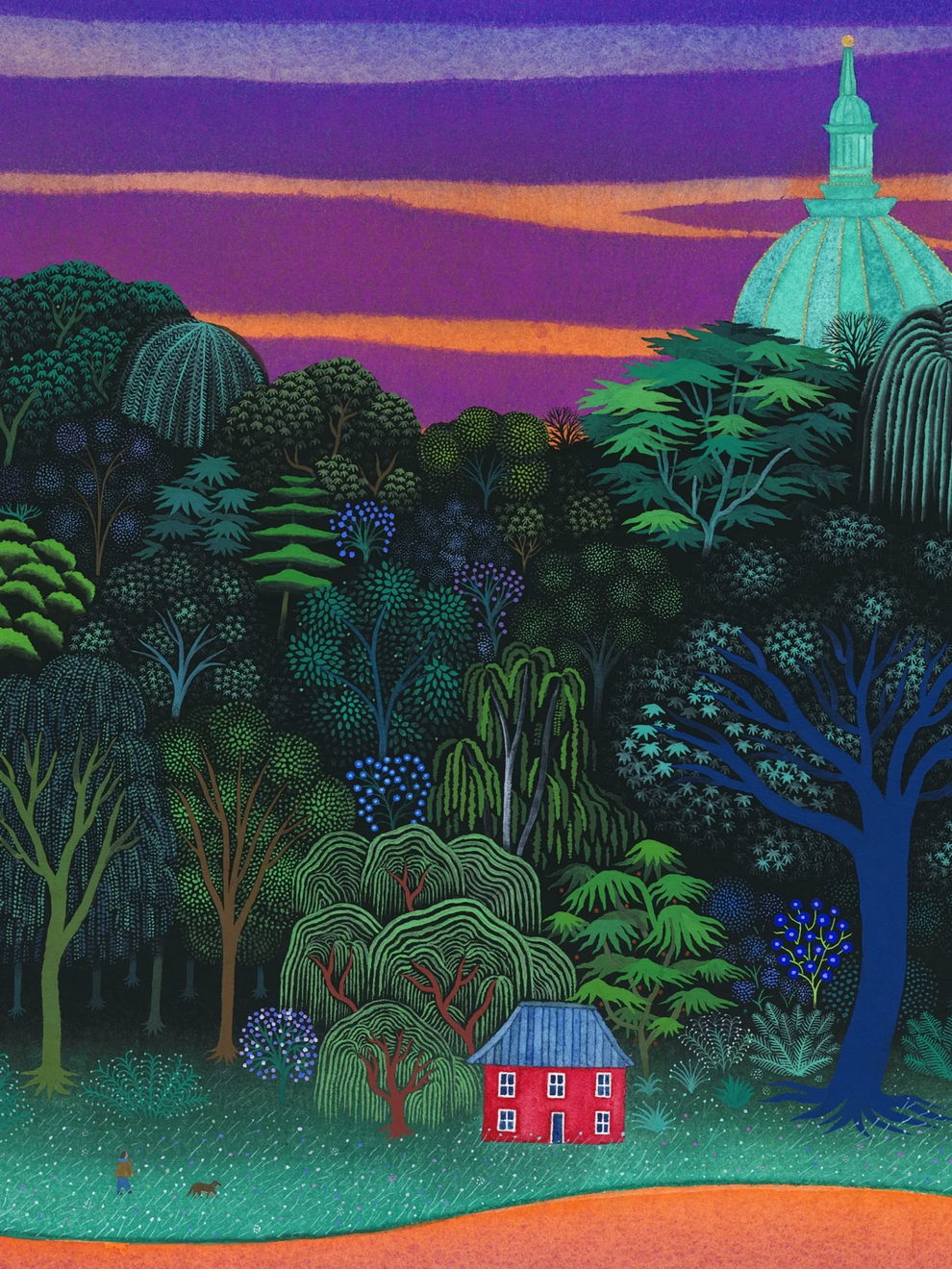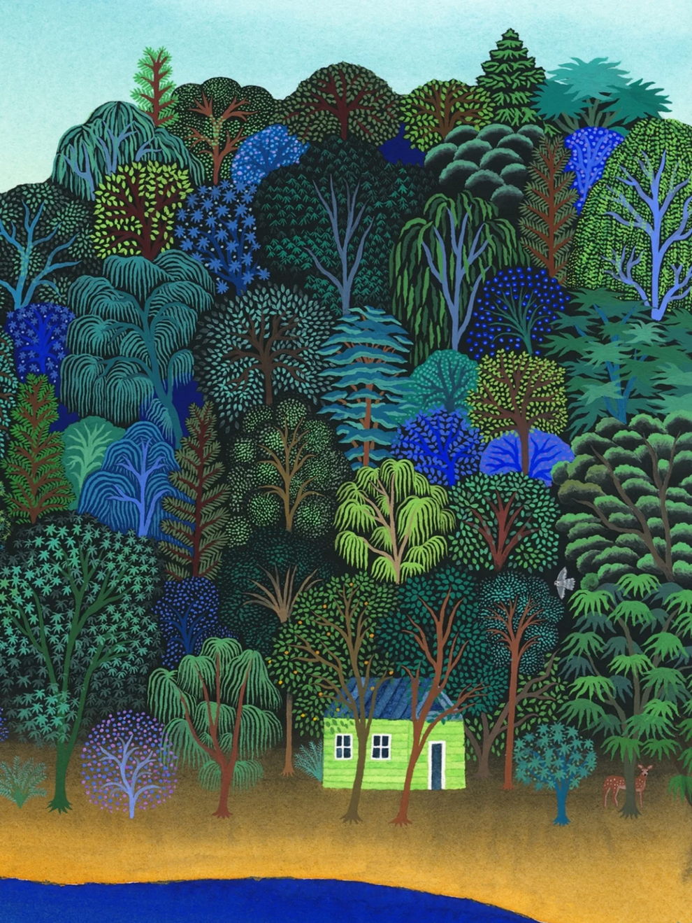 Mallard’s preferred mediums are watercolor and gouache, which he uses to create lush, highly detailed, and poetic dreamscapes. His signature technique involves applying watercolors almost like oil glazes—layering colors from light to dark in a slow, meticulous process to achieve incredibly vivid colors and smooth gradients. Heavily influenced by Moebius comics, Hayao Miyazaki’s films, popular Russian painters, Indian miniatures, and Henri Rousseau, his paintings often depict vibrant, welcoming worlds filled with nature, quaint architecture, and whimsical travel themes inspired by his time living in Naples and Sicily.