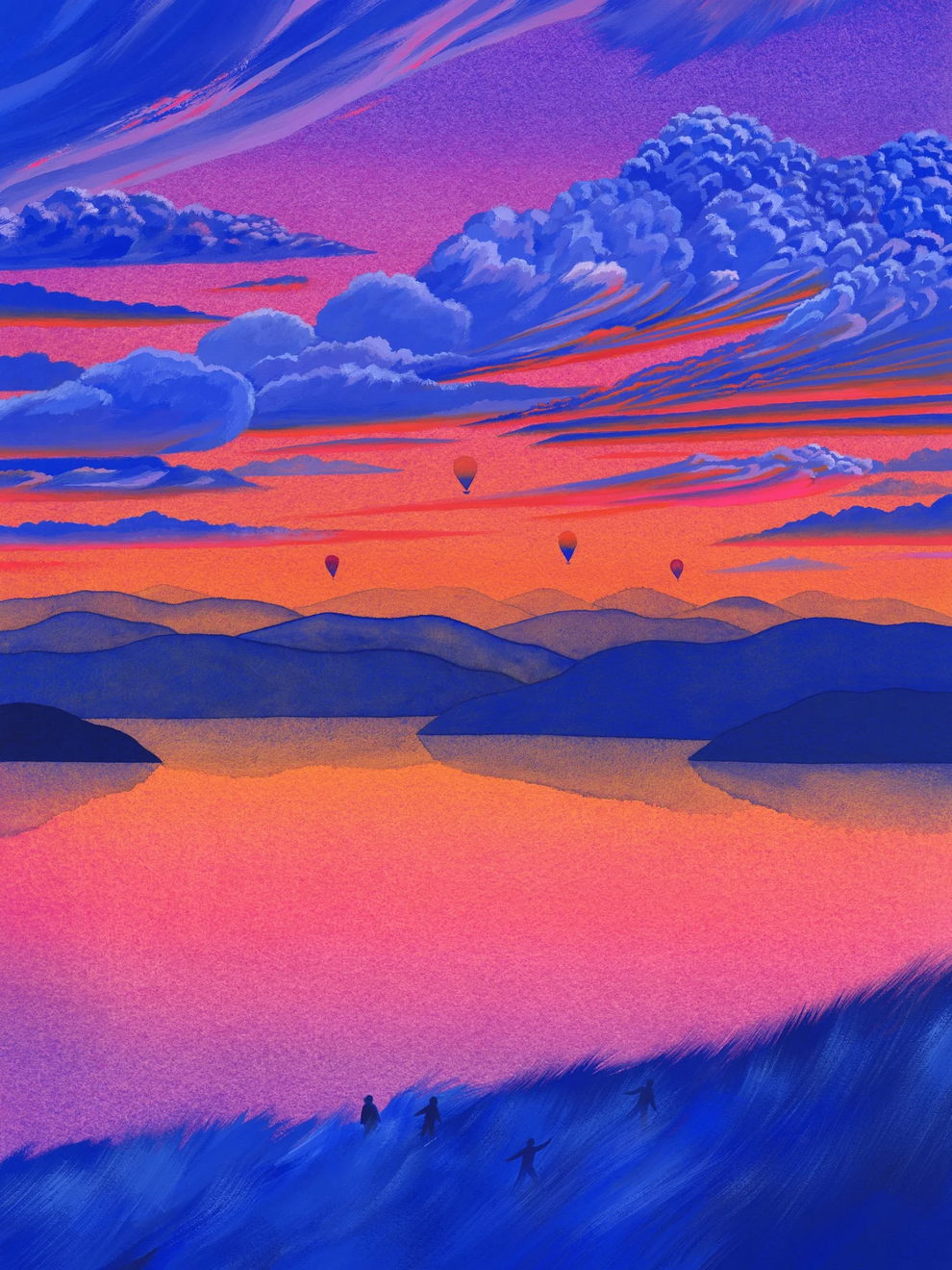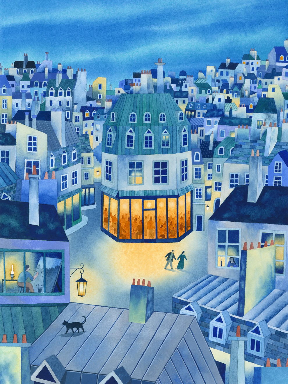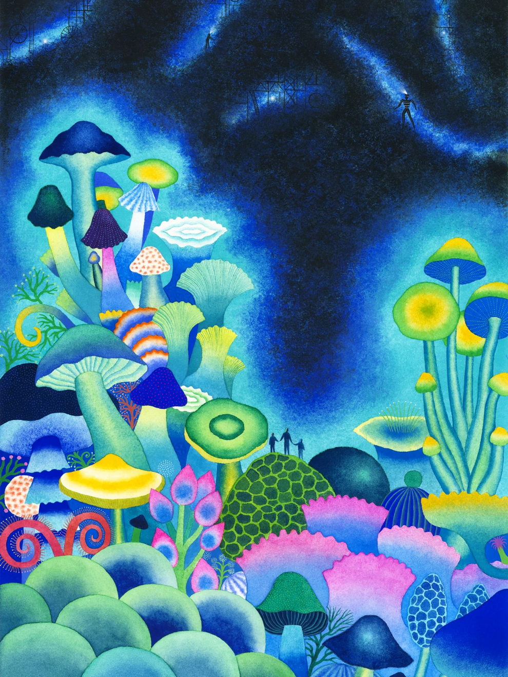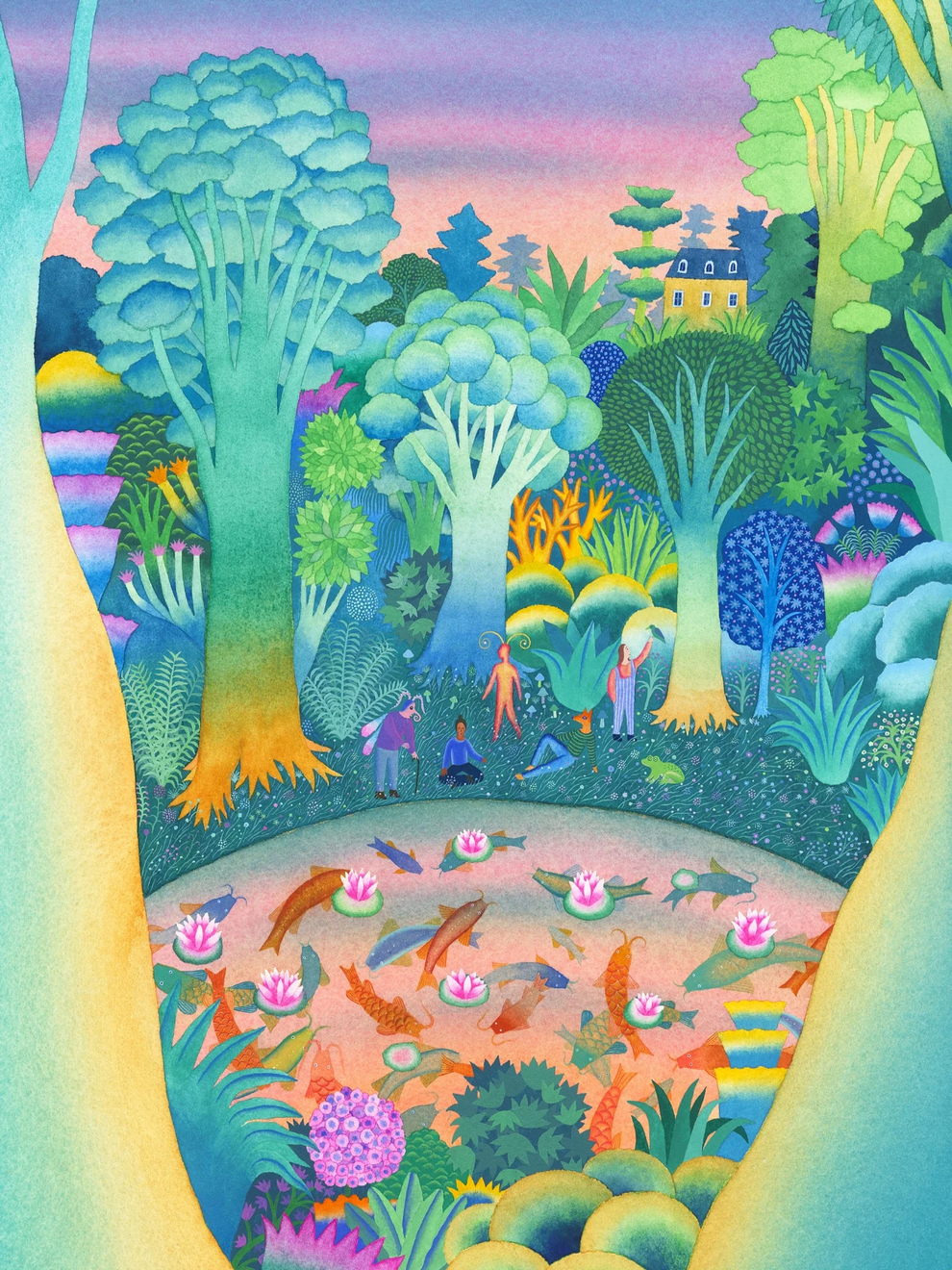 Mallard’s preferred mediums are watercolor and gouache, which he uses to create lush, highly detailed, and poetic dreamscapes. His signature technique involves applying watercolors almost like oil glazes—layering colors from light to dark in a slow, meticulous process to achieve incredibly vivid colors and smooth gradients. Heavily influenced by Moebius comics, Hayao Miyazaki’s films, popular Russian painters, Indian miniatures, and Henri Rousseau, his paintings often depict vibrant, welcoming worlds filled with nature, quaint architecture, and whimsical travel themes inspired by his time living in Naples and Sicily.