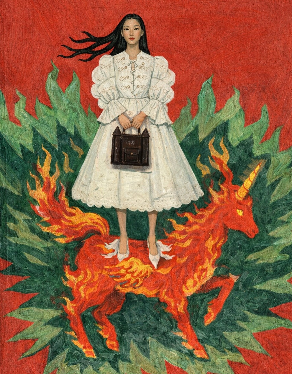 The brand’s universe mixes couture, illustration, ceramics and sculpture into narrative garments populated by recurring mythical beings like the Unisus (four‑headed dragon), Cat Mermaid, Animal Soul, eternal night Vampyr, Moon and Sun King, and time travellers.