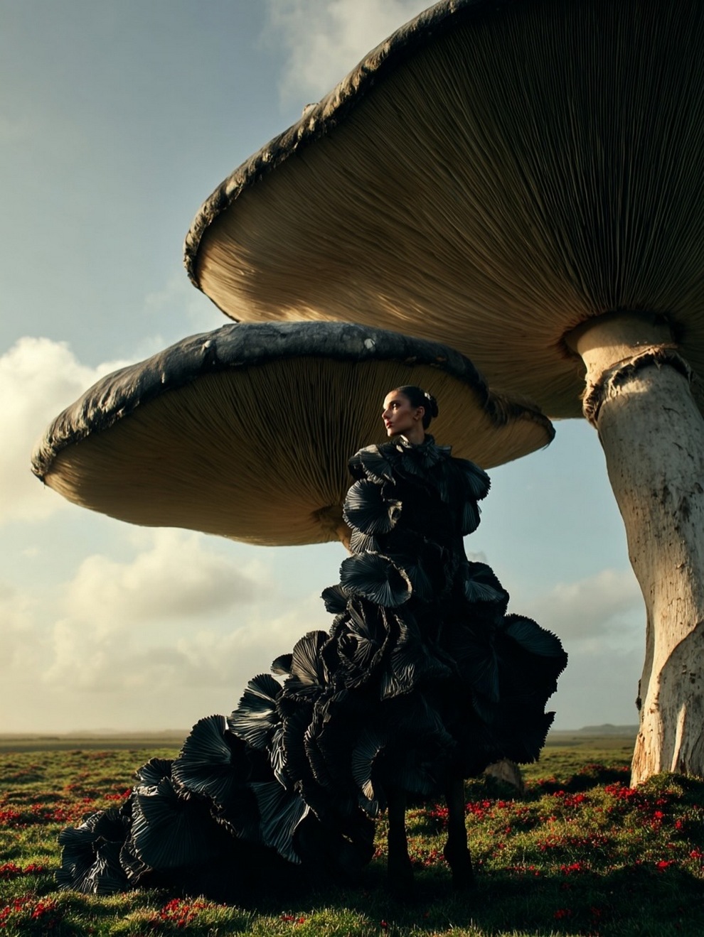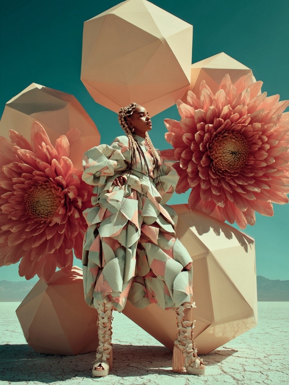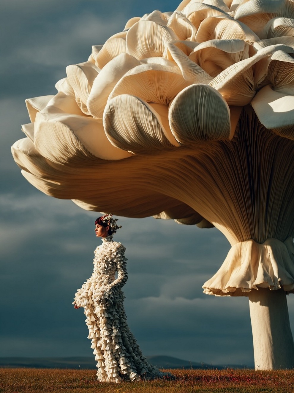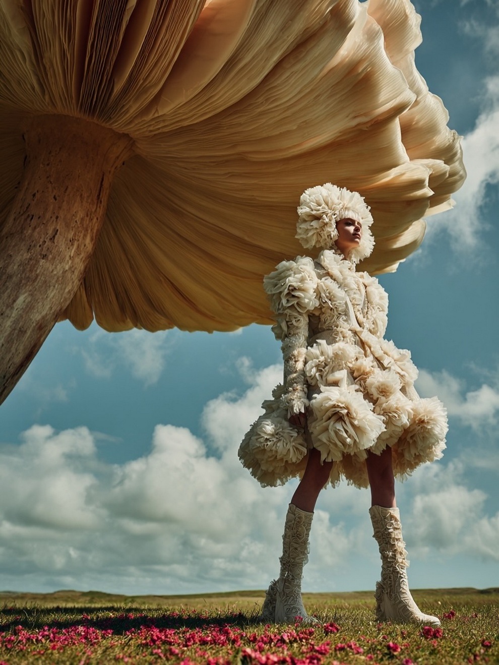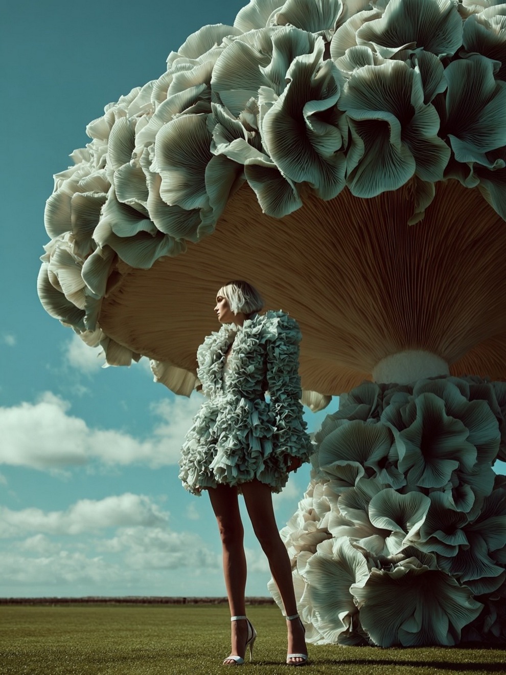 Paras’s artwork exists at the intersection of fashion, nature, and fantasy. She is best known for her “floral guardians” and surreal couture, where she drapes digital models in imagined garments made of cascading petals, metallic textures, or even mushroom frills. Her pieces often draw inspiration from the Mediterranean mood of her home in Cyprus, blending organic botanical shapes with avant-garde fashion concepts that deliberately defy the physical limitations of traditional photography.