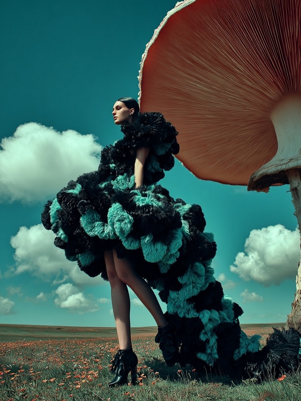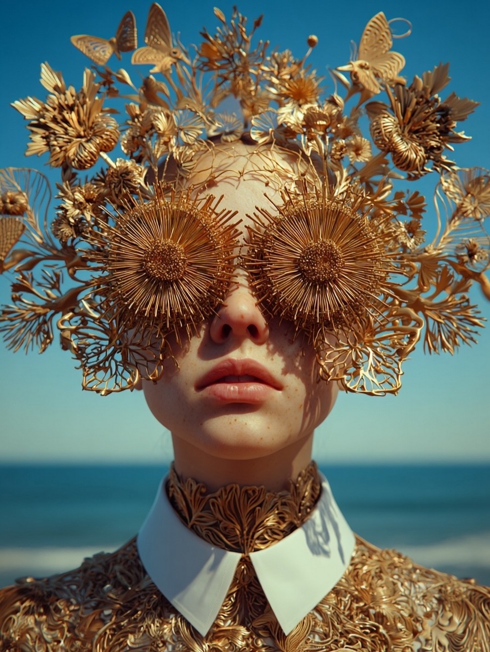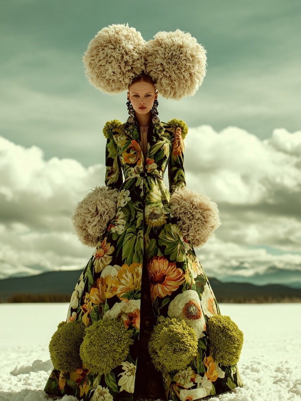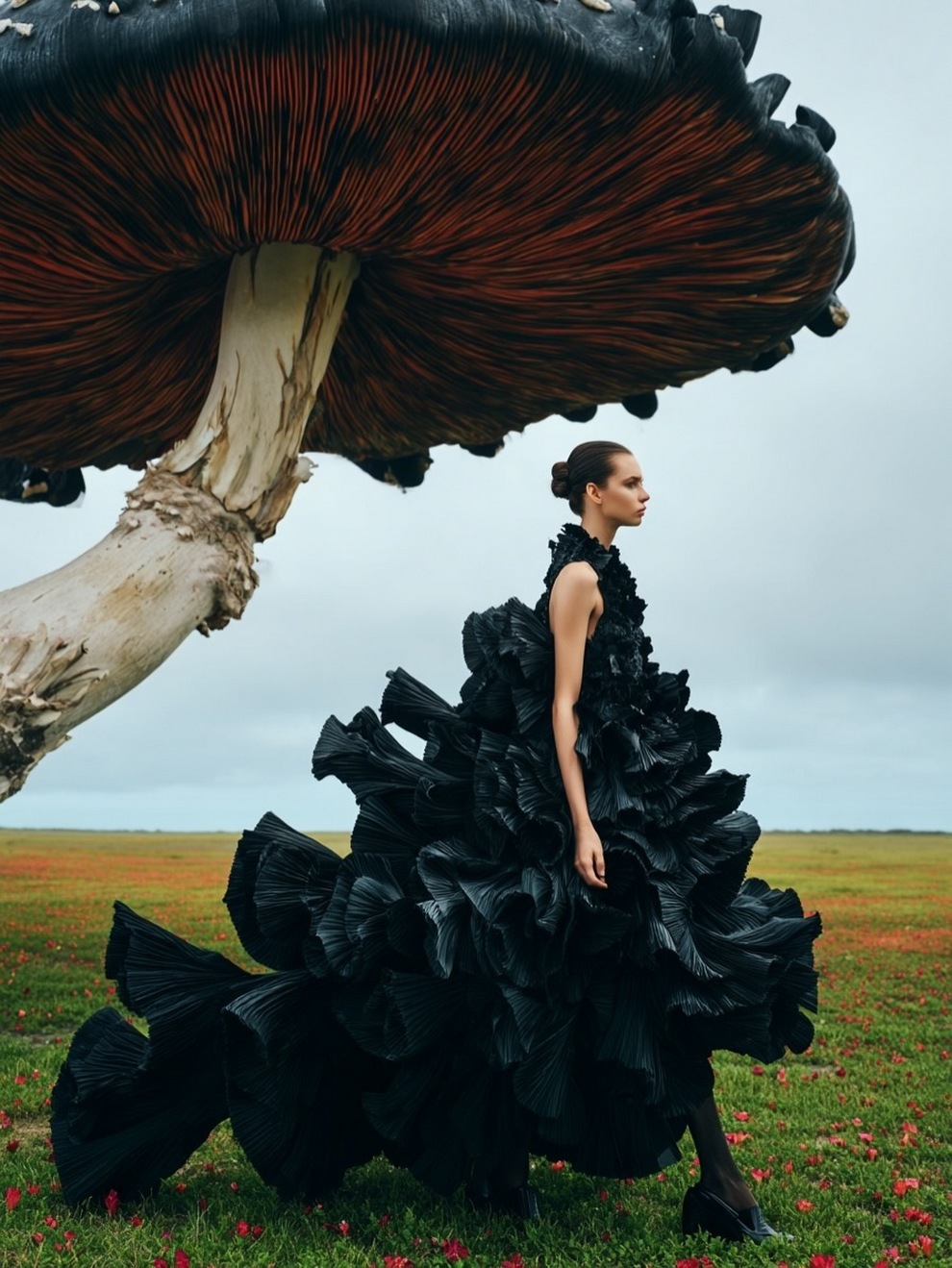 Paras’s artwork exists at the intersection of fashion, nature, and fantasy. She is best known for her “floral guardians” and surreal couture, where she drapes digital models in imagined garments made of cascading petals, metallic textures, or even mushroom frills. Her pieces often draw inspiration from the Mediterranean mood of her home in Cyprus, blending organic botanical shapes with avant-garde fashion concepts that deliberately defy the physical limitations of traditional photography.