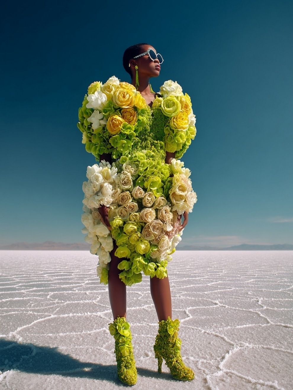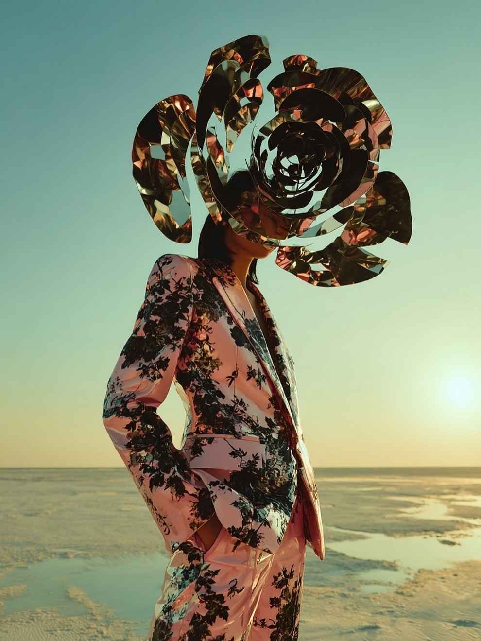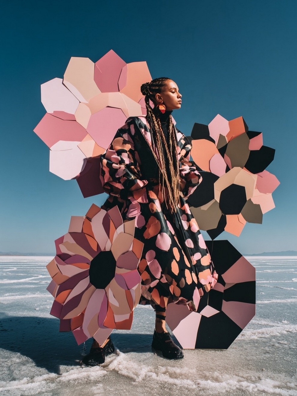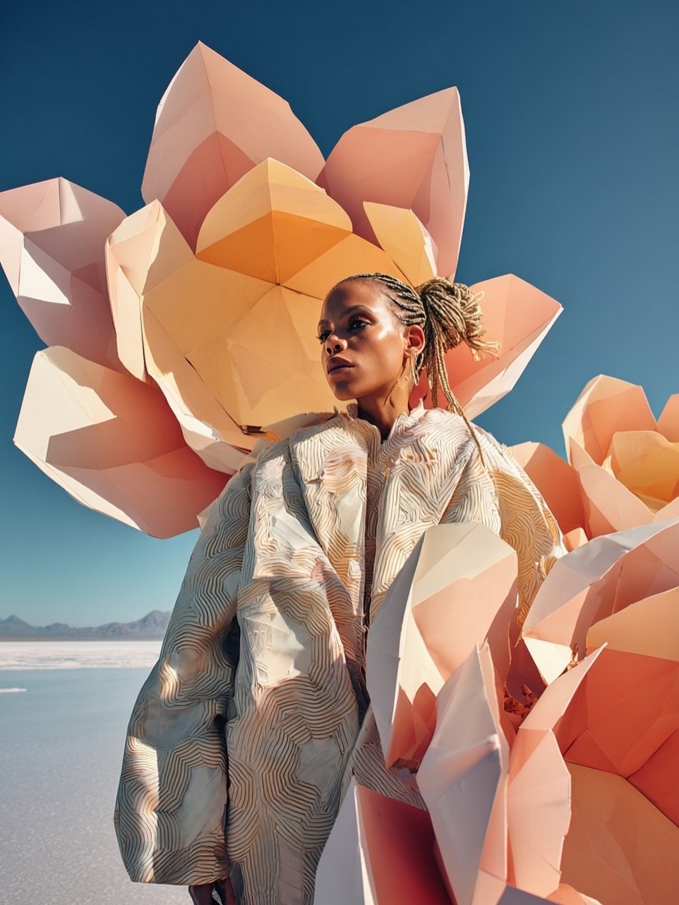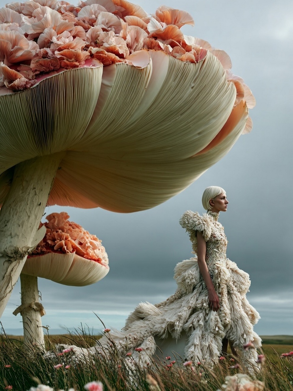 Paras’s artwork exists at the intersection of fashion, nature, and fantasy. She is best known for her “floral guardians” and surreal couture, where she drapes digital models in imagined garments made of cascading petals, metallic textures, or even mushroom frills. Her pieces often draw inspiration from the Mediterranean mood of her home in Cyprus, blending organic botanical shapes with avant-garde fashion concepts that deliberately defy the physical limitations of traditional photography.