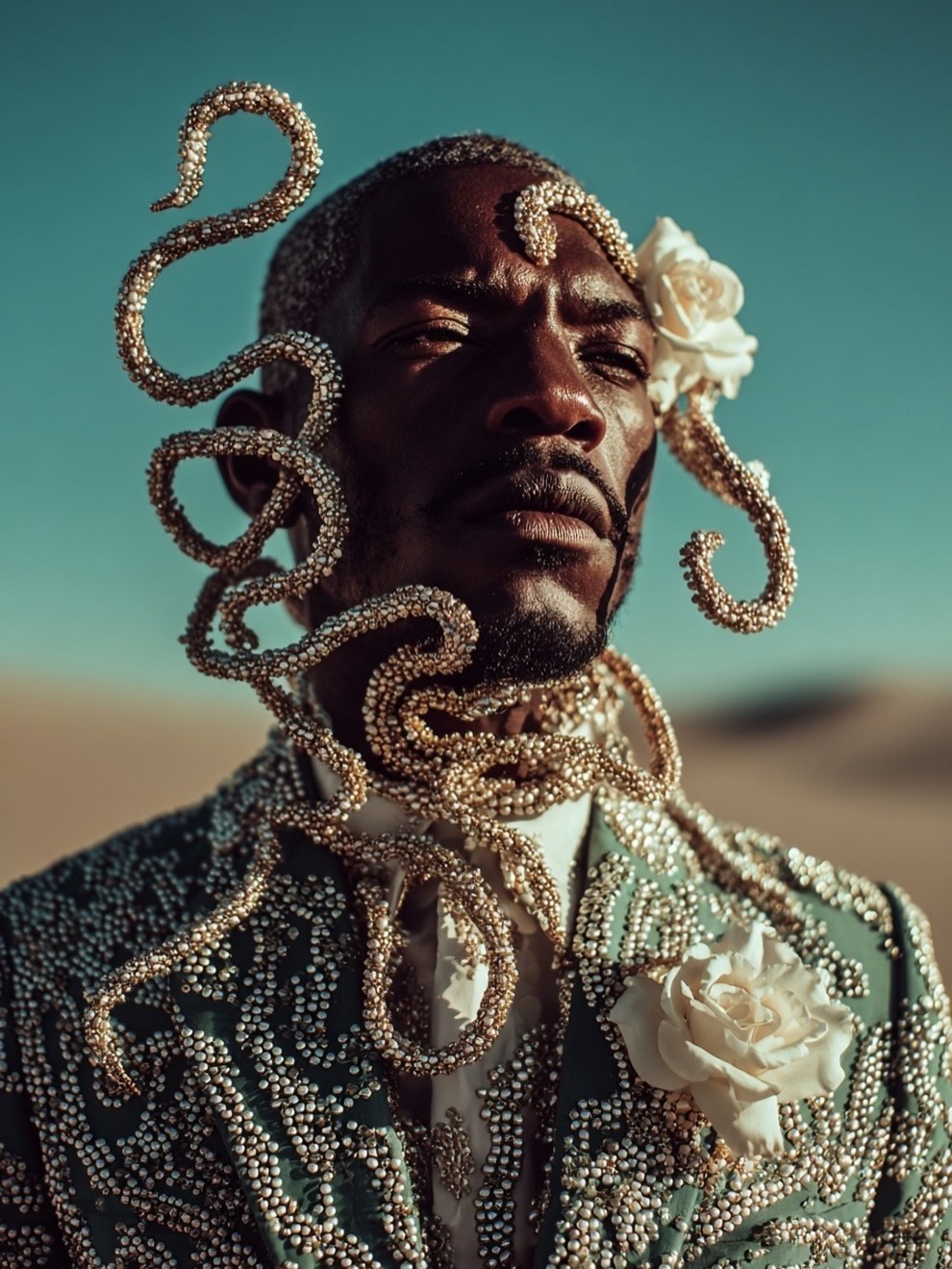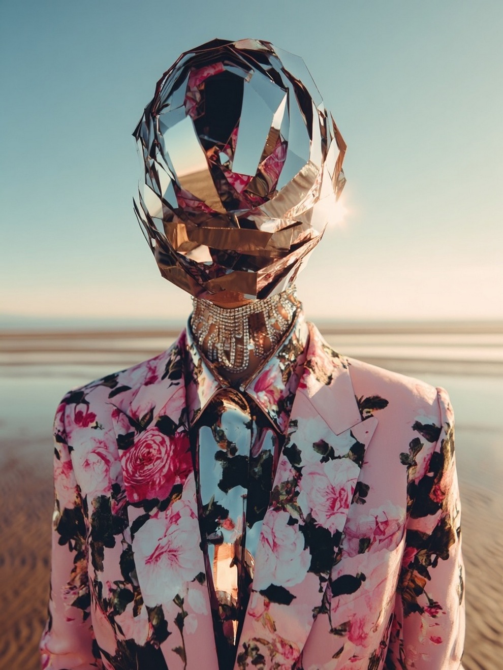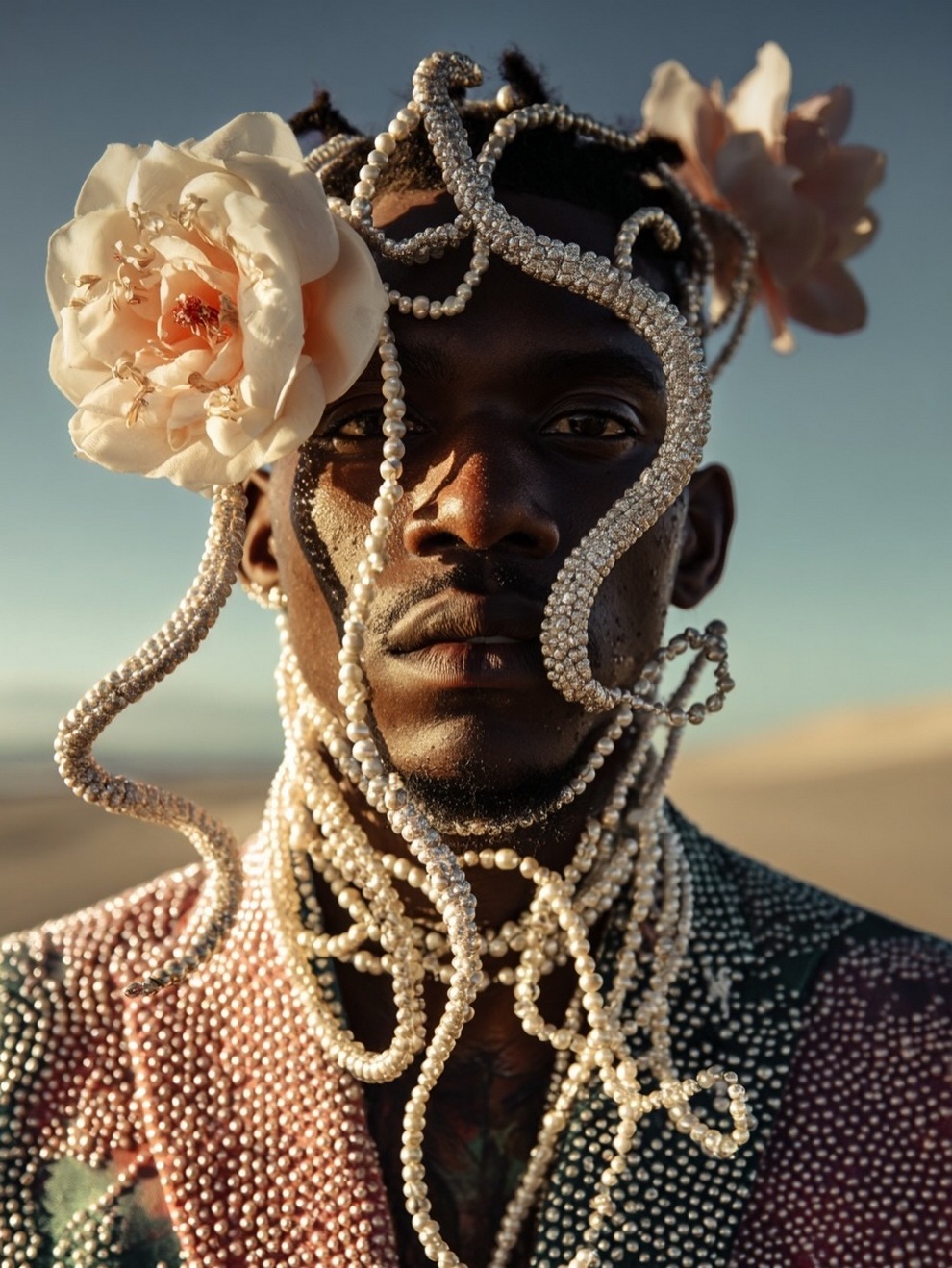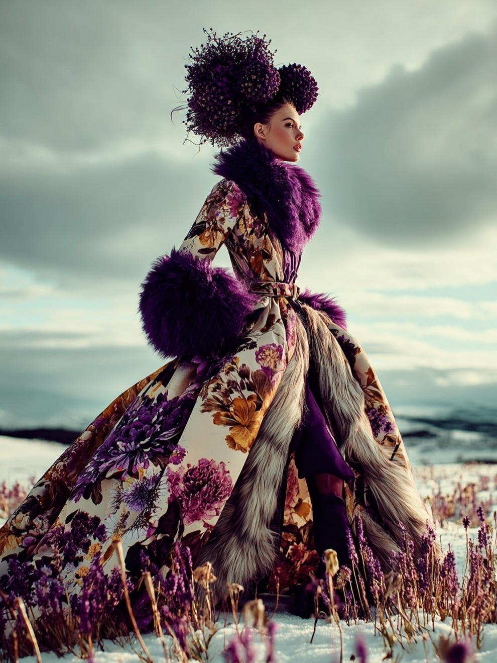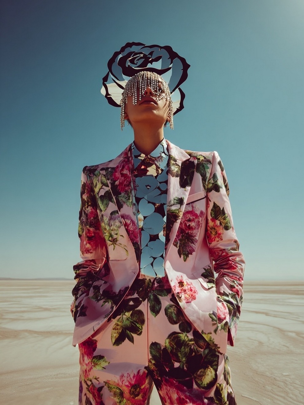 Paras’s artwork exists at the intersection of fashion, nature, and fantasy. She is best known for her “floral guardians” and surreal couture, where she drapes digital models in imagined garments made of cascading petals, metallic textures, or even mushroom frills. Her pieces often draw inspiration from the Mediterranean mood of her home in Cyprus, blending organic botanical shapes with avant-garde fashion concepts that deliberately defy the physical limitations of traditional photography.