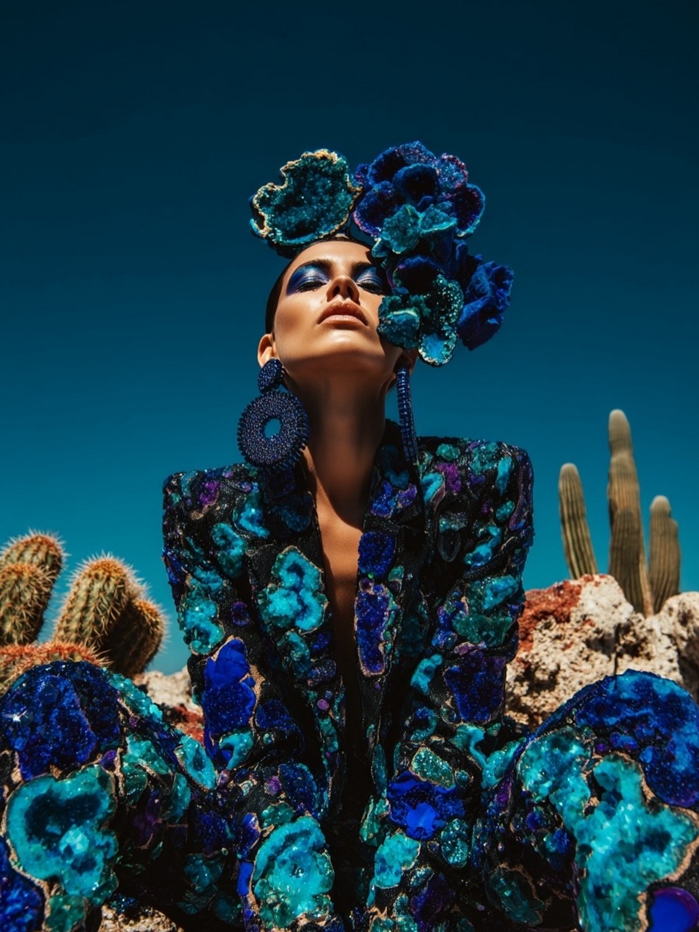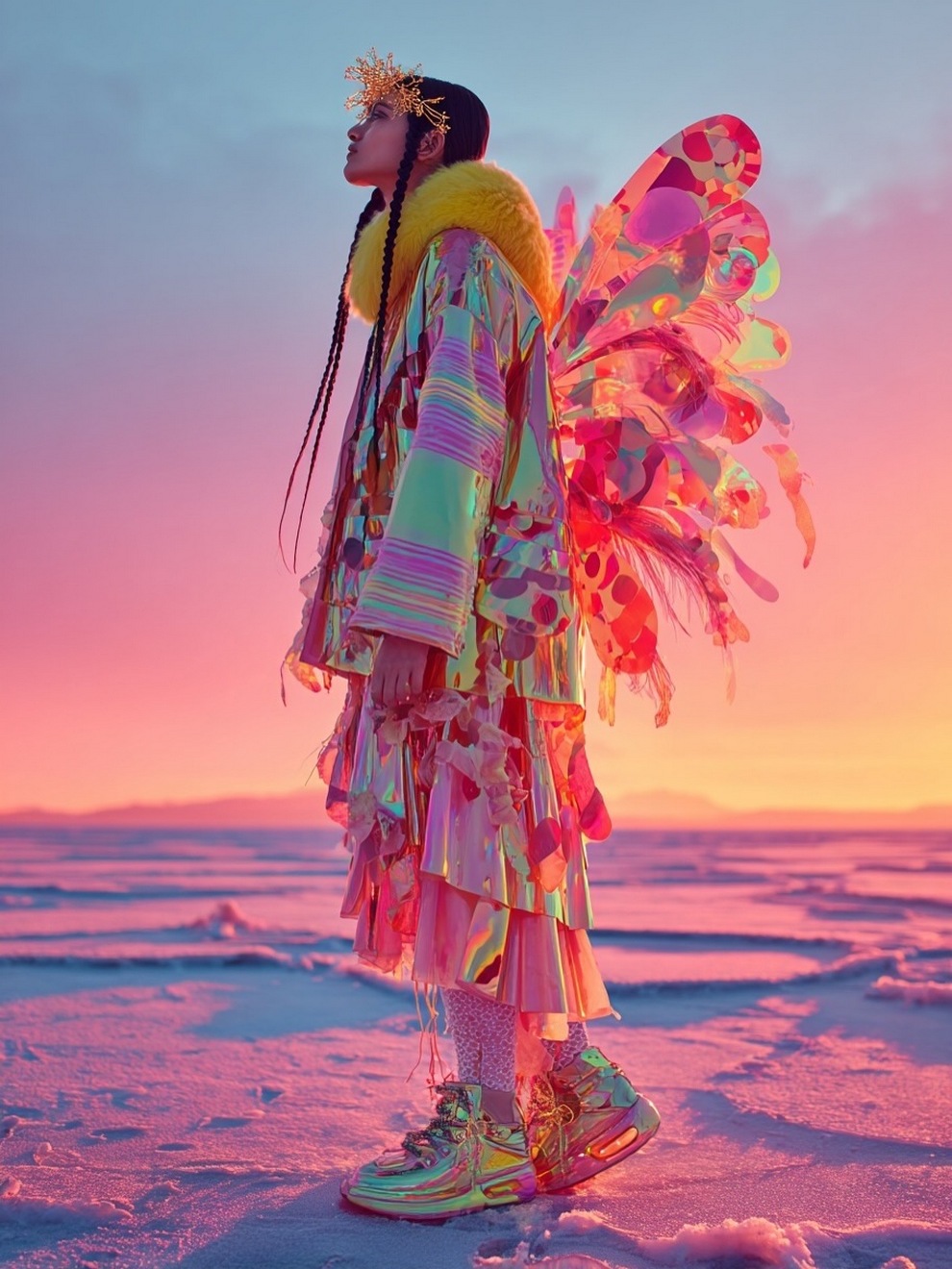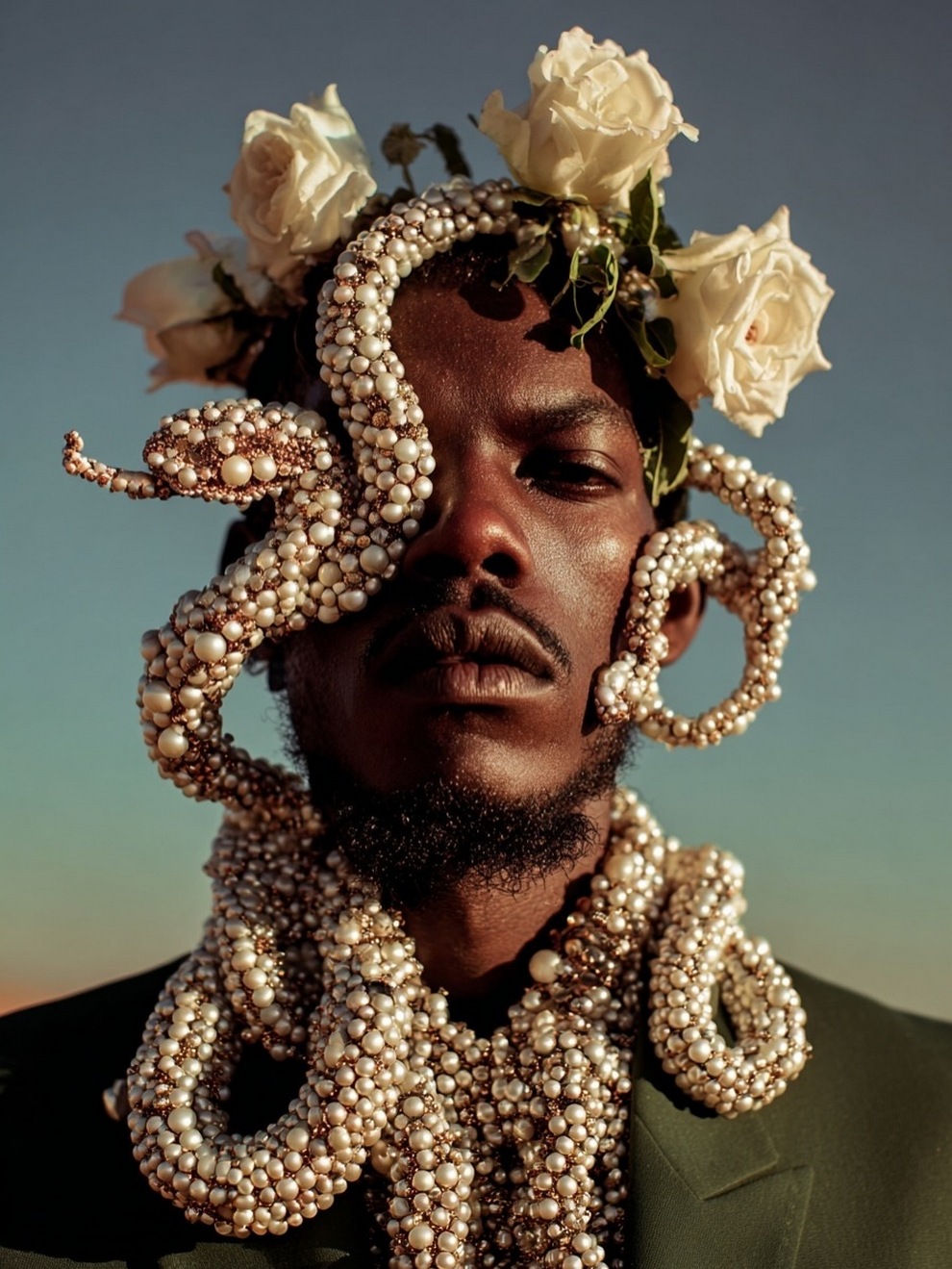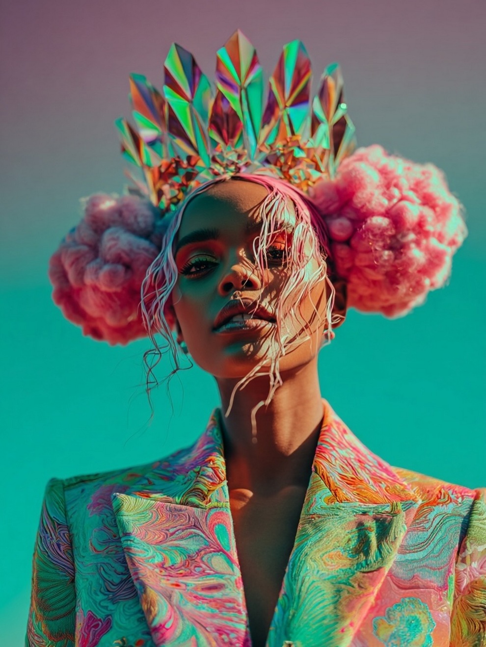 Paras’s artwork exists at the intersection of fashion, nature, and fantasy. She is best known for her “floral guardians” and surreal couture, where she drapes digital models in imagined garments made of cascading petals, metallic textures, or even mushroom frills. Her pieces often draw inspiration from the Mediterranean mood of her home in Cyprus, blending organic botanical shapes with avant-garde fashion concepts that deliberately defy the physical limitations of traditional photography.