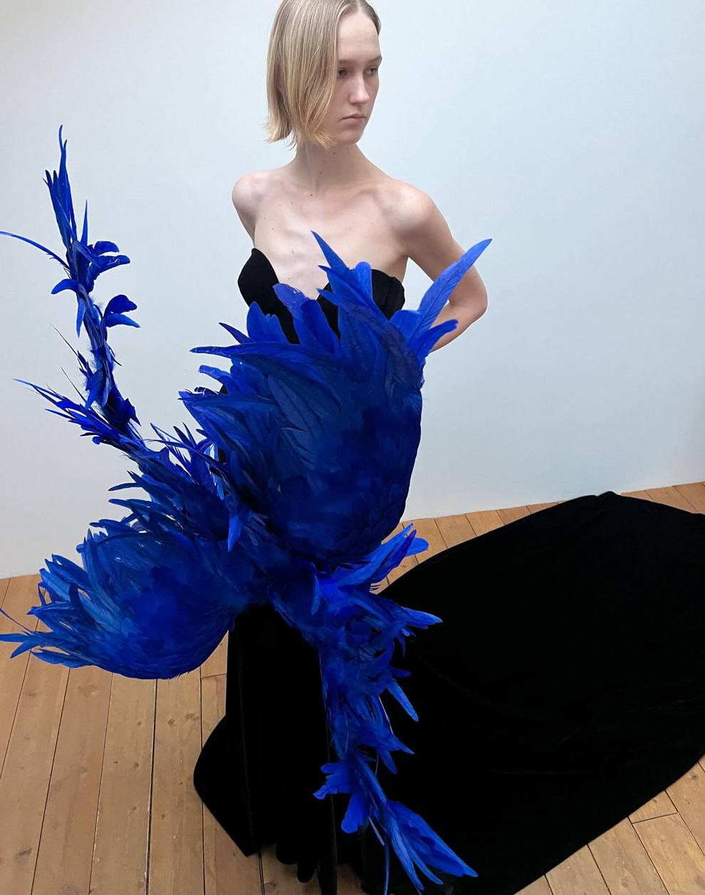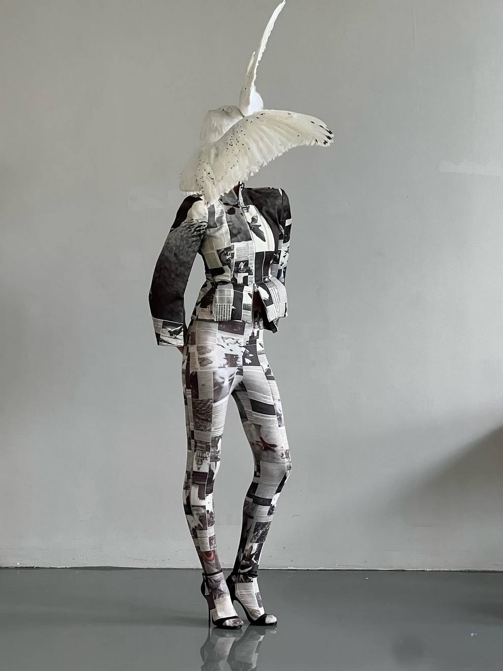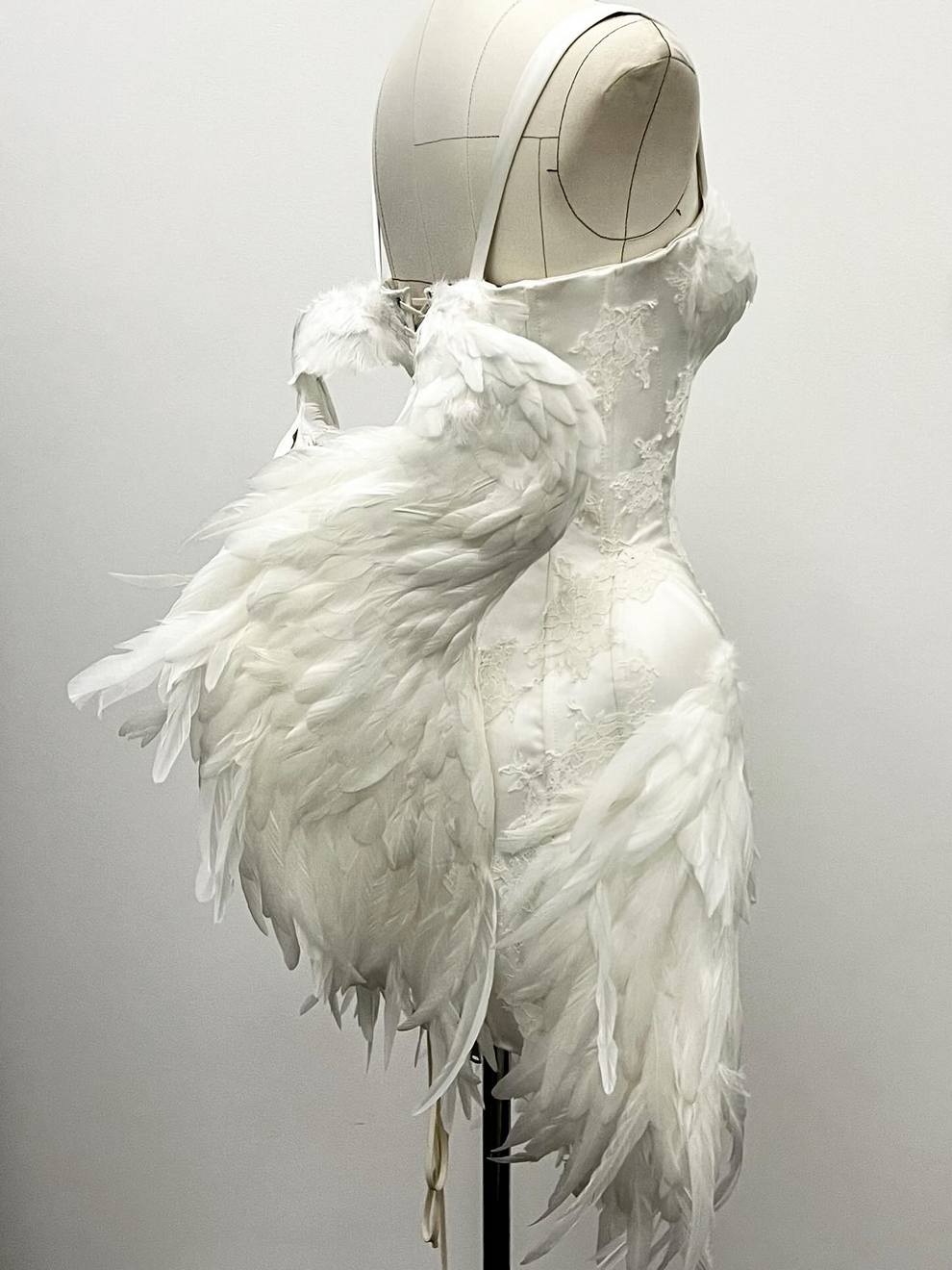 Migmoon’s fashion portfolio frequently blurs the line between haute couture and contemporary art. His visual identity is heavily defined by dramatic, surreal silhouettes, with his signature recurring motif being the swan and the extensive use of feathers. From intricate swan-shaped headpieces to elaborate custom wedding suits and masks, his work is characterized by its bold, romantic, and highly conceptual aesthetic.