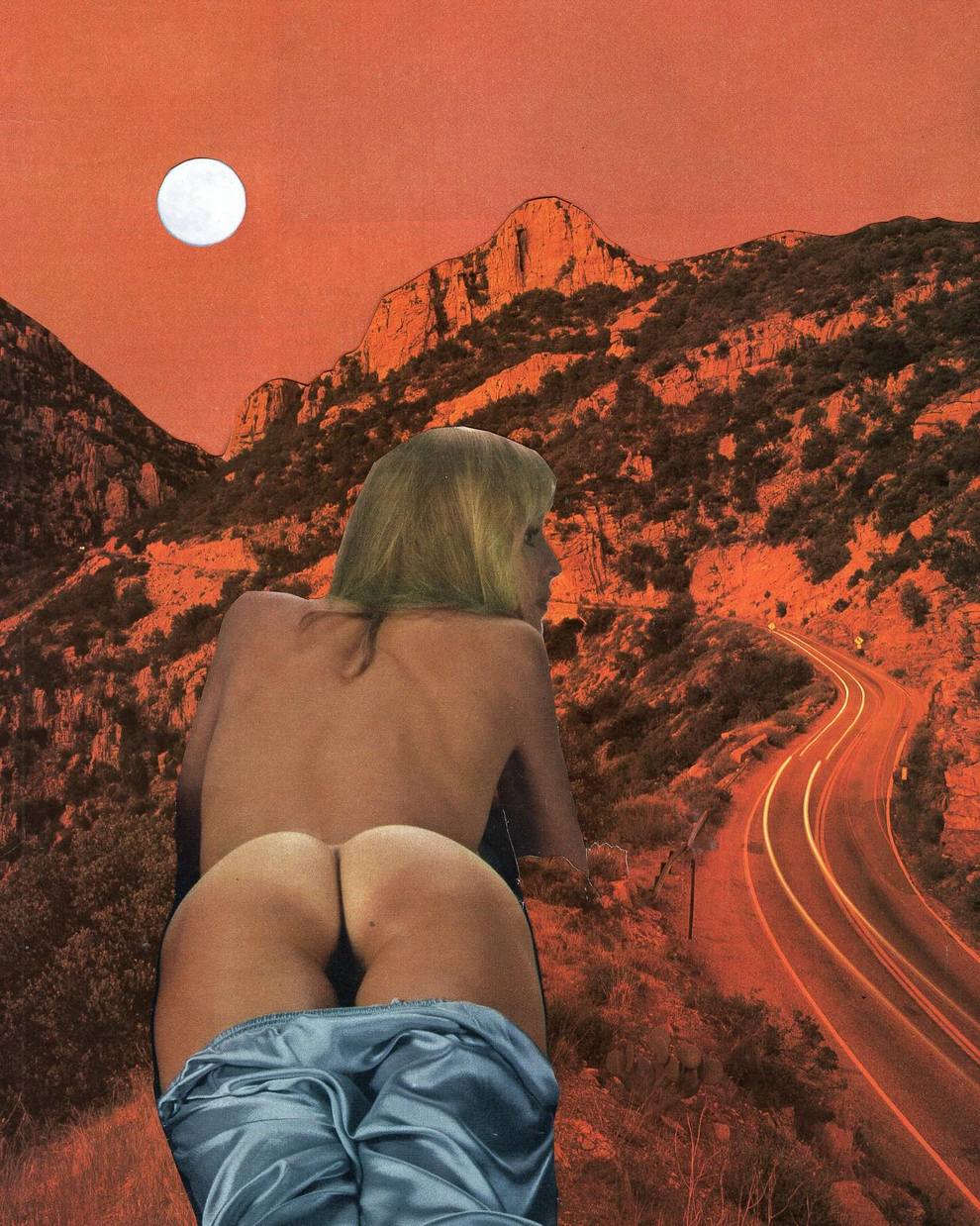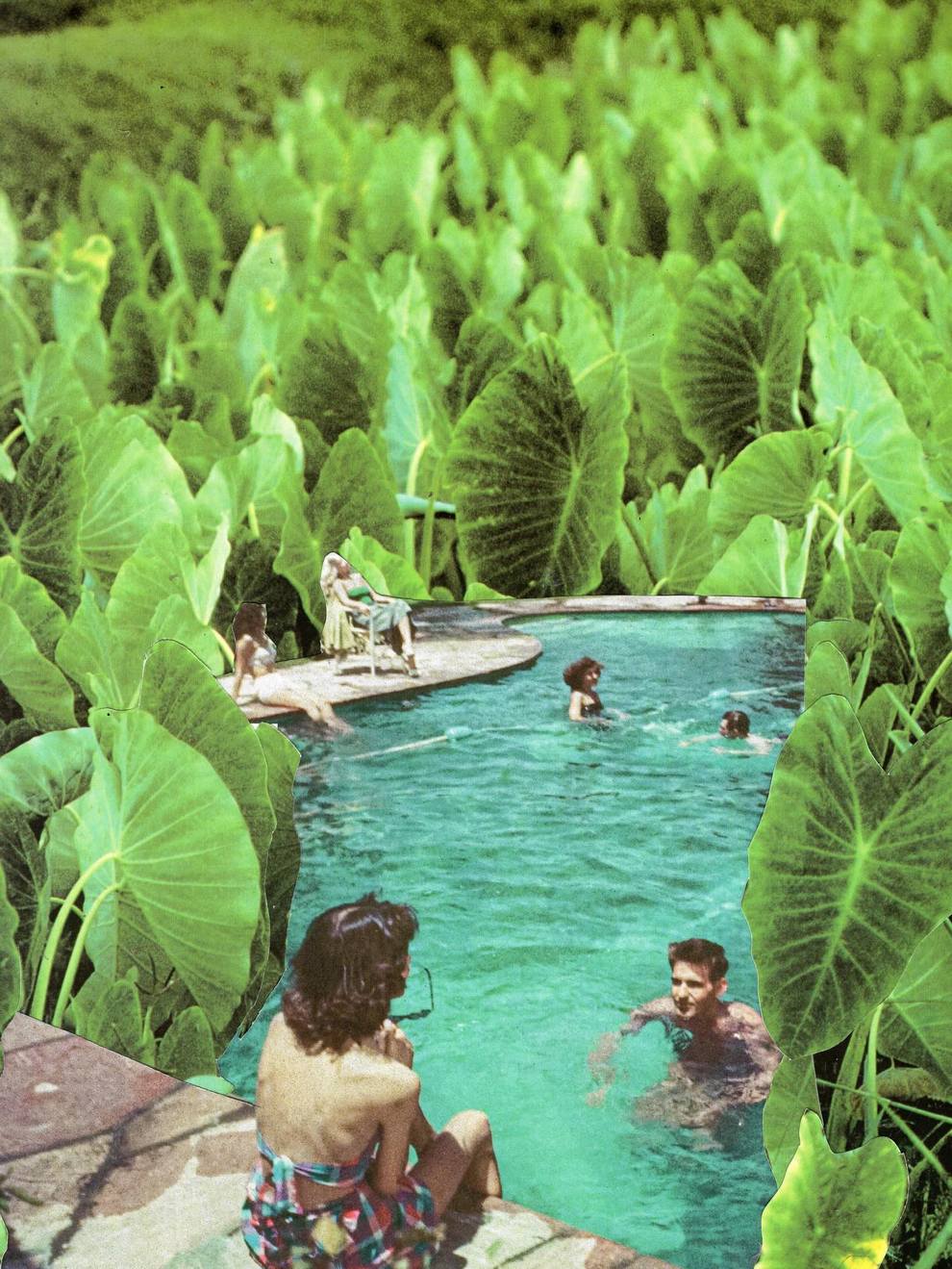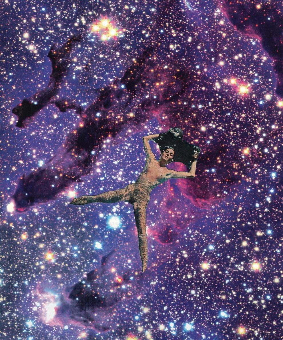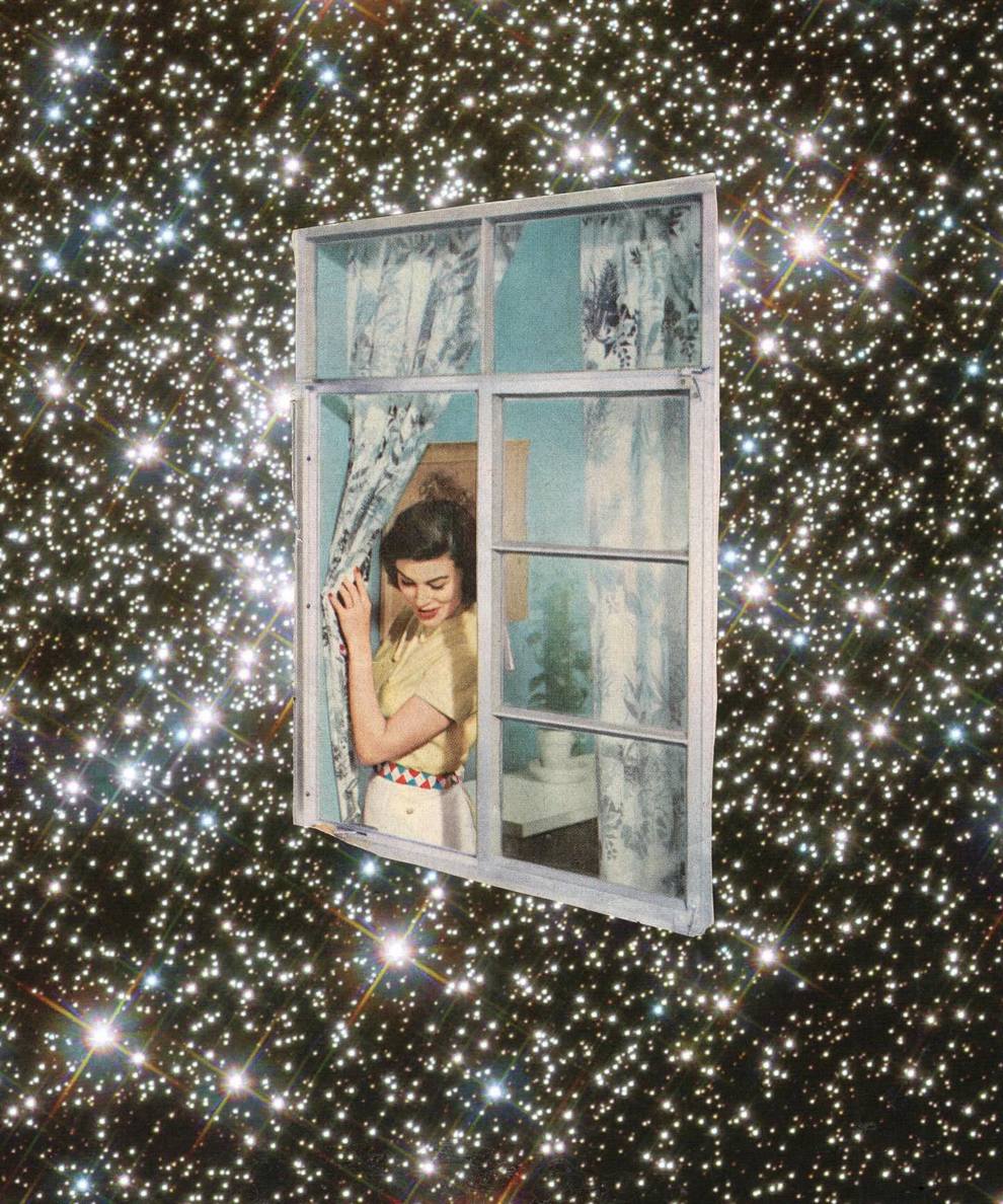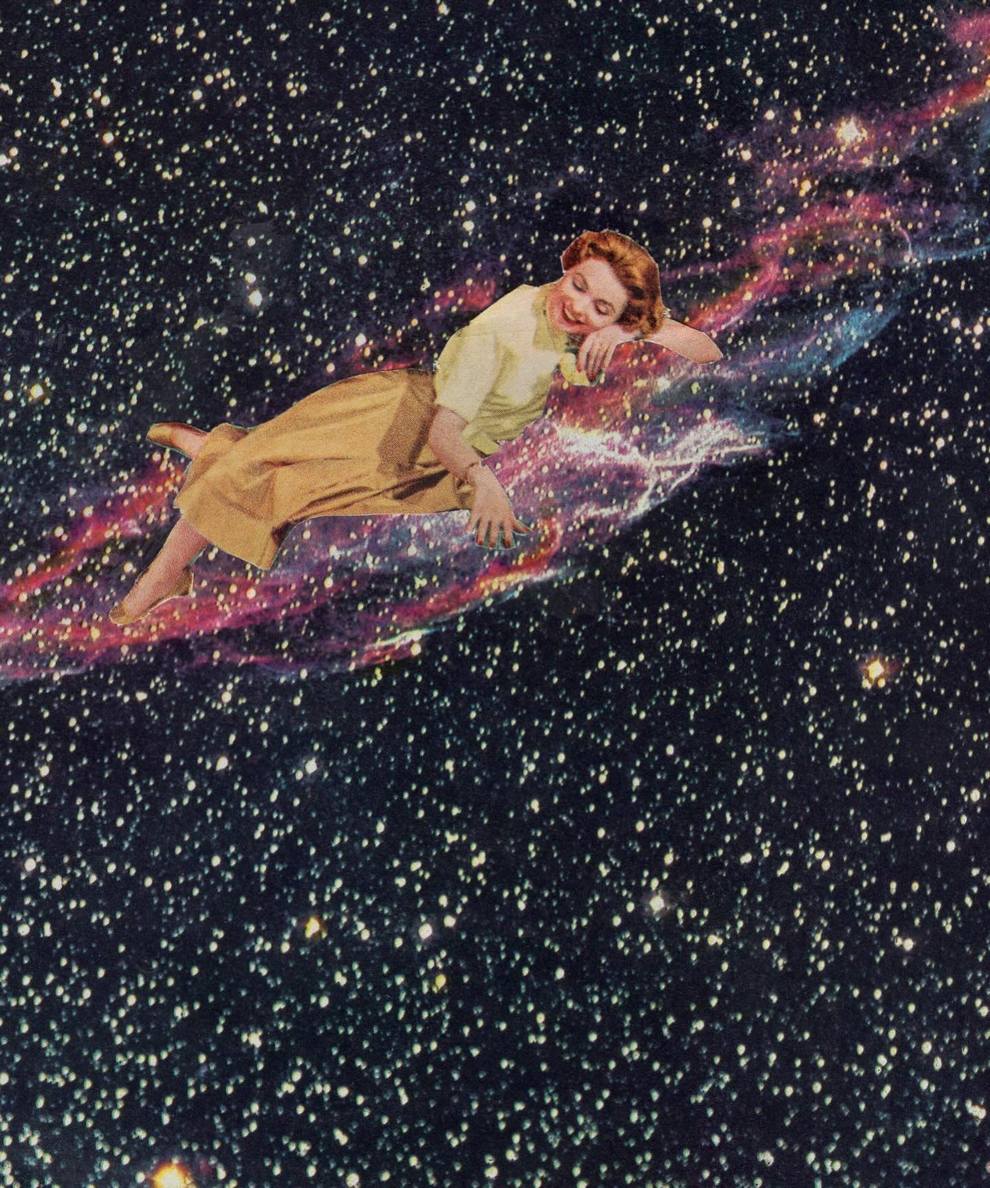 Goddard describes her artistic style as blending “Nostalgia & Whimsy,” crafting entirely analog collages using scissors, glue, and found imagery. She sources her materials from vintage magazines, old photography books, and thrifted media, which she meticulously cuts and rearranges to create surreal, dreamlike scenes. Her portfolio frequently explores the juxtaposition of human elements and vast natural landscapes, featuring recurring motifs like waterfalls seamlessly blending into domestic spaces, vintage figures adrift in starry skies, and playful plays on scale and perspective. Her work has been featured in international collage collectives and exhibited in local art shows, such as the Salón at the Parlour and the Papercuts exhibition.