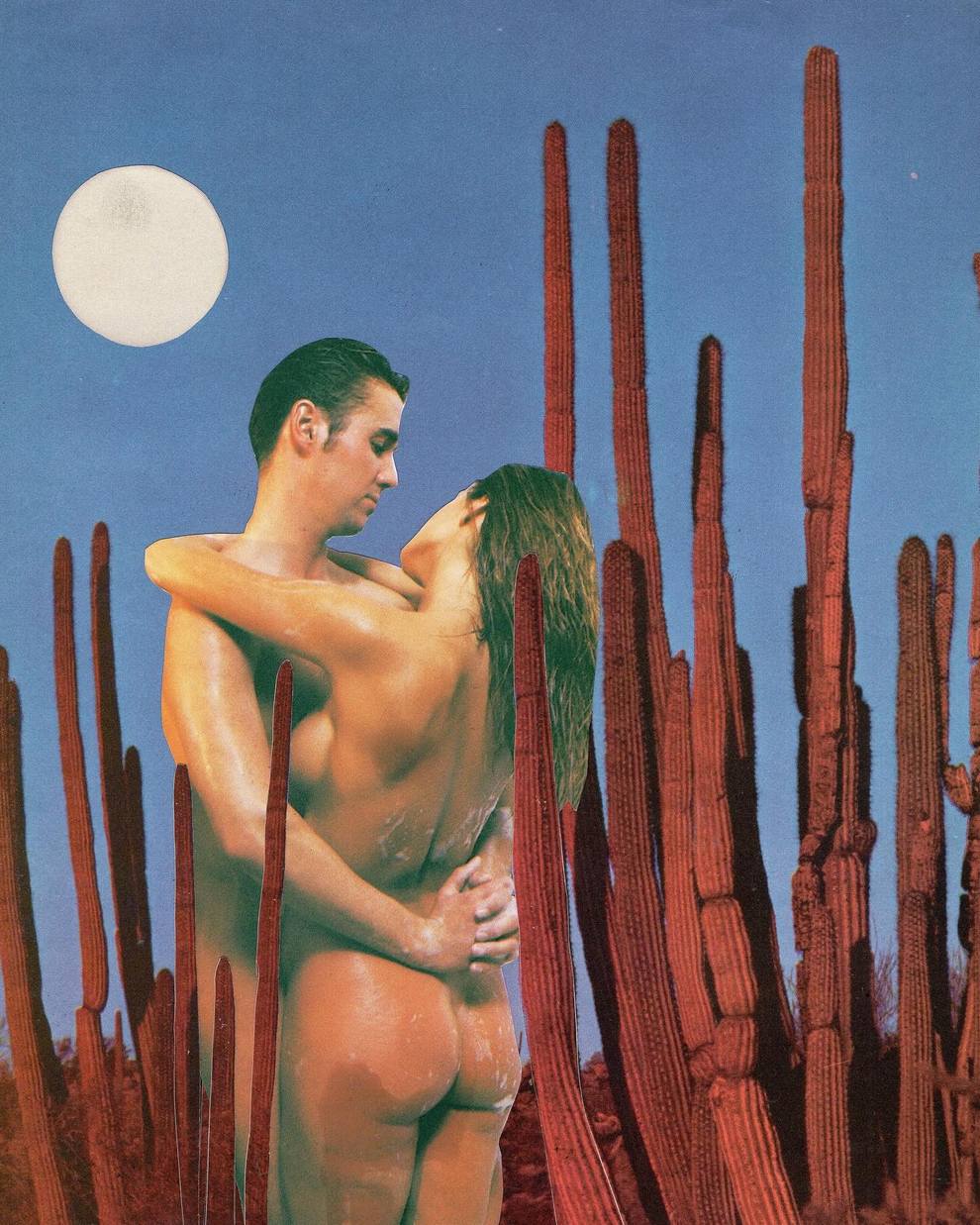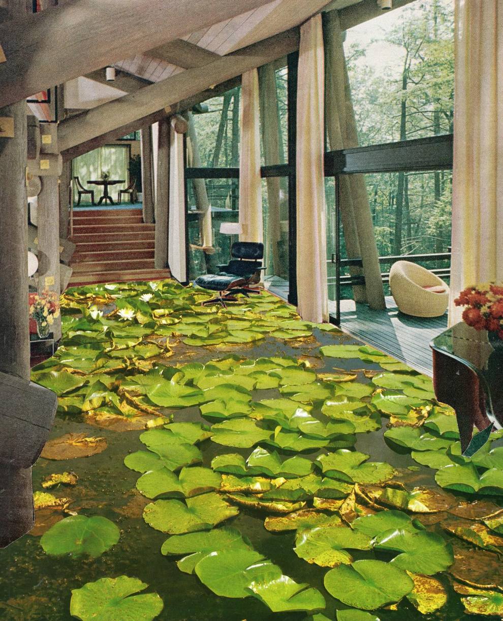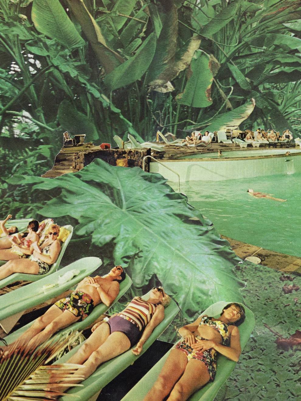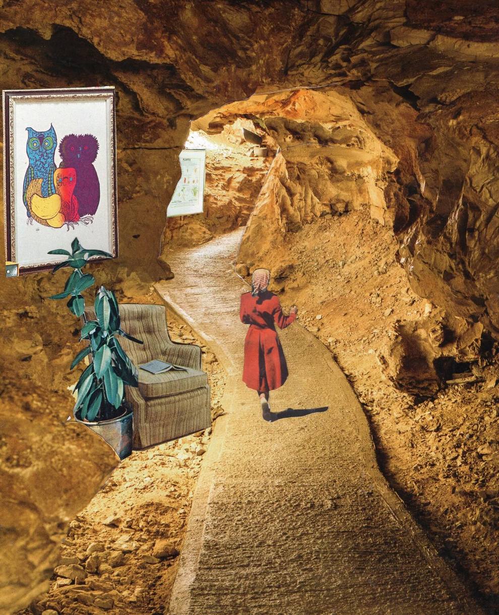 Goddard describes her artistic style as blending “Nostalgia & Whimsy,” crafting entirely analog collages using scissors, glue, and found imagery. She sources her materials from vintage magazines, old photography books, and thrifted media, which she meticulously cuts and rearranges to create surreal, dreamlike scenes. Her portfolio frequently explores the juxtaposition of human elements and vast natural landscapes, featuring recurring motifs like waterfalls seamlessly blending into domestic spaces, vintage figures adrift in starry skies, and playful plays on scale and perspective. Her work has been featured in international collage collectives and exhibited in local art shows, such as the Salón at the Parlour and the Papercuts exhibition.