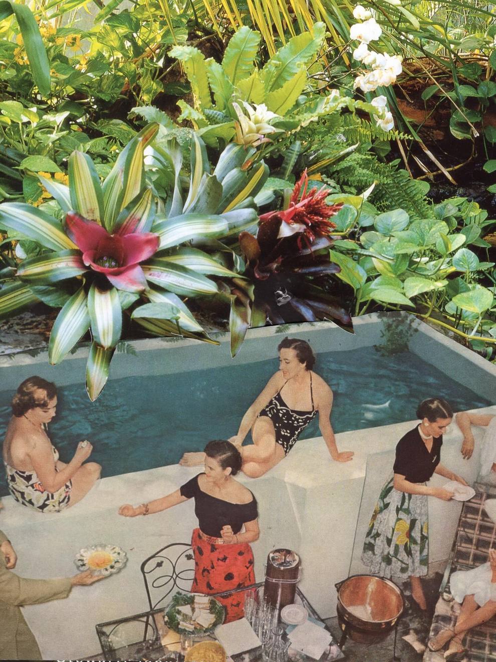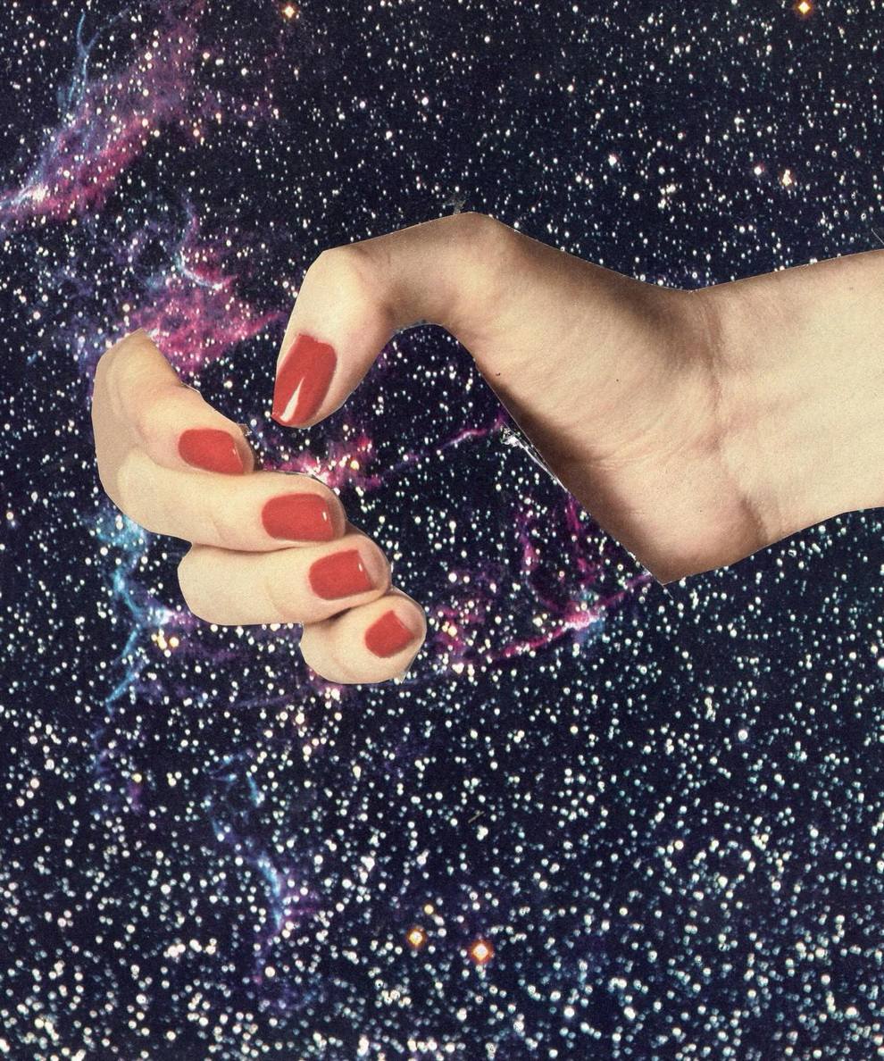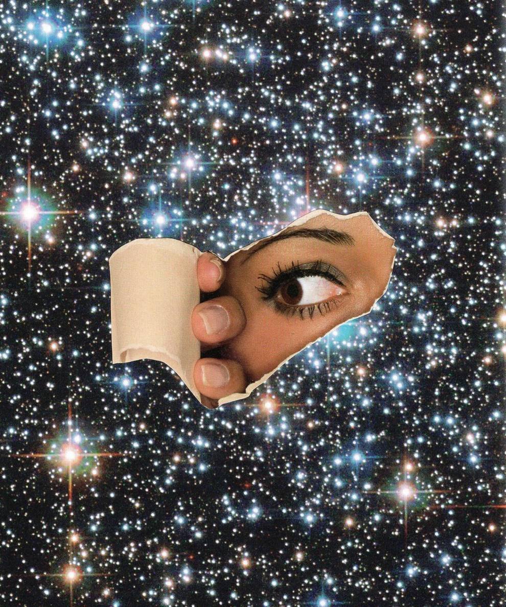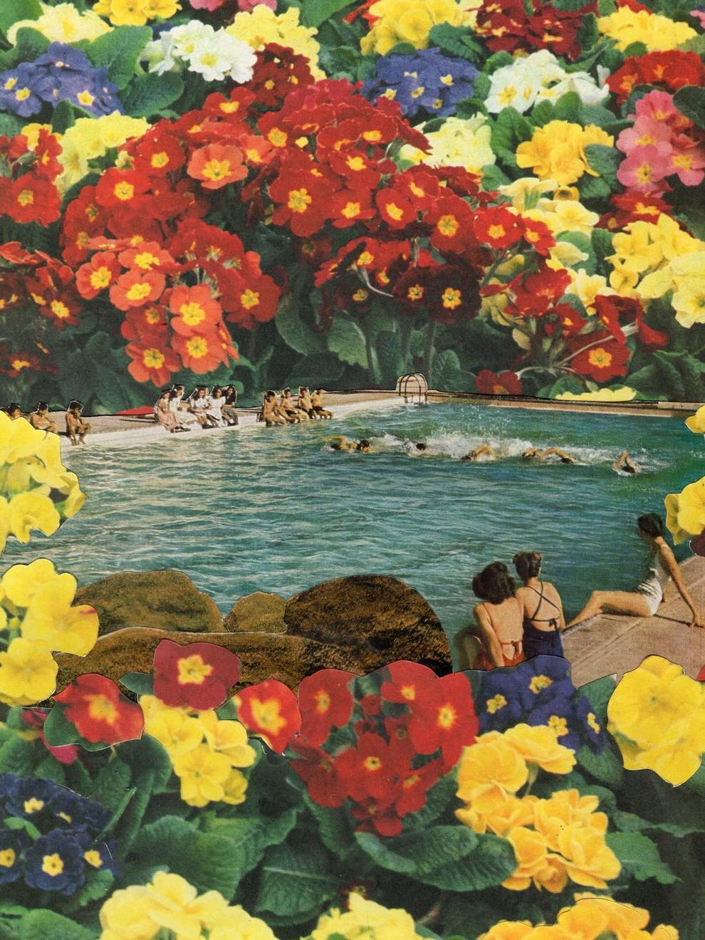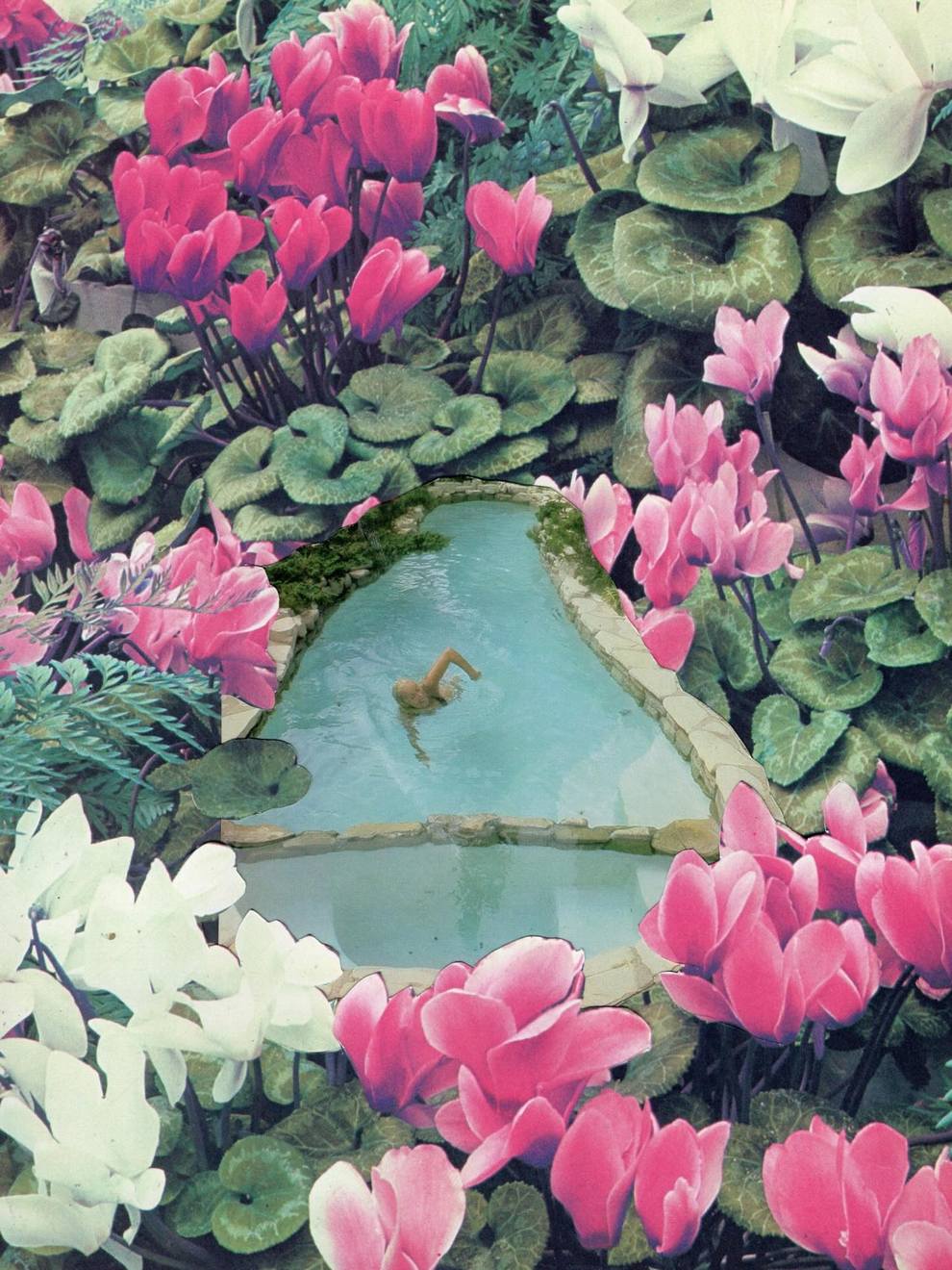 Goddard describes her artistic style as blending “Nostalgia & Whimsy,” crafting entirely analog collages using scissors, glue, and found imagery. She sources her materials from vintage magazines, old photography books, and thrifted media, which she meticulously cuts and rearranges to create surreal, dreamlike scenes. Her portfolio frequently explores the juxtaposition of human elements and vast natural landscapes, featuring recurring motifs like waterfalls seamlessly blending into domestic spaces, vintage figures adrift in starry skies, and playful plays on scale and perspective. Her work has been featured in international collage collectives and exhibited in local art shows, such as the Salón at the Parlour and the Papercuts exhibition.