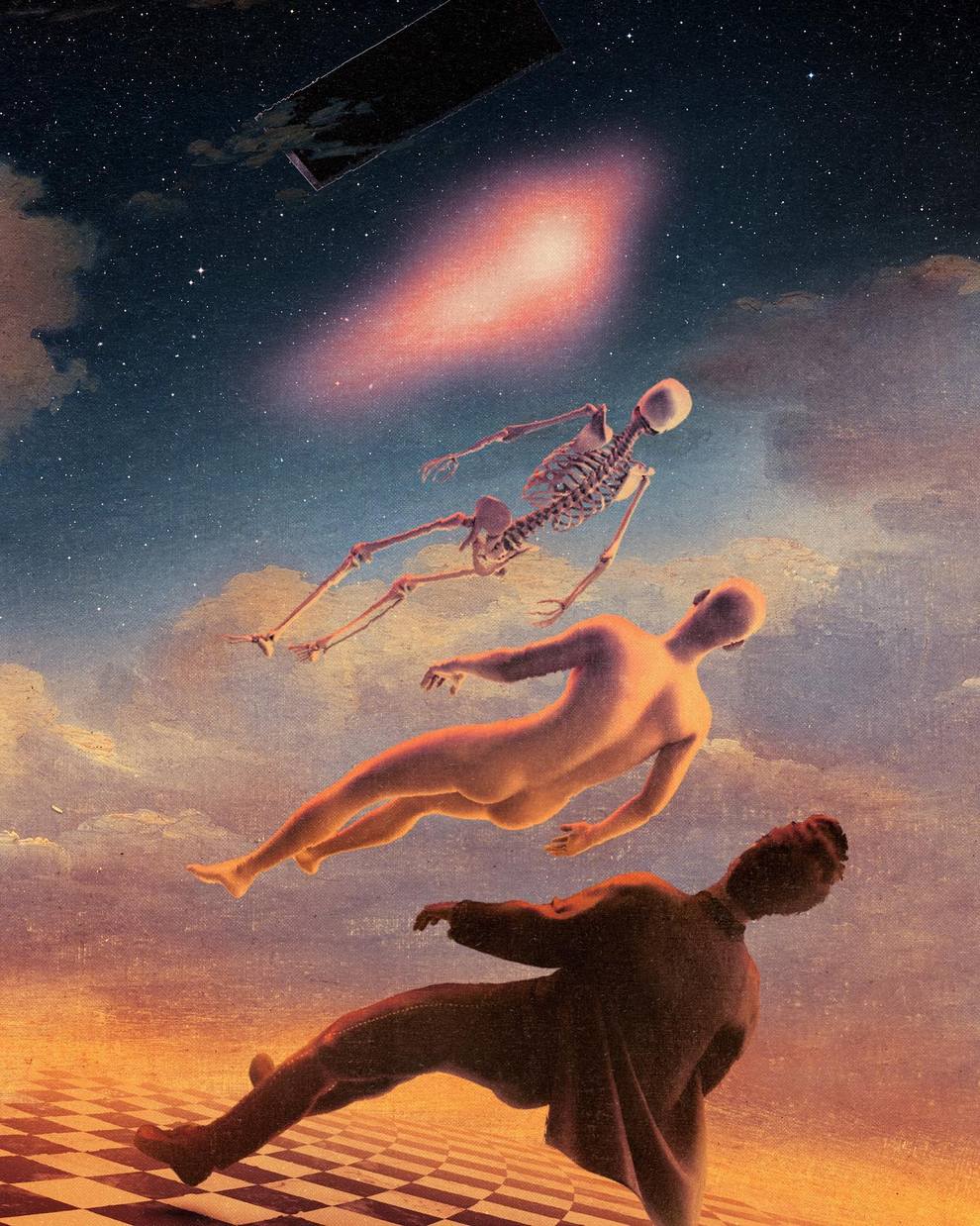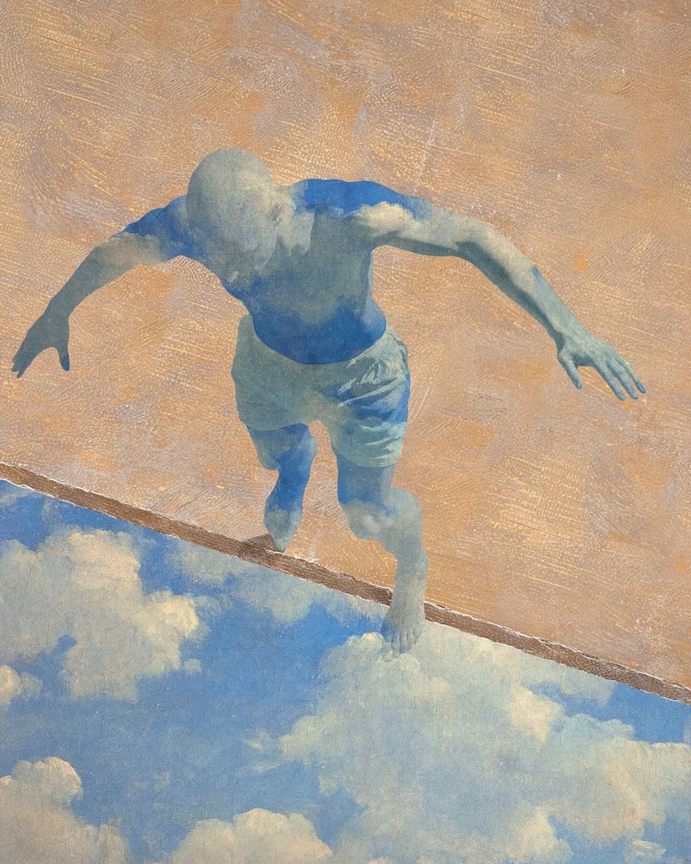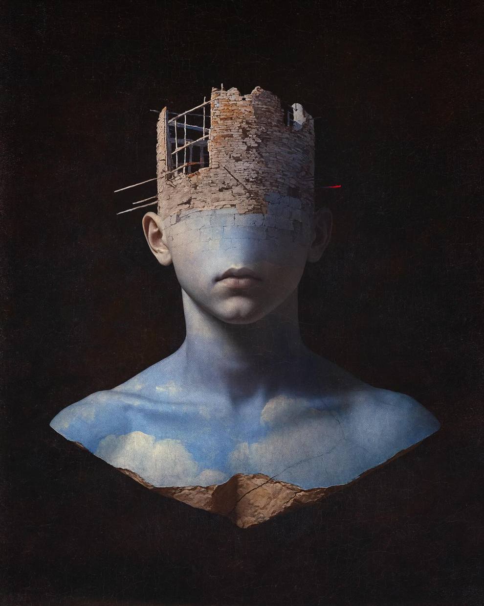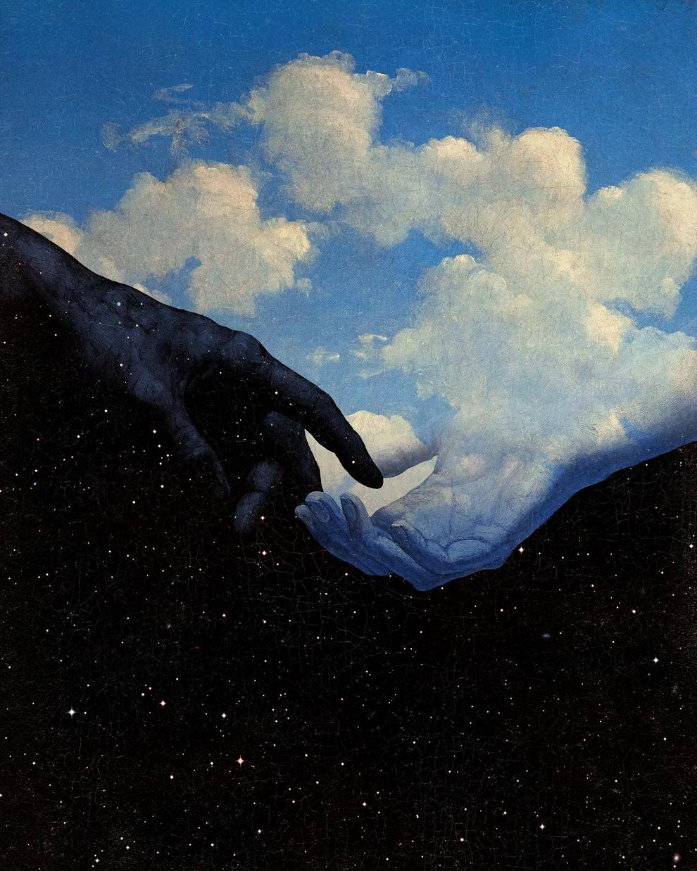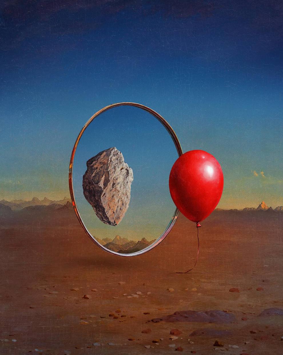 His practice merges classical paintings (public domain) with modern photography, 3D renders, AI, and personal sketches to form surreal, layered compositions. Méndez’s aesthetic blends M.C. Escher’s precision, René Magritte’s surrealism, Miles Johnston’s dreamlike atmospheres, and Eduardo Recife’s textured nostalgia.