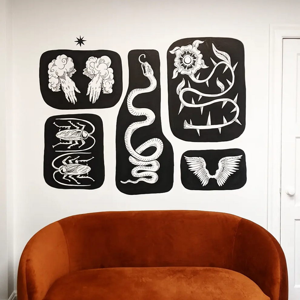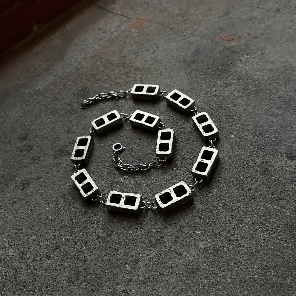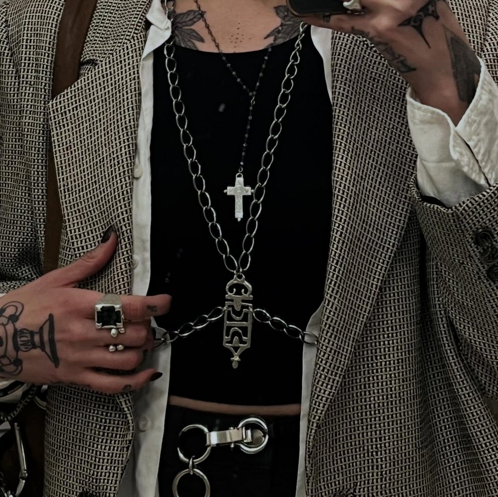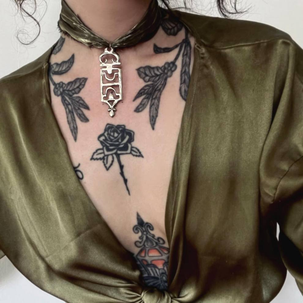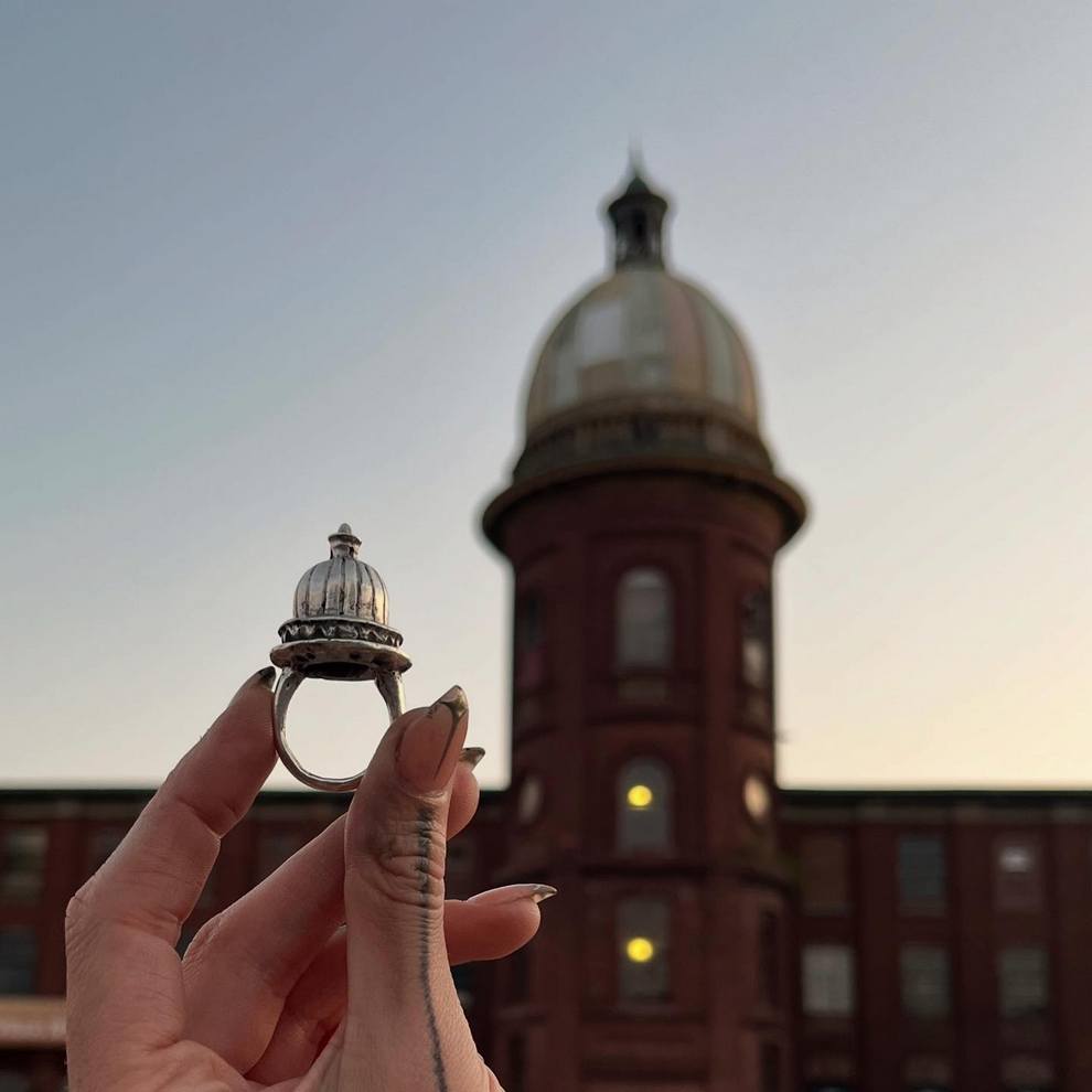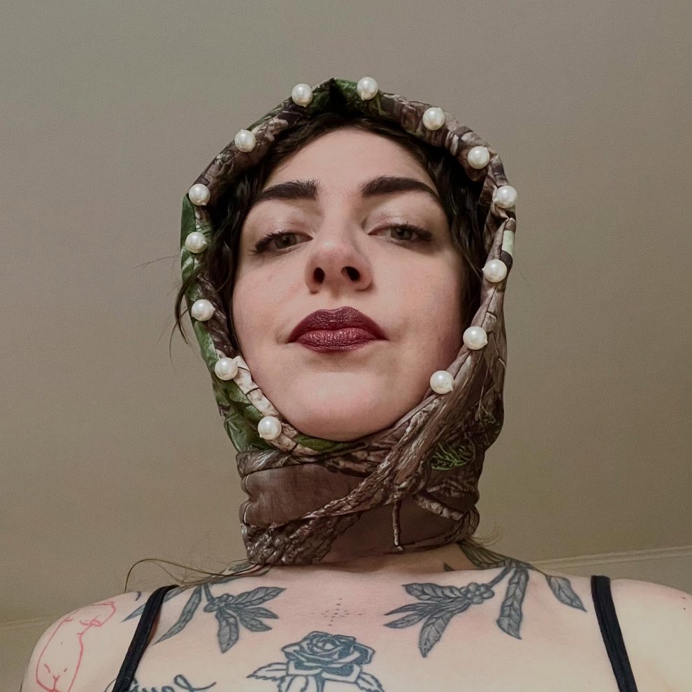 Mary Lindberg is a Providence-based visual artist whose work blends wearable art, dark folk aesthetics, and sculptural metal design. Her recent output moves between painted textiles, nature-driven imagery, and striking jewelry-like objects such as “Athena Hair Armor” and the “Cinder Block Chain”.