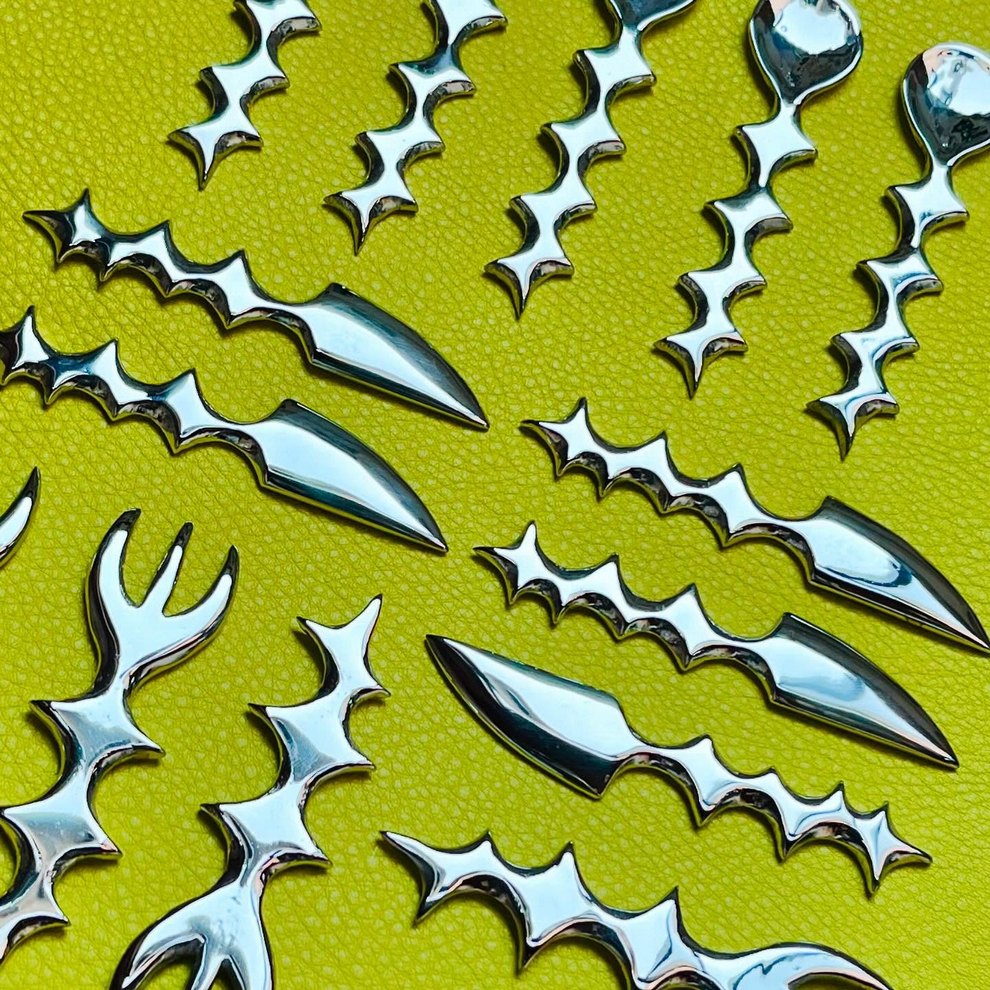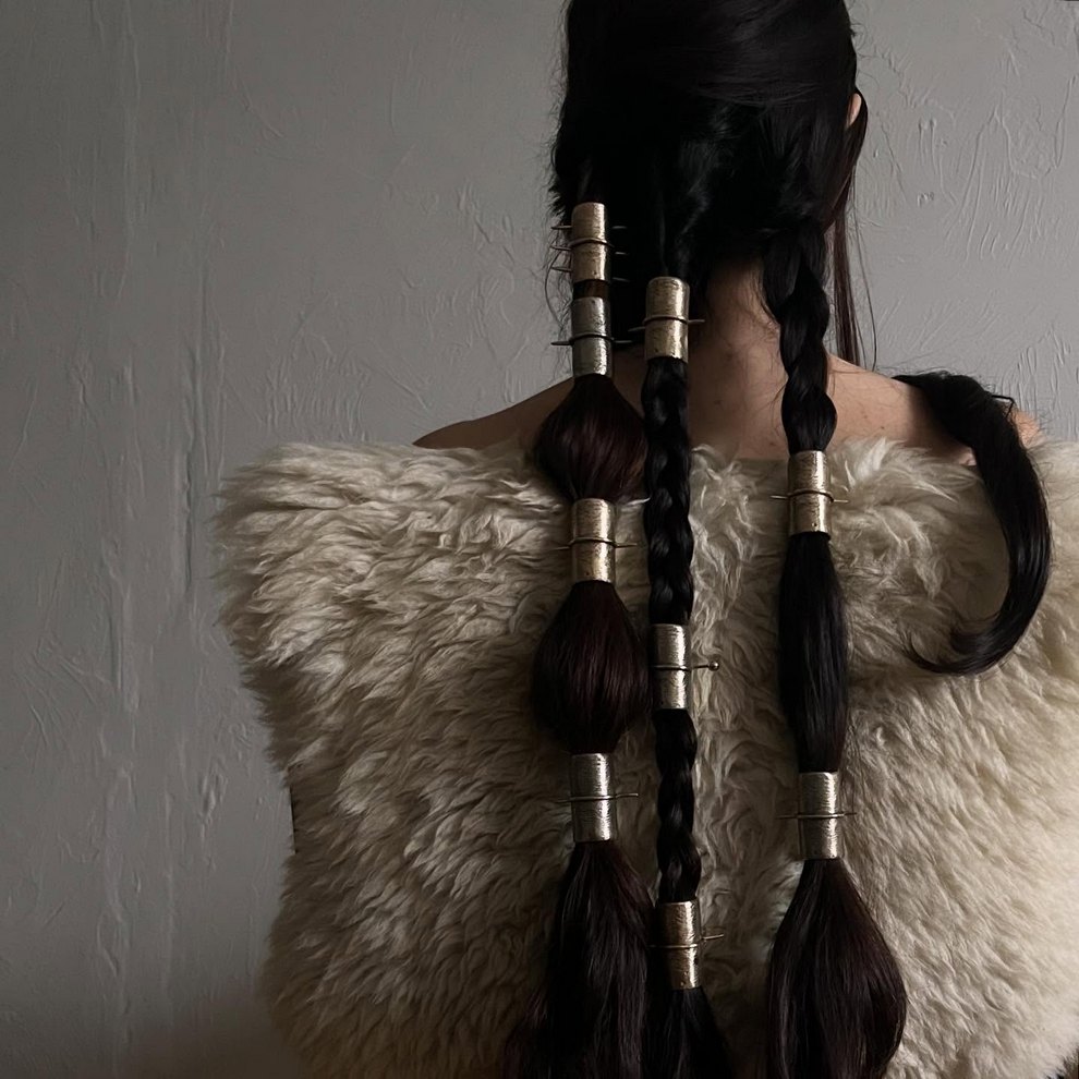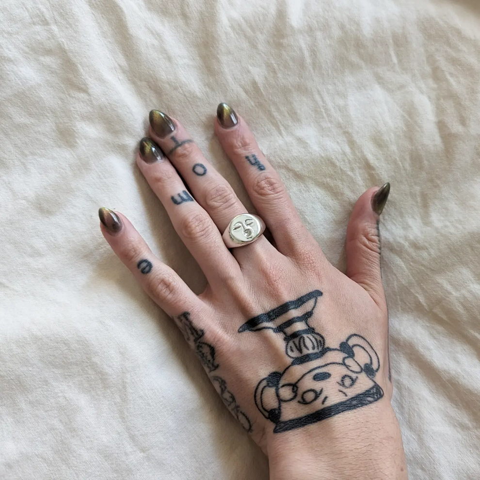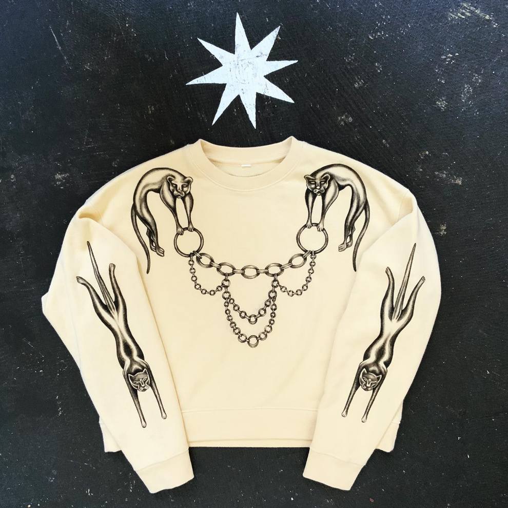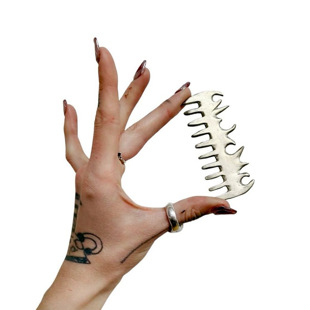Her practice combines mystical, nature-centered themes with a rougher handmade aesthetic rooted in clothing, objects, and personal adornment. She has also become known for custom-painted garments and accessories, alongside tactile metal pieces that feel part fashion object, part sculpture, and part ritual artifact.
