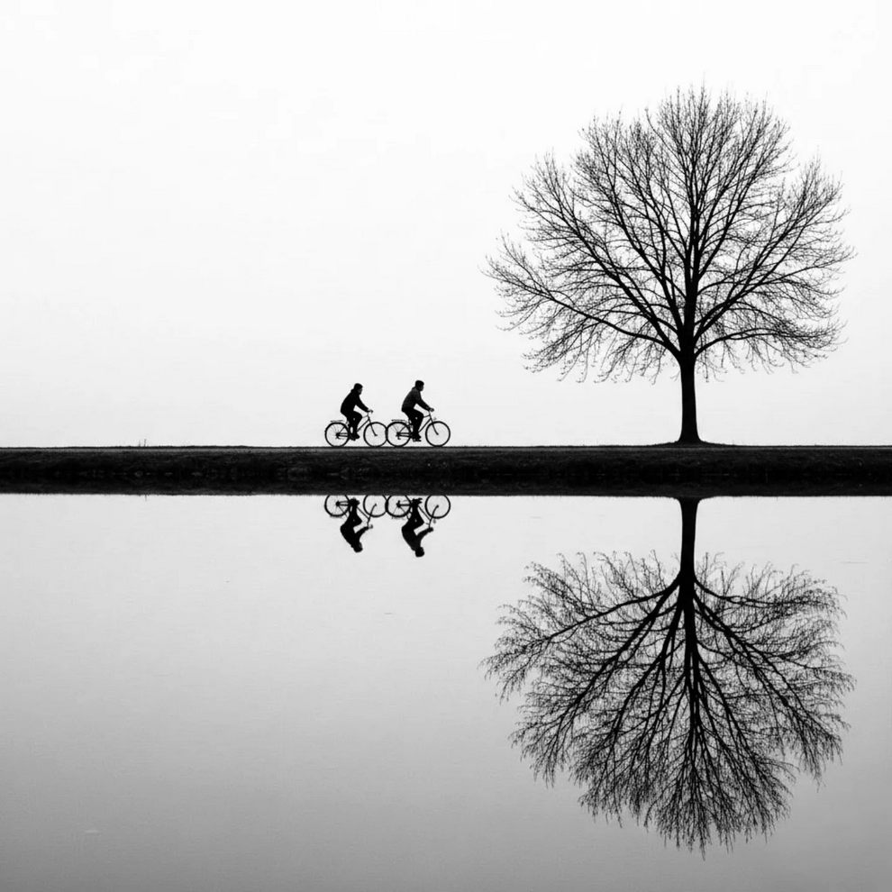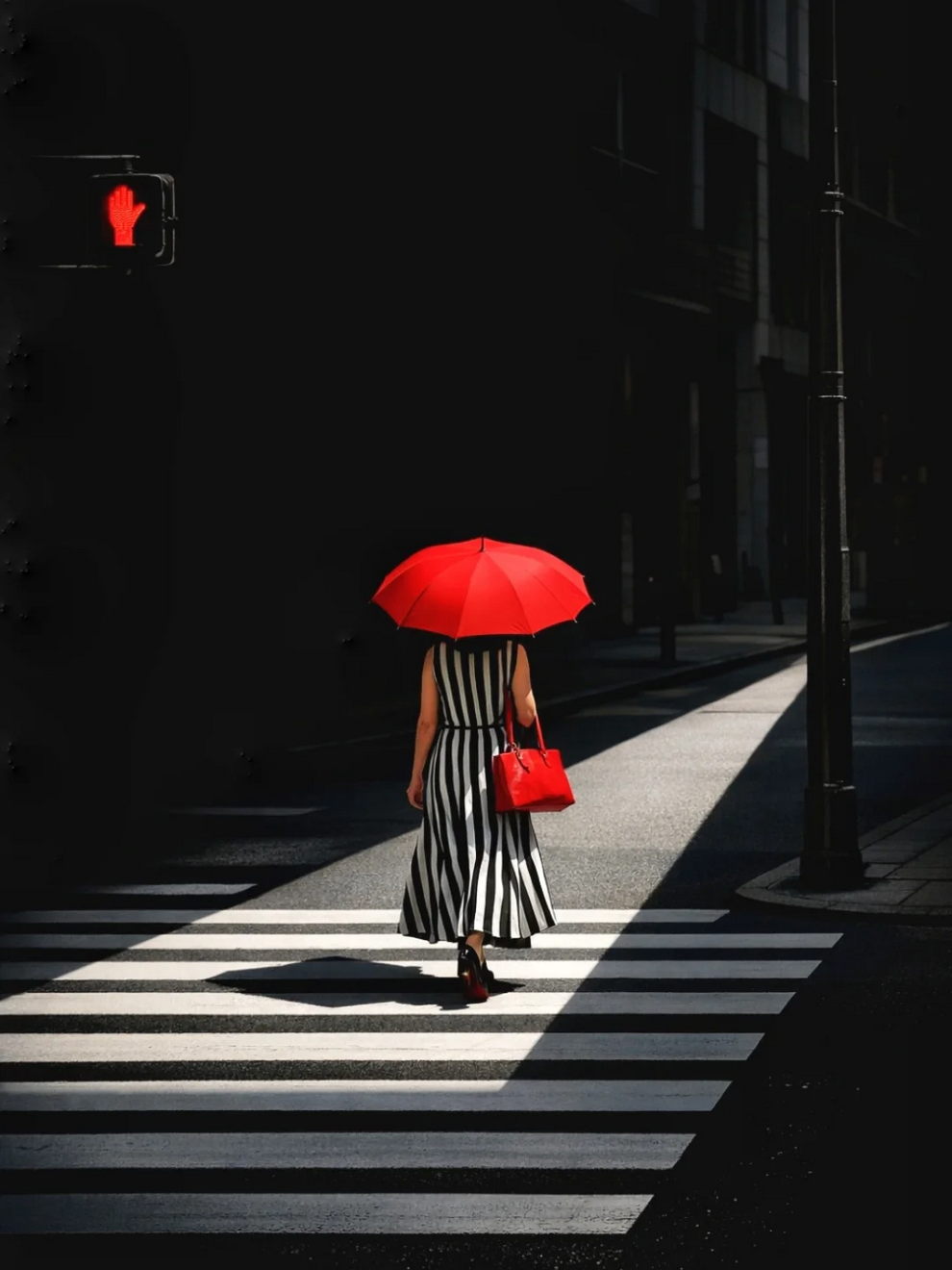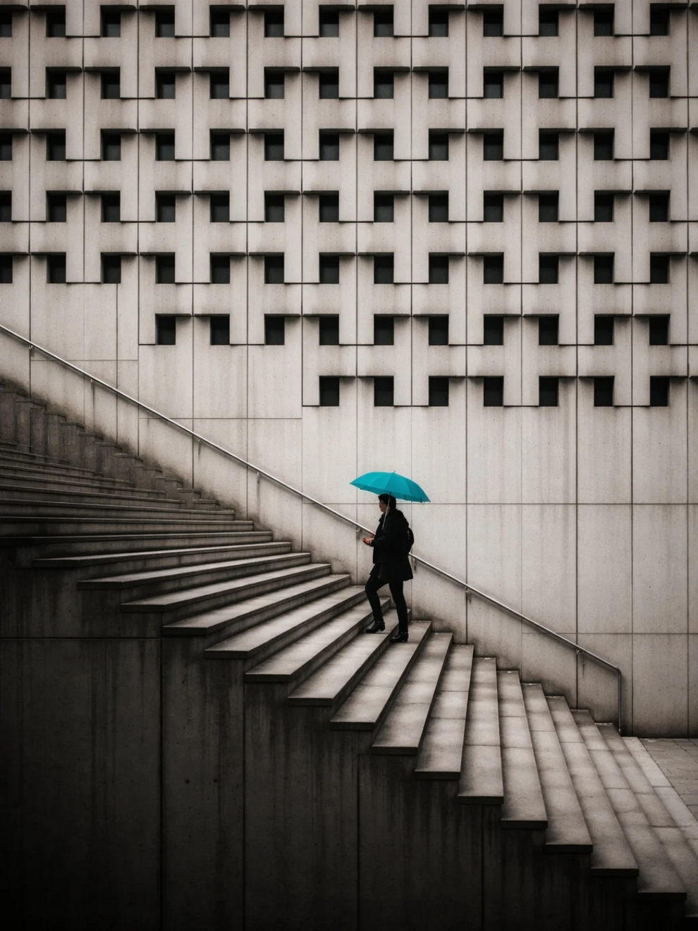 The hallmark of Andy’s photography is “conceptual minimalism”. He frequently employs stark architectural geometries, spirals, and deep shadows, heavily utilizing a specific color palette that leans toward stark black-and-white photography punctuated by bold, isolated flashes of red (such as a red umbrella or a red circle). His work turns chaotic street or coastal scenes into highly poetic, almost surreal graphic compositions by masterfully manipulating natural light (“shadow and light”), golden hour reflections, and negative space.