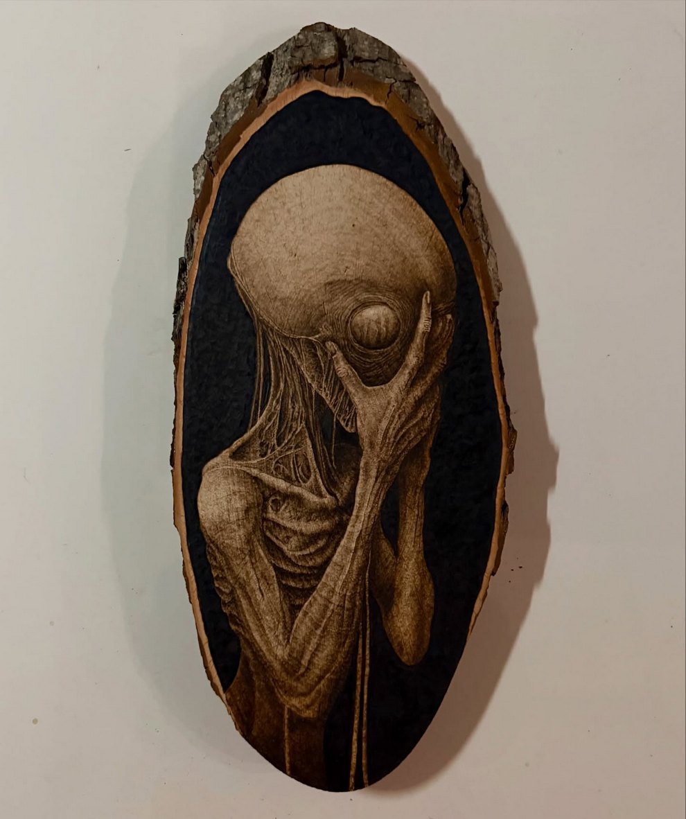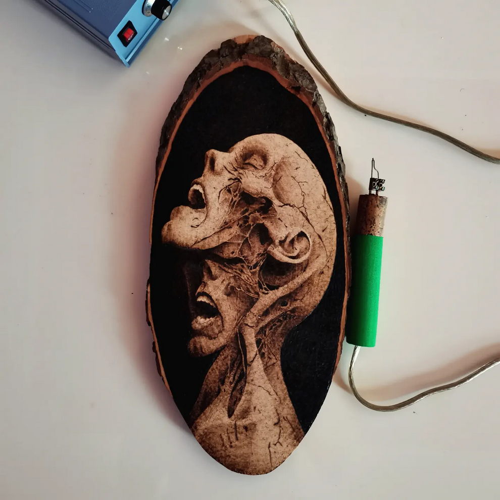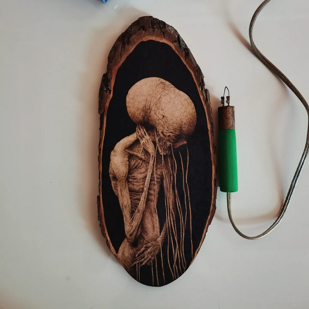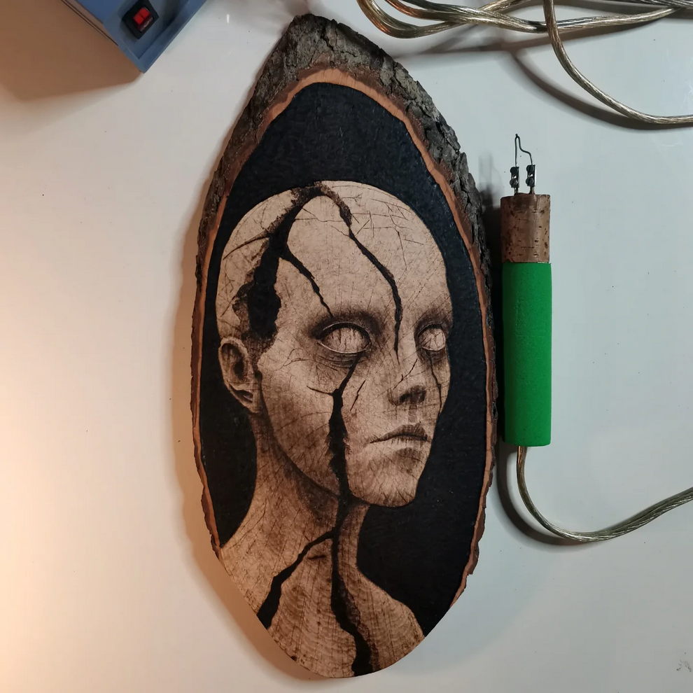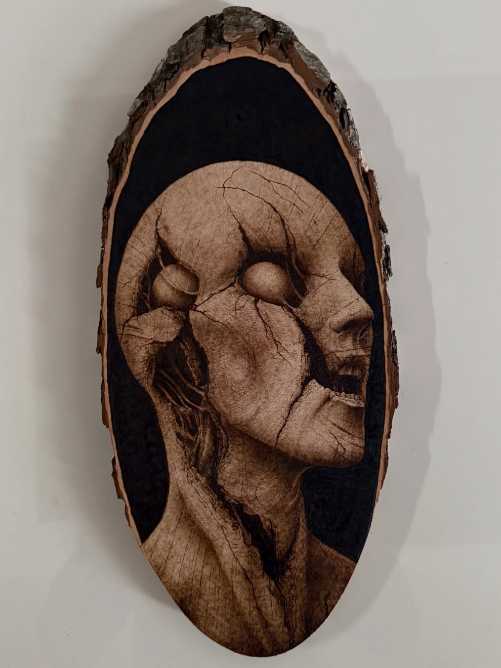 Robb’s work is heavily rooted in “dark art,” utilizing the monochromatic, sepia-toned nature of pyrography to create moody and psychological imagery. His portfolio frequently explores themes of identity, isolation, and the human psyche, with pieces questioning concepts like “how long can you wear a mask before you forget who you truly are”. By varying the heat and pressure of his wood-burning tools, he achieves stunning gradients and hyper-detailed shading, transforming raw wood panels into haunting, surreal portraits and conceptual illustrations.