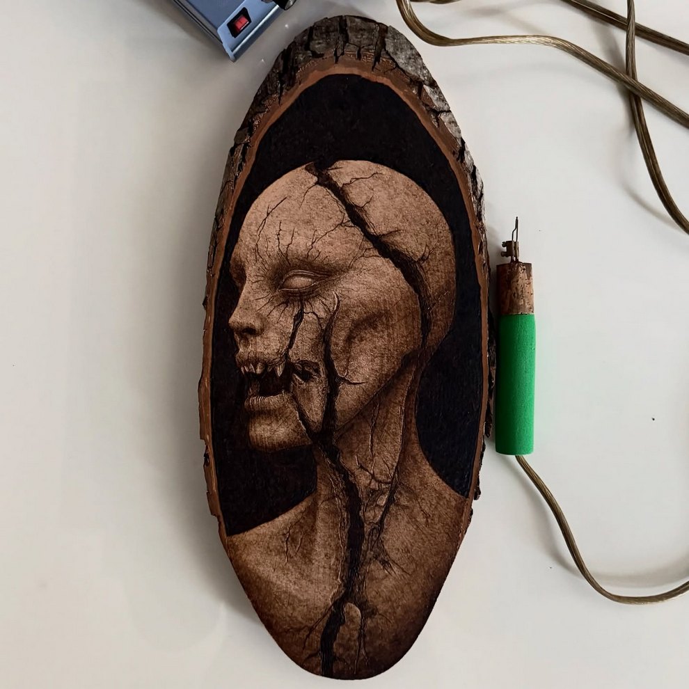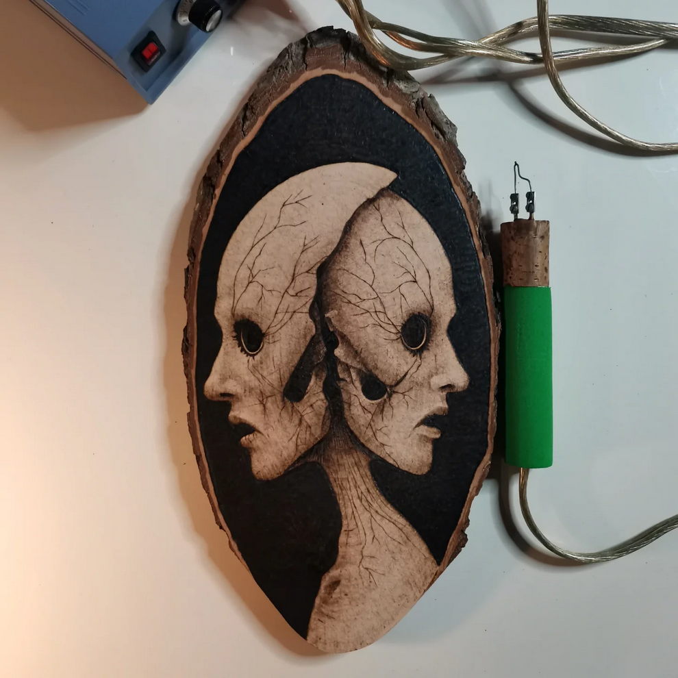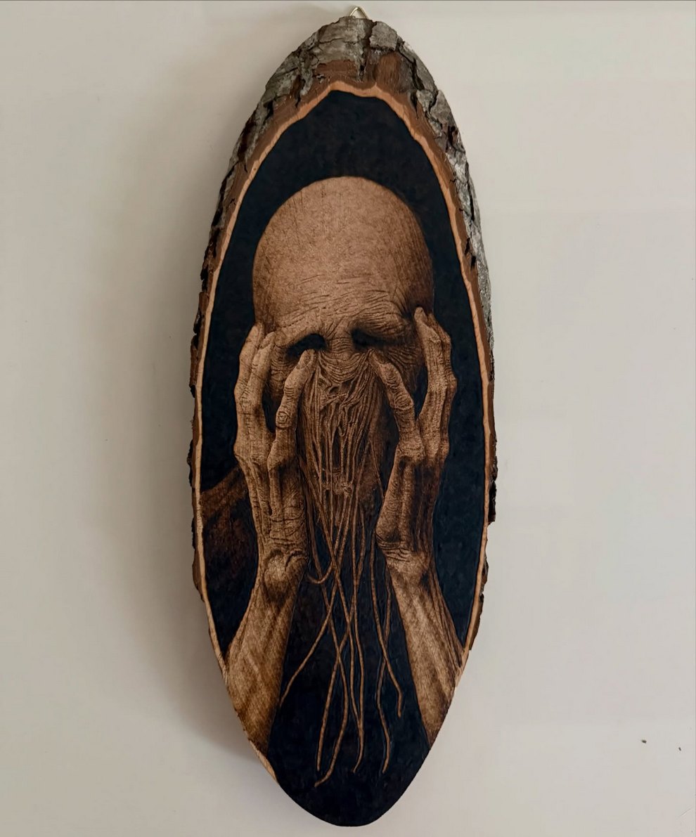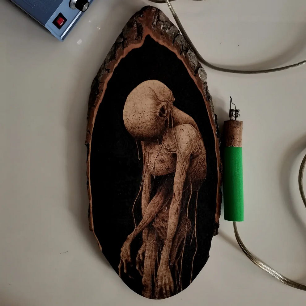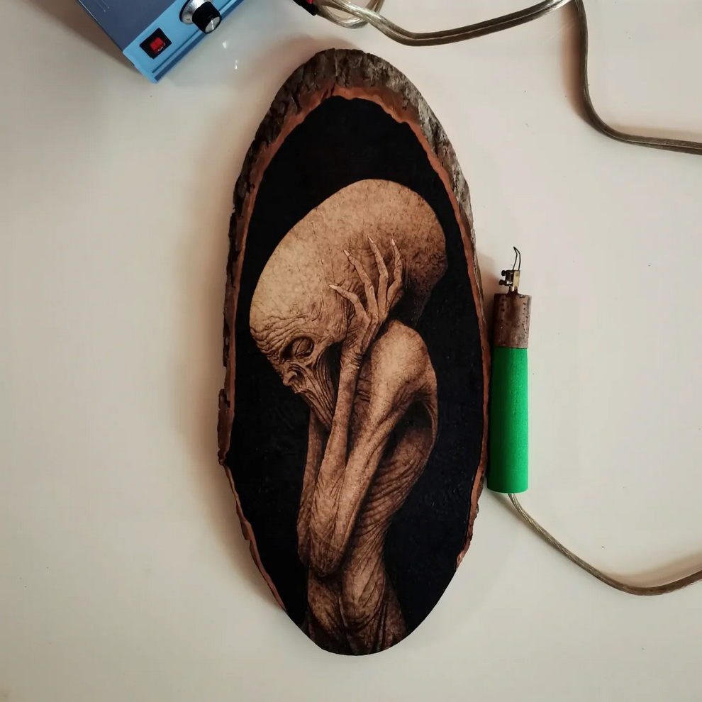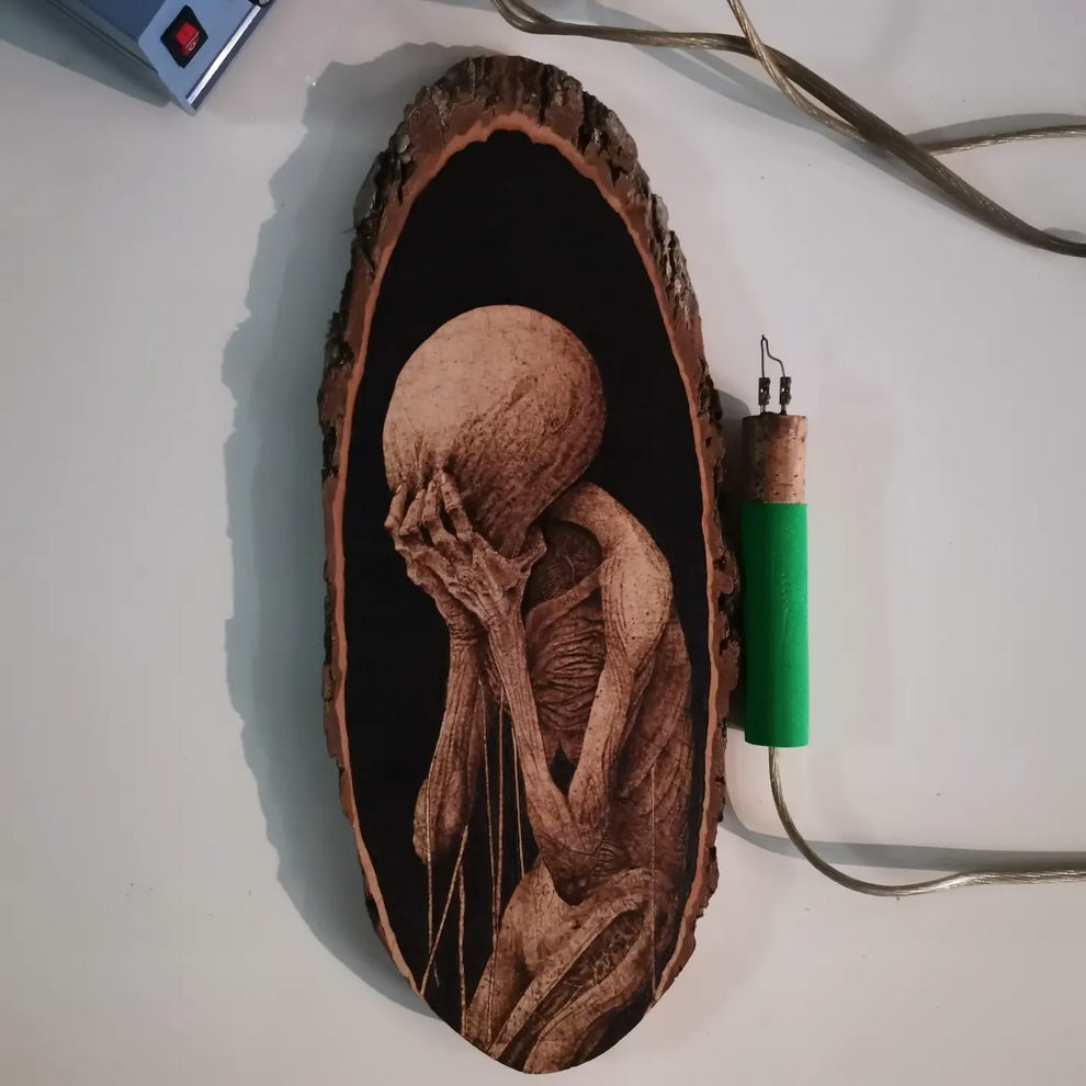Robb’s work is heavily rooted in “dark art,” utilizing the monochromatic, sepia-toned nature of pyrography to create moody and psychological imagery. His portfolio frequently explores themes of identity, isolation, and the human psyche, with pieces questioning concepts like “how long can you wear a mask before you forget who you truly are”. By varying the heat and pressure of his wood-burning tools, he achieves stunning gradients and hyper-detailed shading, transforming raw wood panels into haunting, surreal portraits and conceptual illustrations.