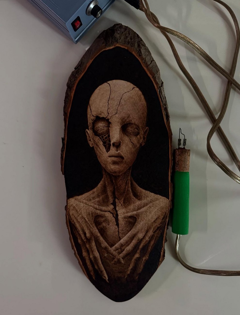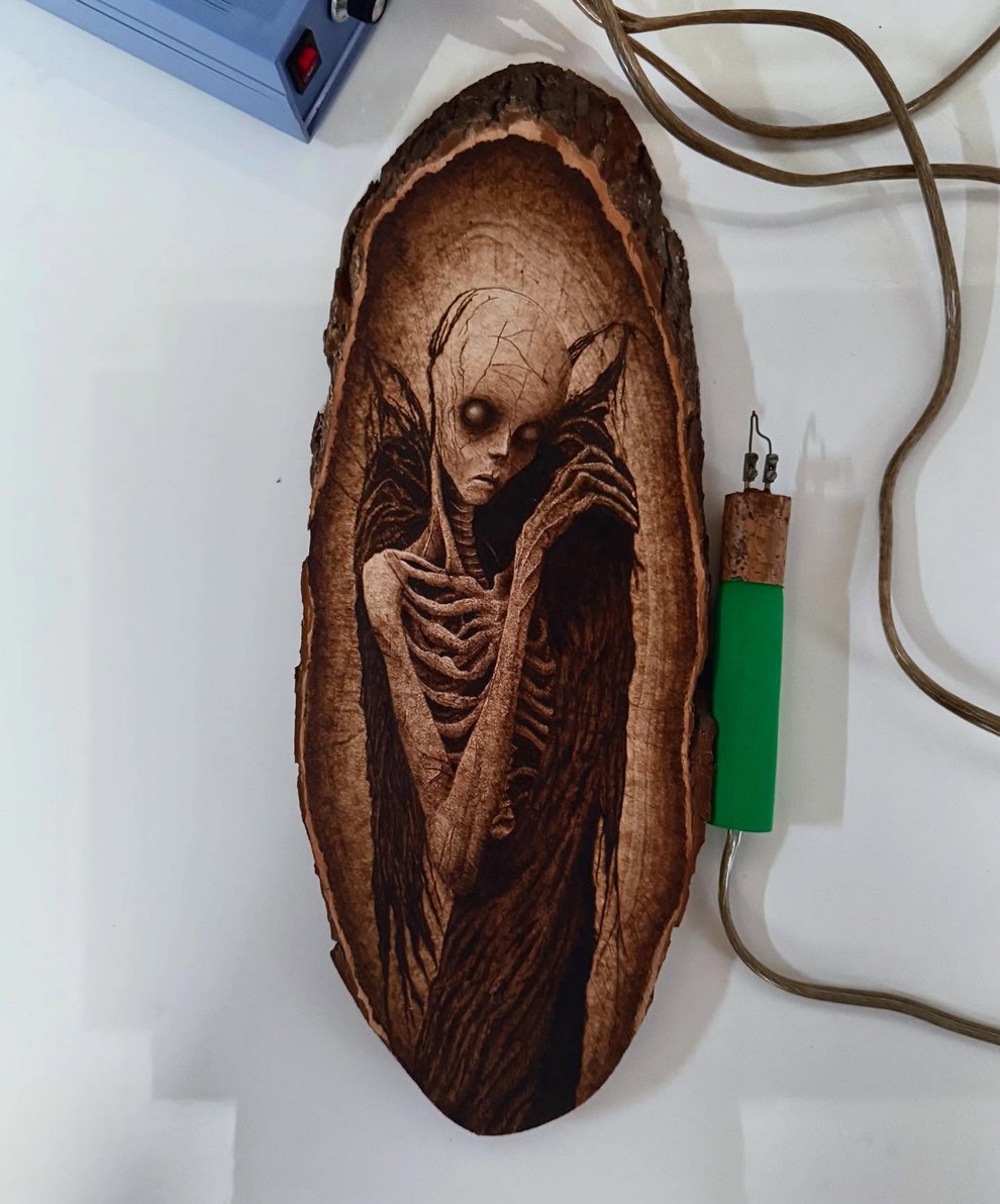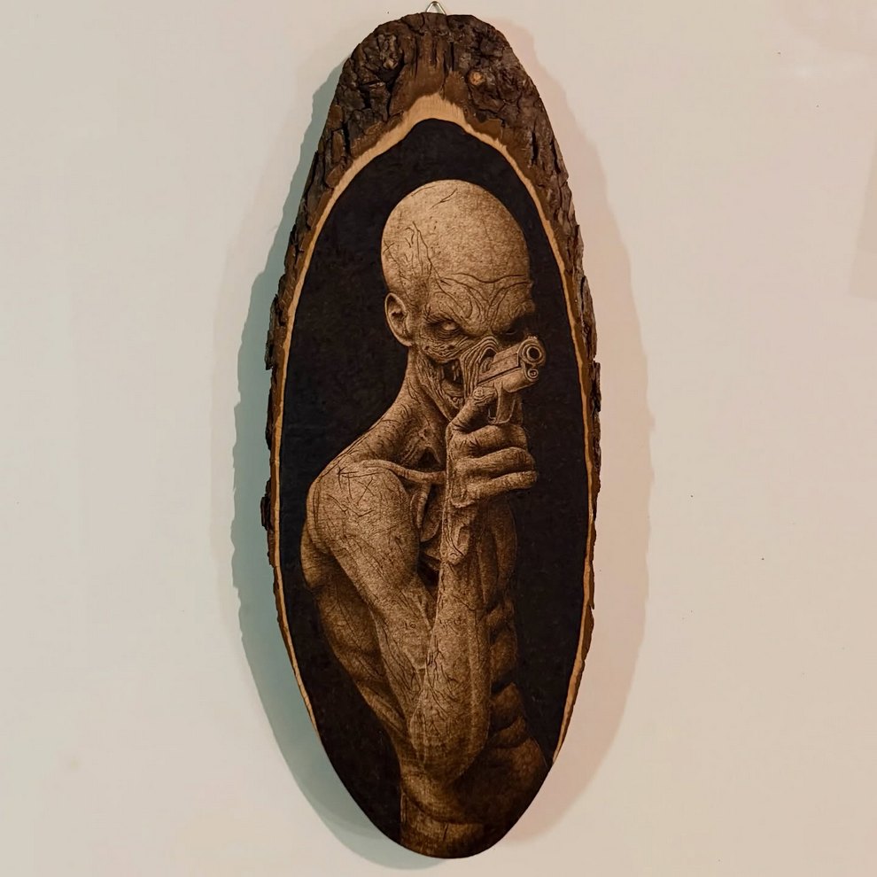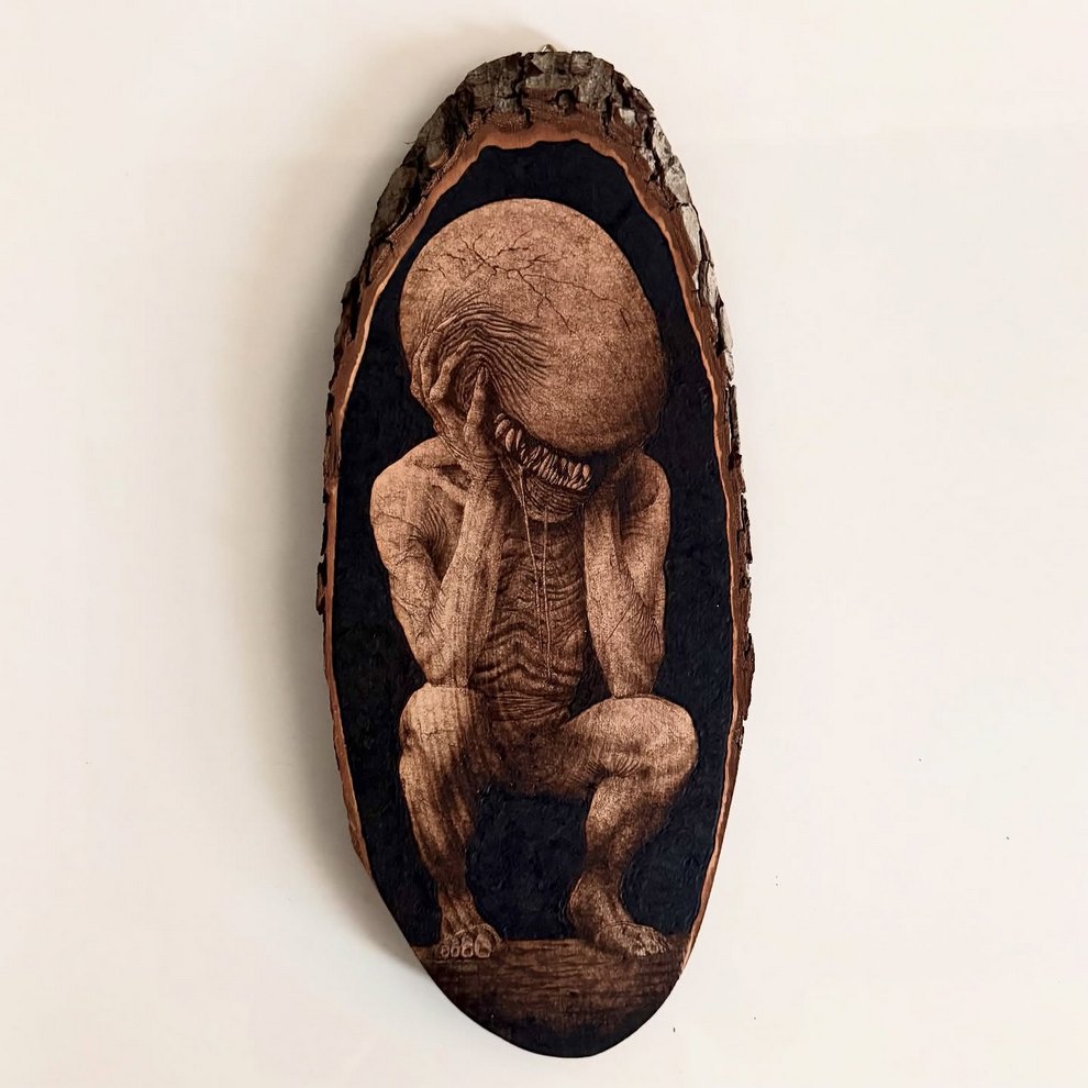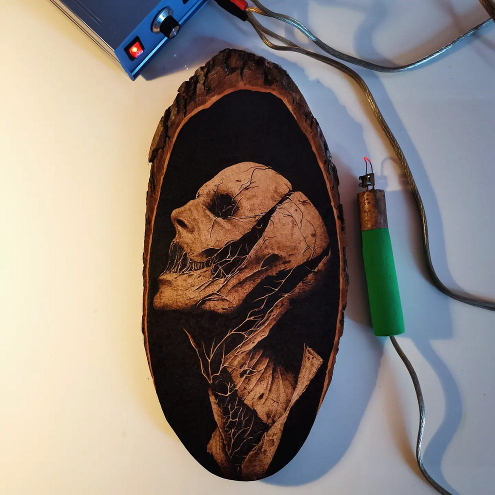 Robb’s work is heavily rooted in “dark art,” utilizing the monochromatic, sepia-toned nature of pyrography to create moody and psychological imagery. His portfolio frequently explores themes of identity, isolation, and the human psyche, with pieces questioning concepts like “how long can you wear a mask before you forget who you truly are”. By varying the heat and pressure of his wood-burning tools, he achieves stunning gradients and hyper-detailed shading, transforming raw wood panels into haunting, surreal portraits and conceptual illustrations.