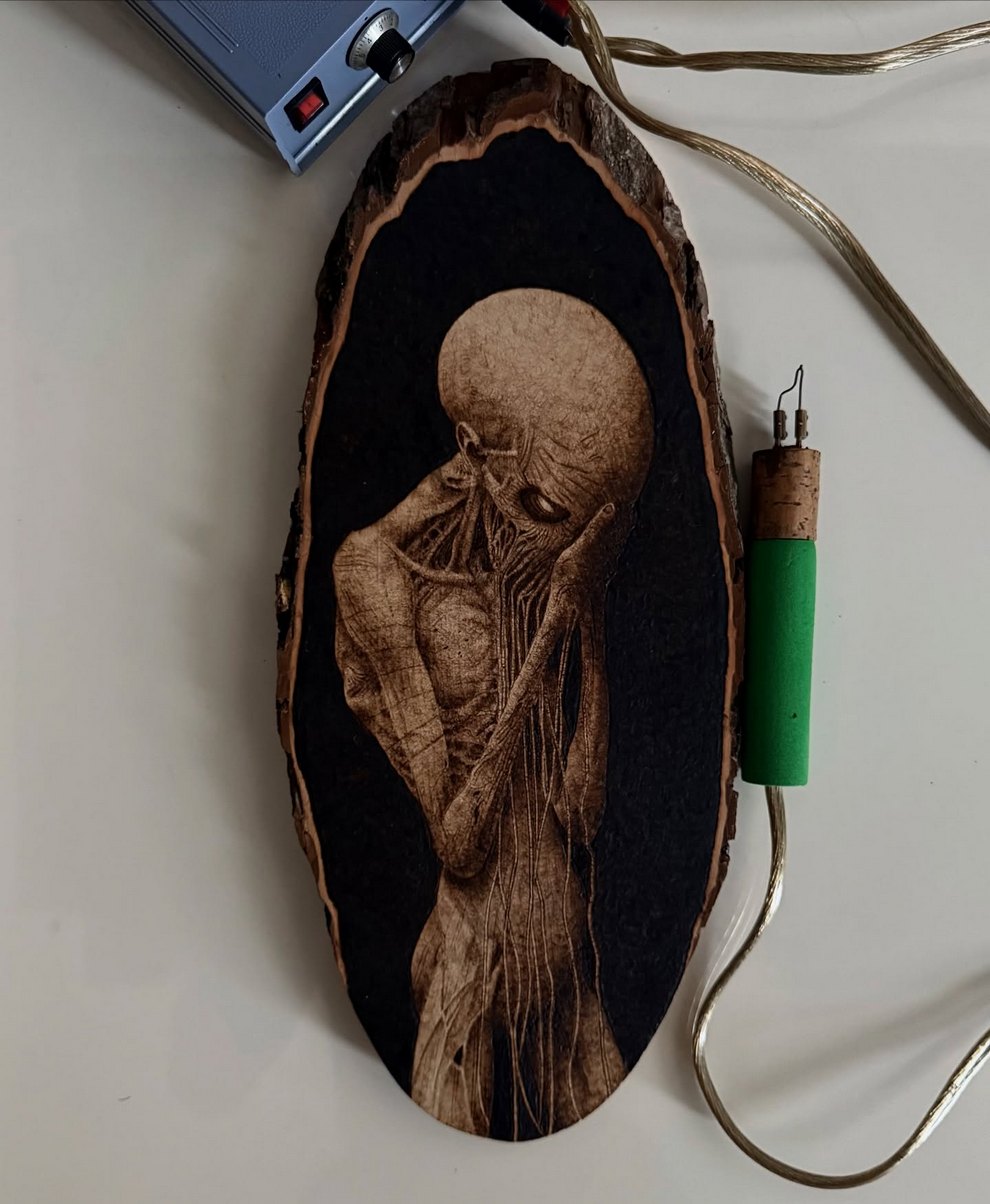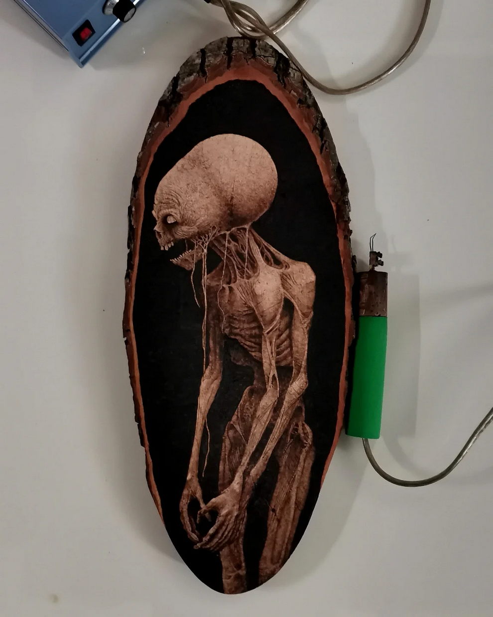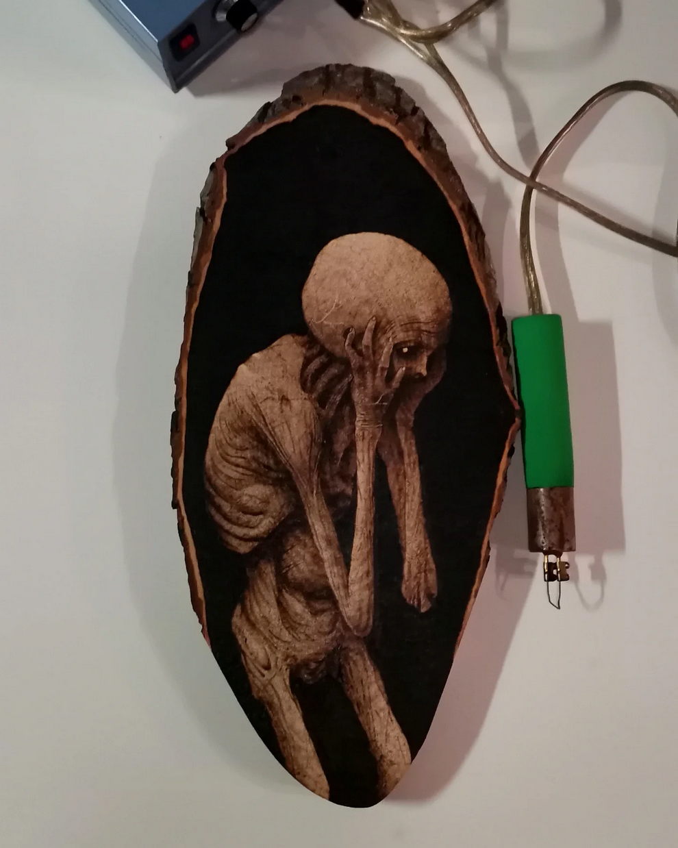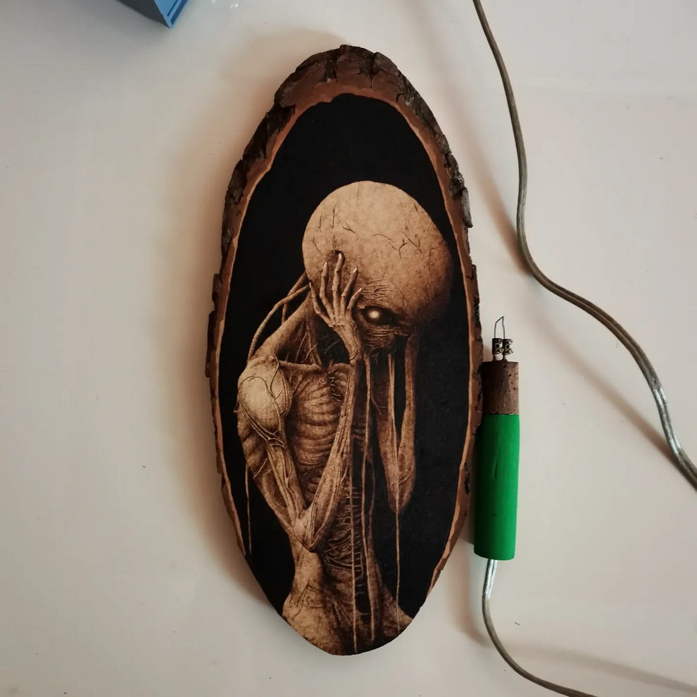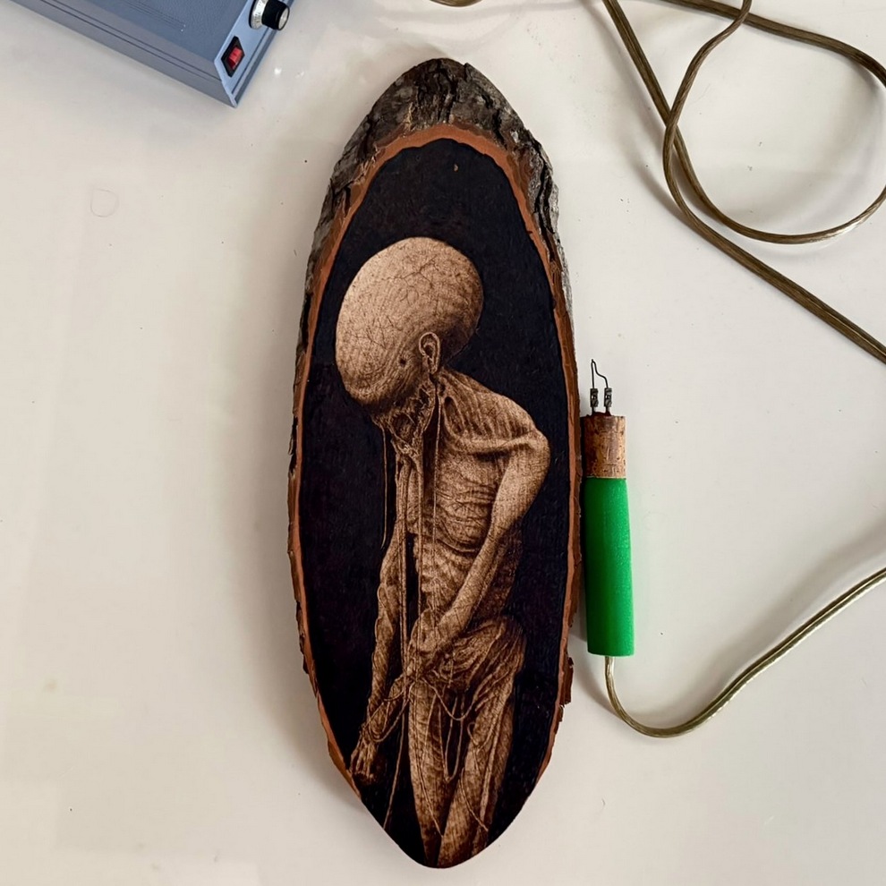 Robb’s work is heavily rooted in “dark art,” utilizing the monochromatic, sepia-toned nature of pyrography to create moody and psychological imagery. His portfolio frequently explores themes of identity, isolation, and the human psyche, with pieces questioning concepts like “how long can you wear a mask before you forget who you truly are”. By varying the heat and pressure of his wood-burning tools, he achieves stunning gradients and hyper-detailed shading, transforming raw wood panels into haunting, surreal portraits and conceptual illustrations.