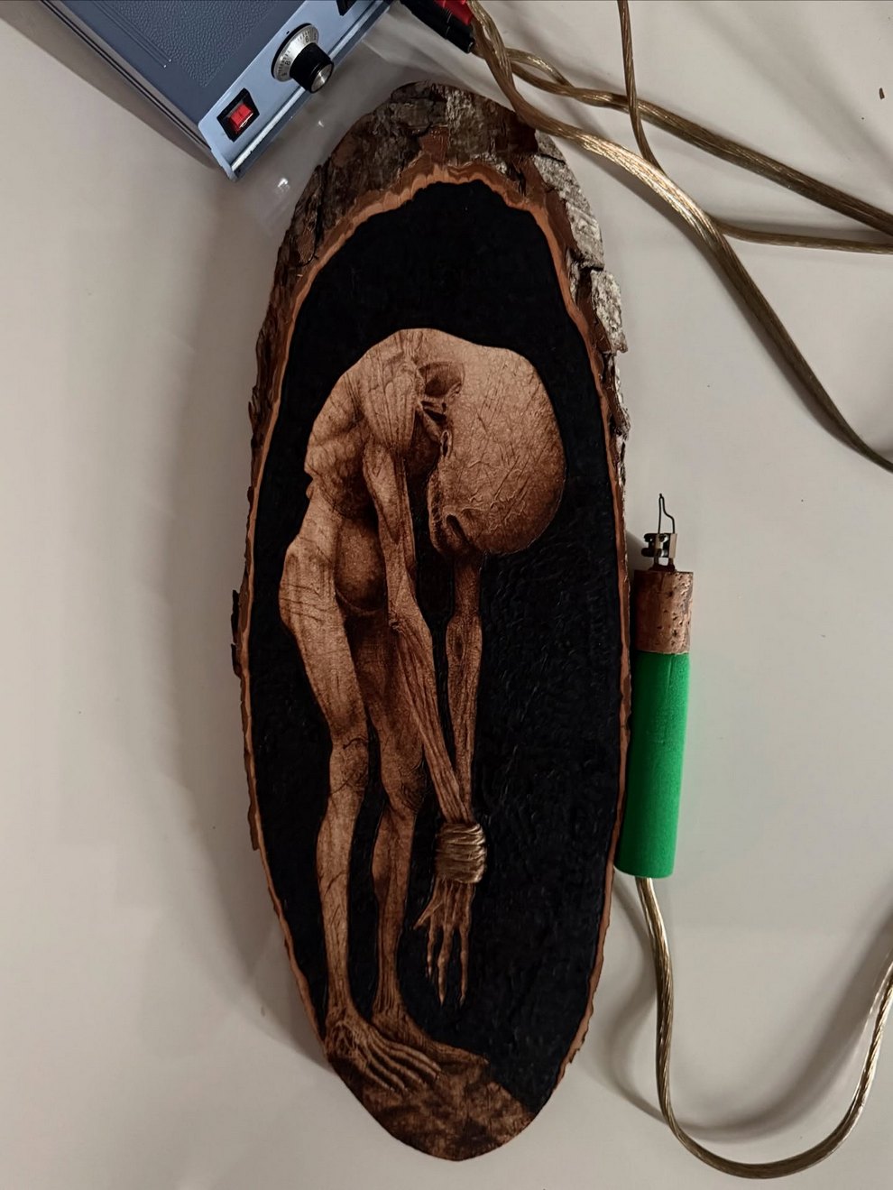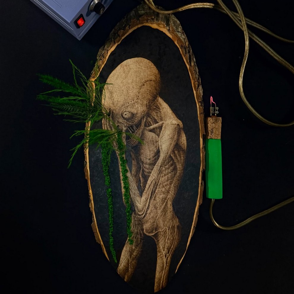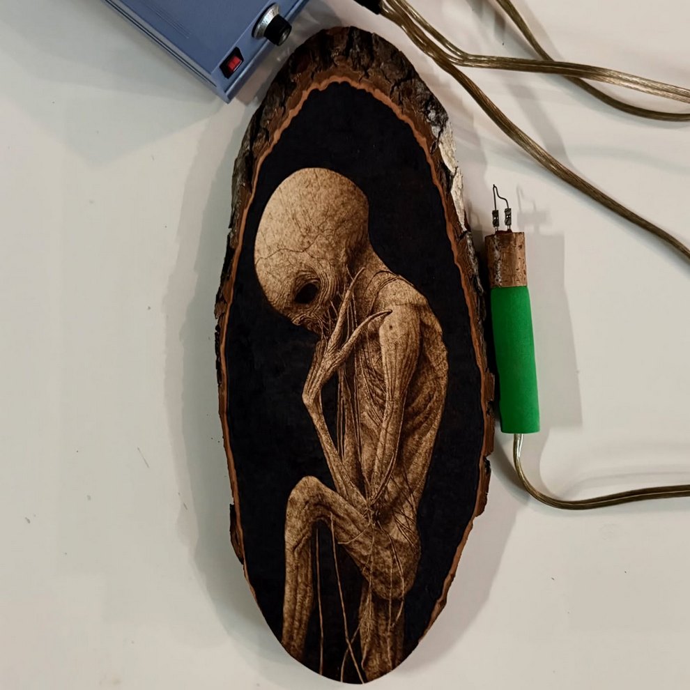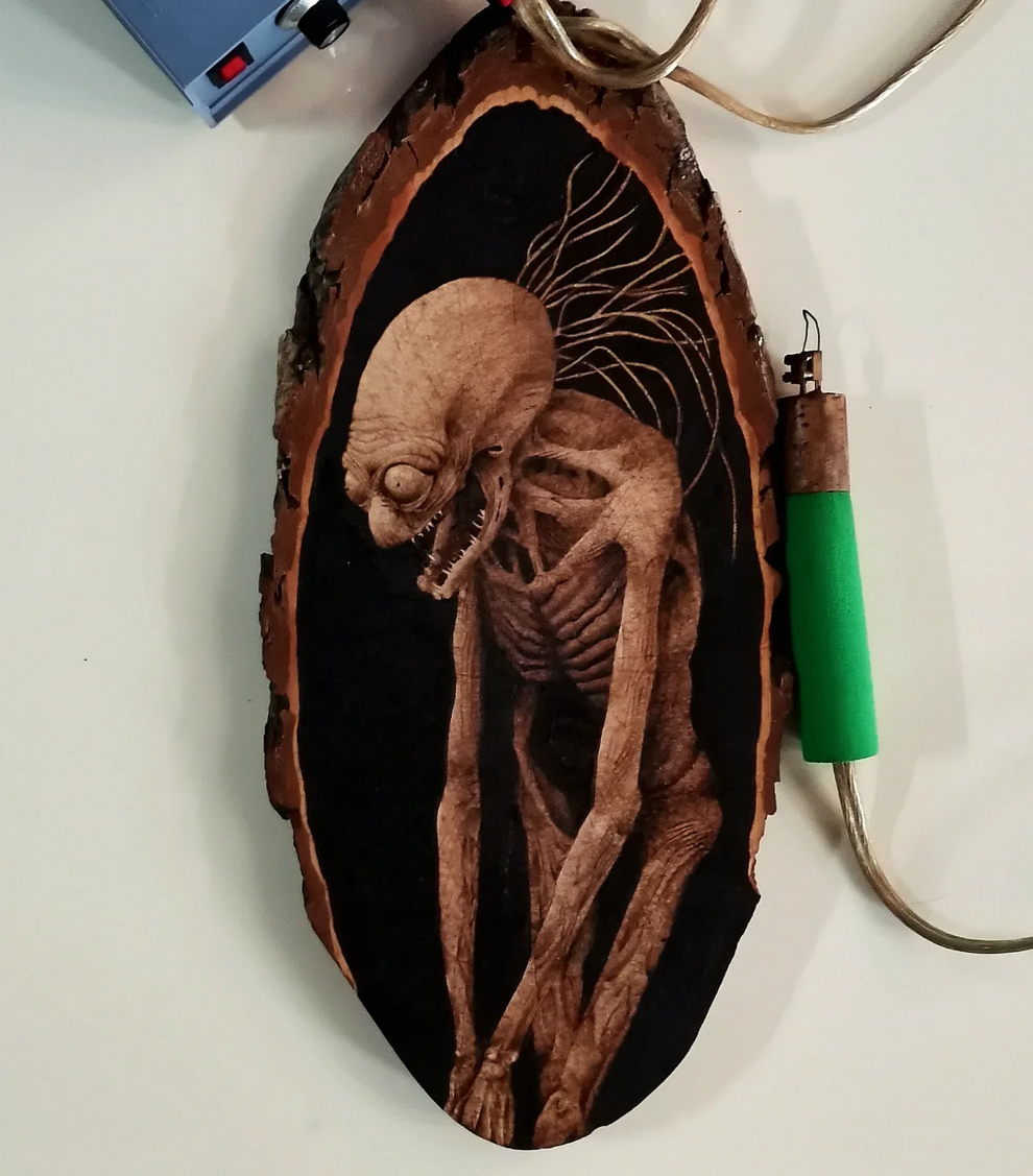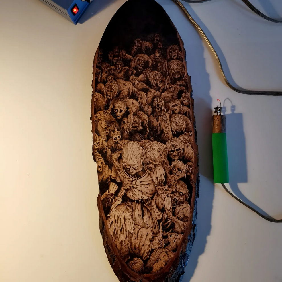 Robb’s work is heavily rooted in “dark art,” utilizing the monochromatic, sepia-toned nature of pyrography to create moody and psychological imagery. His portfolio frequently explores themes of identity, isolation, and the human psyche, with pieces questioning concepts like “how long can you wear a mask before you forget who you truly are”. By varying the heat and pressure of his wood-burning tools, he achieves stunning gradients and hyper-detailed shading, transforming raw wood panels into haunting, surreal portraits and conceptual illustrations.