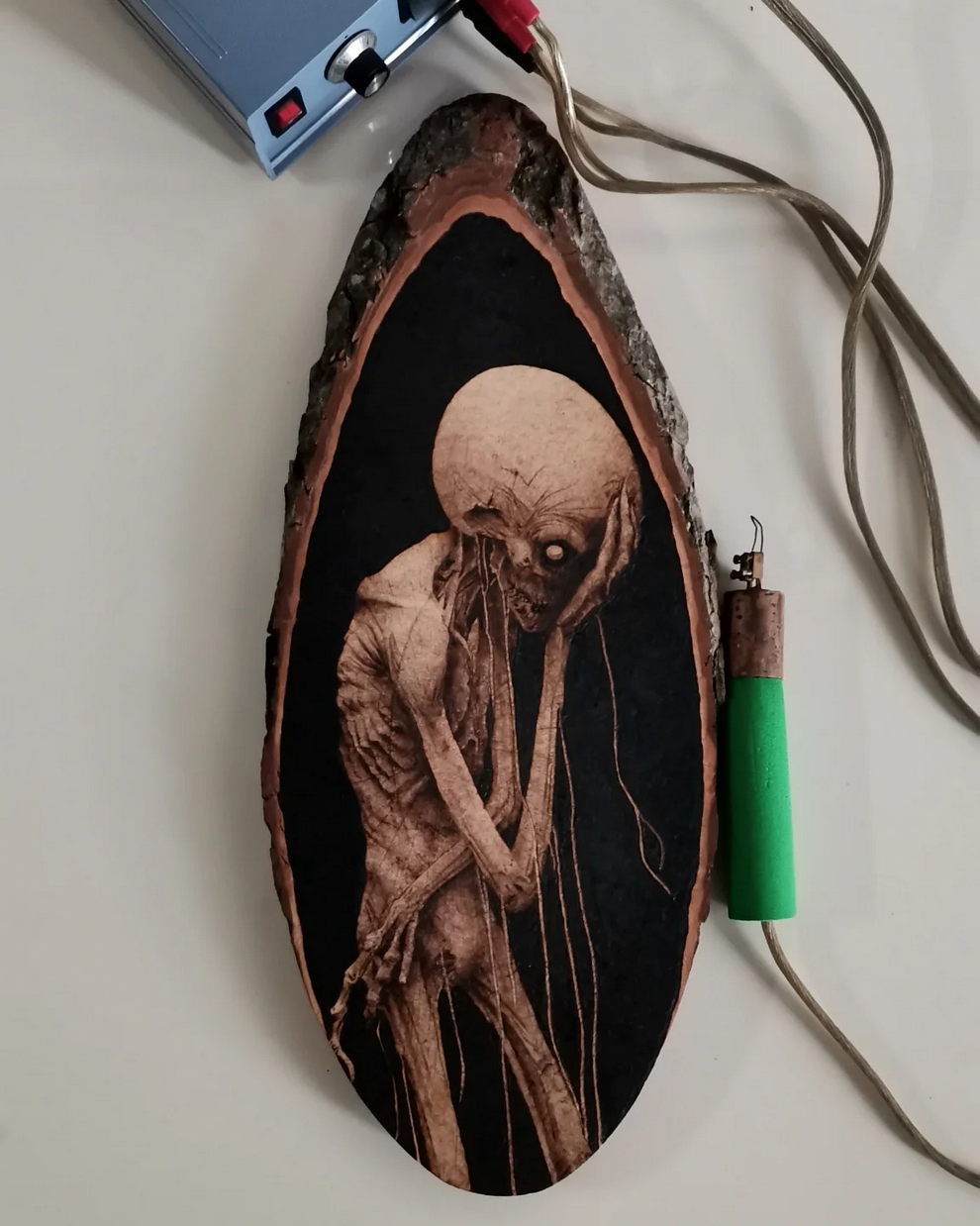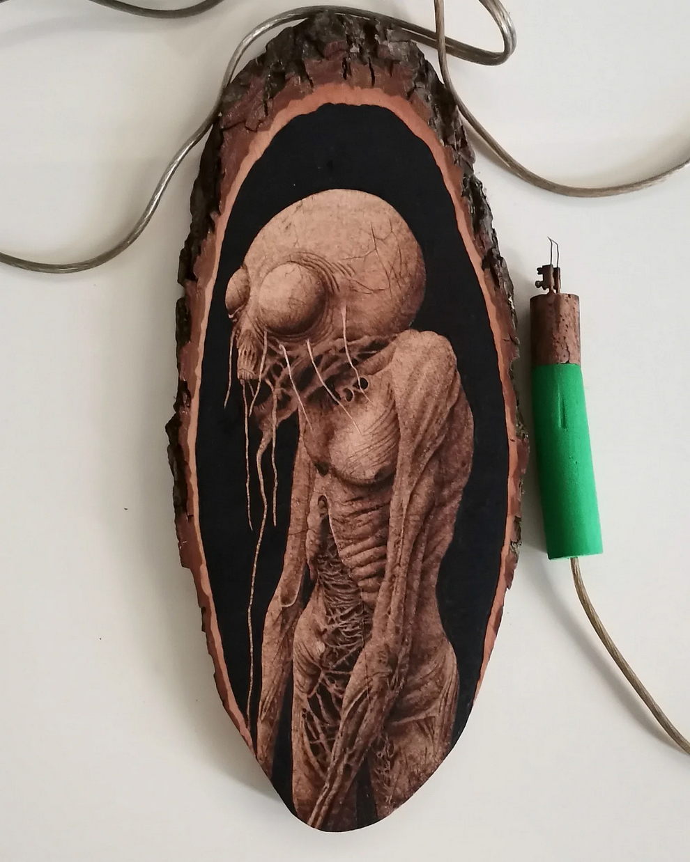 This Artist Creates Dark Wood-Burned Illustrations Exploring Identity And The Human Psyche