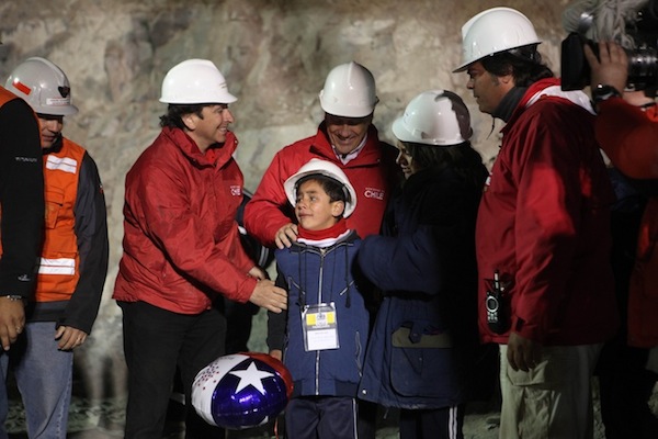 President Sebastian Piñera and Minister of Mining Laurence Golborne stand with the family of Florencio Avalos while waiting for the trapped miner to exit inside the Phoenix 2 rescue capsule at the San Jose mine near Copiapo, Chile on October 12, 2010.