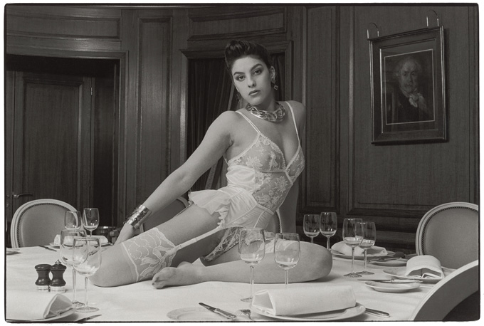 Limited edition black and white fine art retro glamour-erotic photographic print featuring French model Coryne. Photographed in Paris in 1988, the dark haired model poses on a private dining table dressed in classic white lace lingerie including body, stockings and garter belt.
