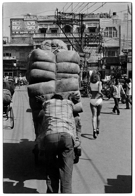 Amongst the bustling backdrop of Delhi, this limited edition black and white photographic print captures a female with toned long legs walking briskly, almost breaking in to a jog, through the traffic wearing only white knickers and vest and sexy high heels.