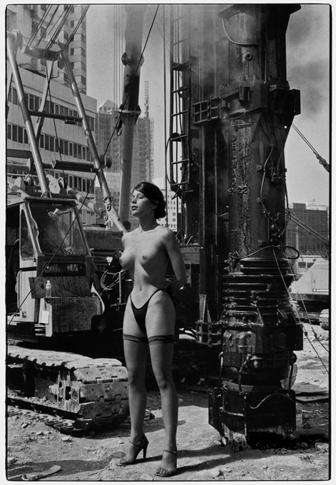 Industrial power and human beauty connect in this erotically charged fine art black and white photography print of a woman, standing serenely in front of a smog filled backdrop of industrial vehicles and machinery on location in Macau.