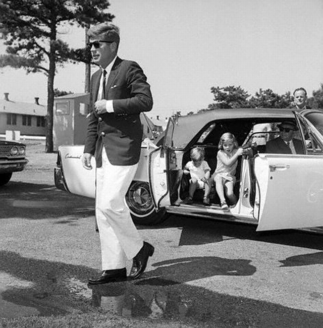 12 Aug 1963, Cape Cod, Massachusetts, USA — President John F. Kennedy walks out of a car with his children Caroline and John Jr. following him toward a hospital where they are visiting his wife and the children’s mother, Jacqueline Kennedy. — Image by © Bettmann/CORBIS