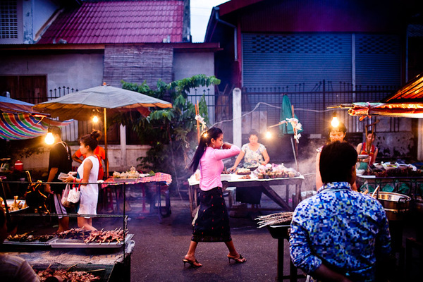 Street vendors set up their table at the Ban Anou night market in Vientiane.